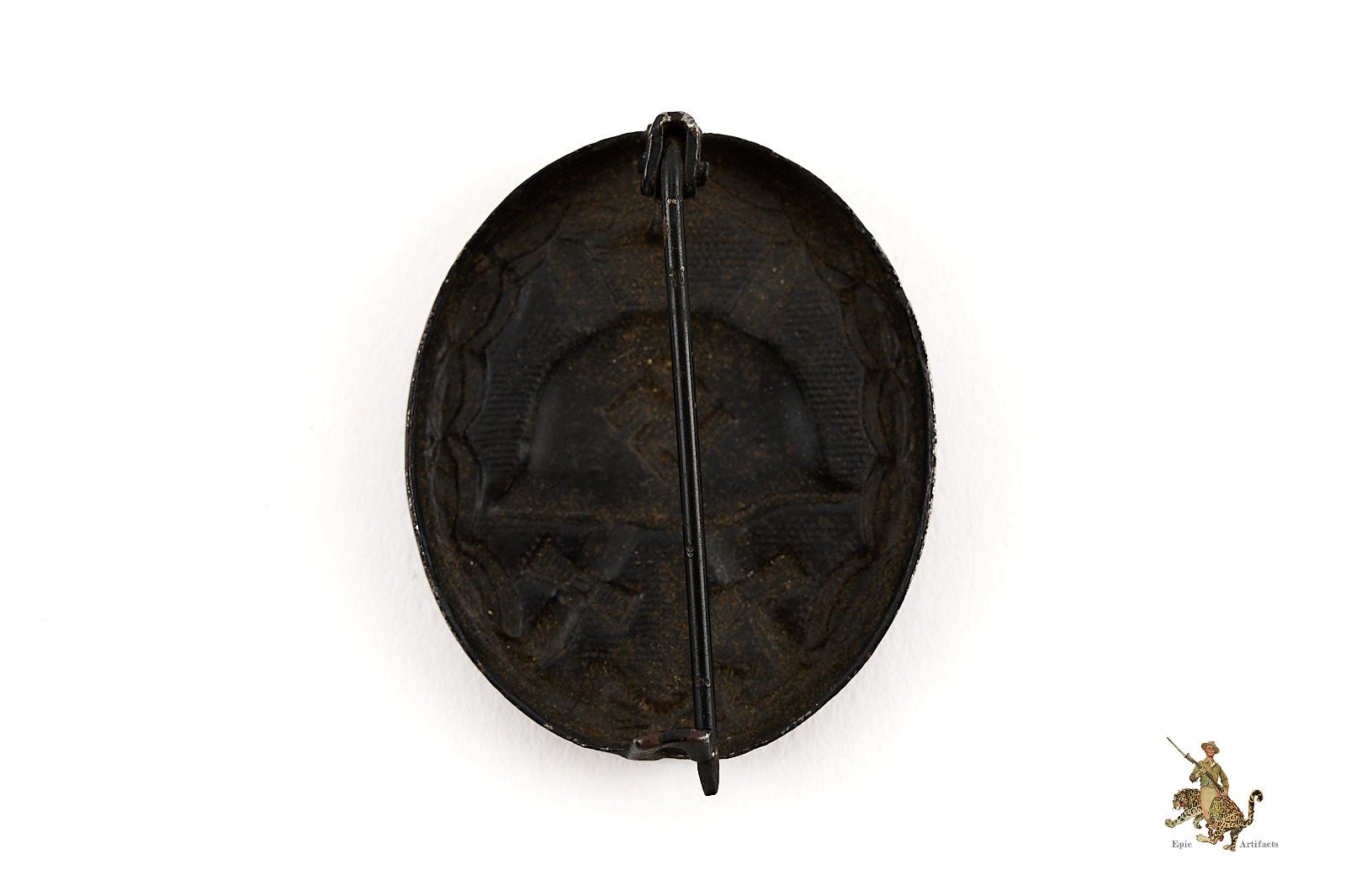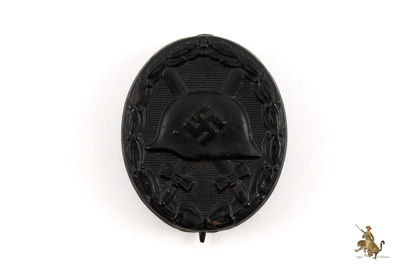 Historical Description: The German Wound Badge was instituted during the First World War to recognize those wounded in the conflict. It was designed using a World War One style Imperial German helmet as the main motif. The helmet was set on top two crossed swords against a pebbled background and surrounded by a laurel leaves wreath.