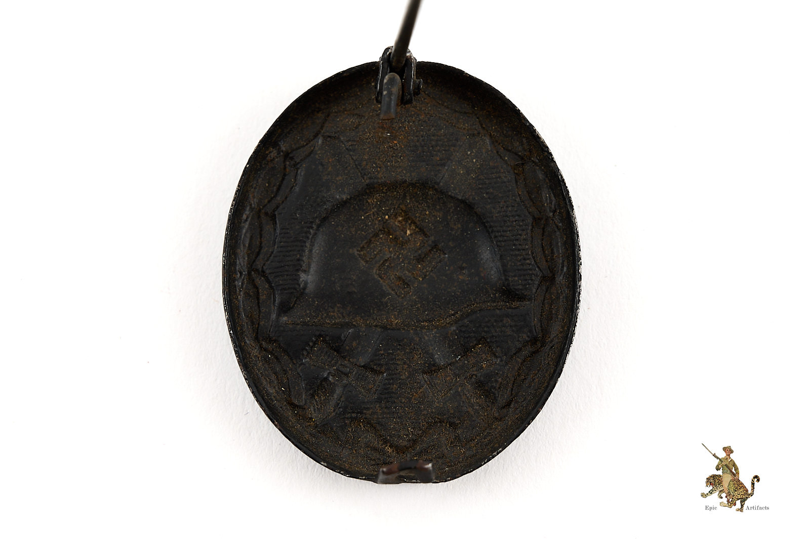 Product Description: This steel stamped Black Wound Badge is a nice piece, in excellent condition. It is made of stamped steel. The obverse shows minor wear, but retains most of the original, factory applied black enamel painted finish. All of the original detail is intact, with well-defined pebbling to the fields behind the helmet and crossed swords. The reverse of this steel Black Wound Badge shows a light, uncleaned, dusty patina with minor corrosion in the recesses, with most of the original painted finish still intact. The hardware setup is intact and functional, with a round wire pin and catch, and a sheet metal hinge. Badge is unmarked. This piece is totally untouched, and all original. It’s a great example of this iconic Wehrmacht award, and is in excellent + condition.