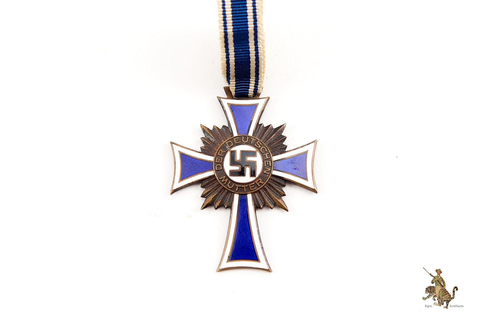 Product Description: An attractive and well-preserved example of the Ehrenkreuz der Deutschen Mutter in Bronze, instituted to honor mothers of four or more children for their contribution to the German nation. This decoration features the traditional blue and white enamel cross with gilt sunburst backing and central inscription, “Der Deutschen Mutter.”
