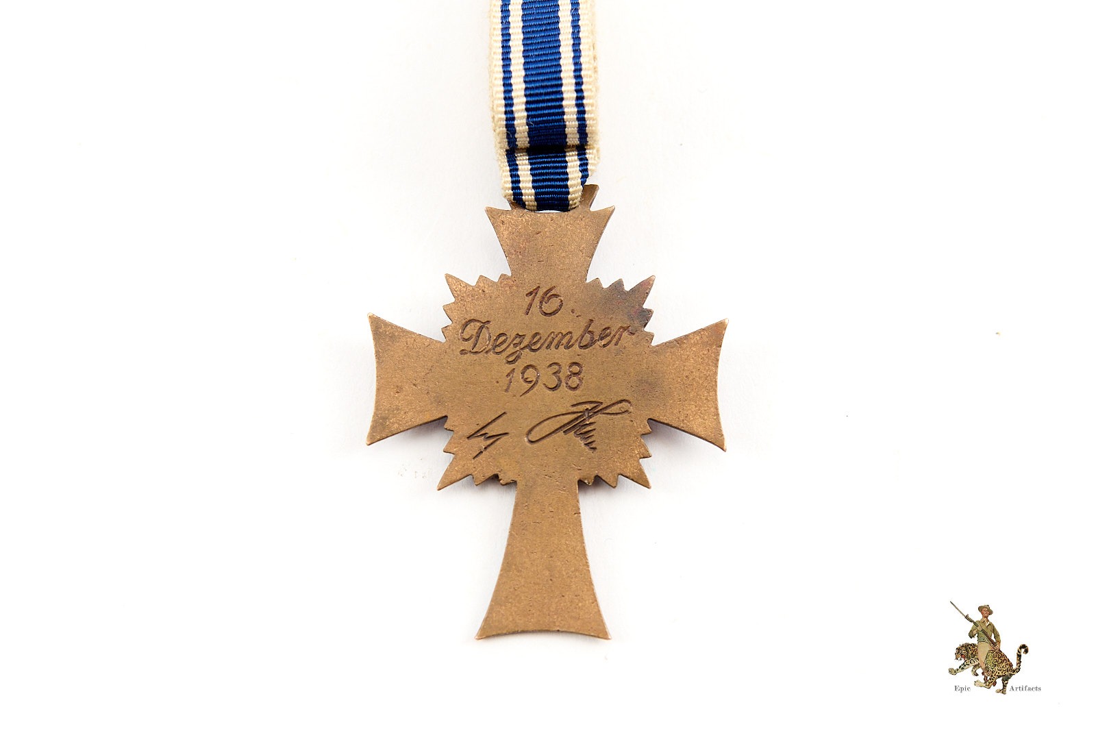 Historical Description: The Nazi plans for the expansion of the German Reich required a robust and growing German population. To encourage this, the Nazis created a number of propaganda campaigns to encourage families to have more children. Beginning in 1934, Mother’s Day became an official holiday in Germany. In 1938, with preparations for war underway, Hitler created a special civil award for mothers in German families. The official name for this award was “Ehrenkreuz der deutschen Mutter” (Honor Cross of the German Mother” but it was often more simply referred to as the “Mutterkreuz,” or Mothers Cross. The design of the cross was created by Franz Berberich, and it was made in three classes. To earn the lowest grade, in bronze, a mother had to have four children. Mothers of at least six children were awarded the silver grade, and the highest level, in gold, was awarded to mothers of eight or more children. The awards themselves were never maker marked. The bronze and silver grades were awarded in simple paper packets, while to gold award came in a presentation case. The back of the very first Mothers Crosses, made in 1938 or early 1939, was inscribed “Das Kind adelt die Mutter” (The child ennobles the mother) and bore a facsimile signature of Adolf Hitler. Later versions featured a slightly different signature, and instead of a motto, were dated “16. Dezember 1938,” the date the award was instituted. The first awards of the Mothers Cross took place on Mother’s Day, in May 1939. The cross was worn on a neck ribbon, and a miniature version was also available. They were awarded until 1945.