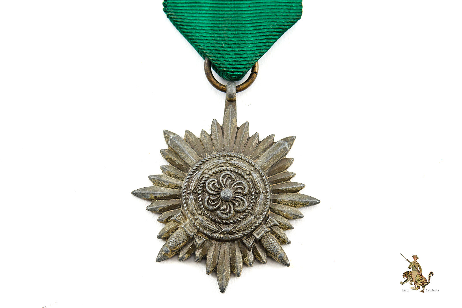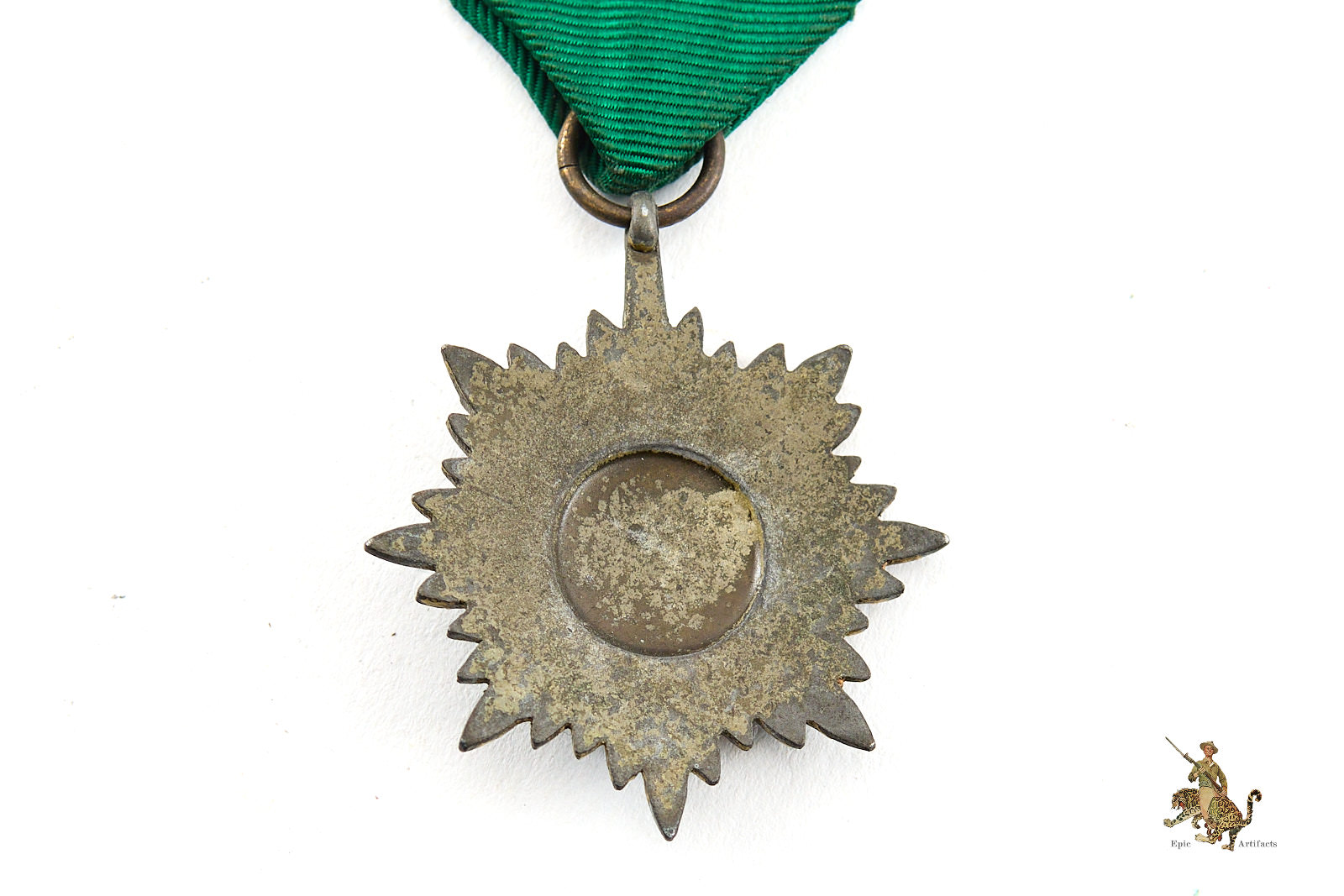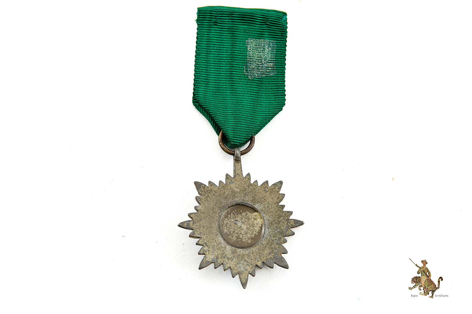 This particular medal is unmarked. The medal is accompanied by an approximately 4-inch length of its original ribbon, correctly rendered in green, as prescribed for the 2nd Class Bronze variant. The ribbon has some glue or other residue on back from being mounted in some way.
