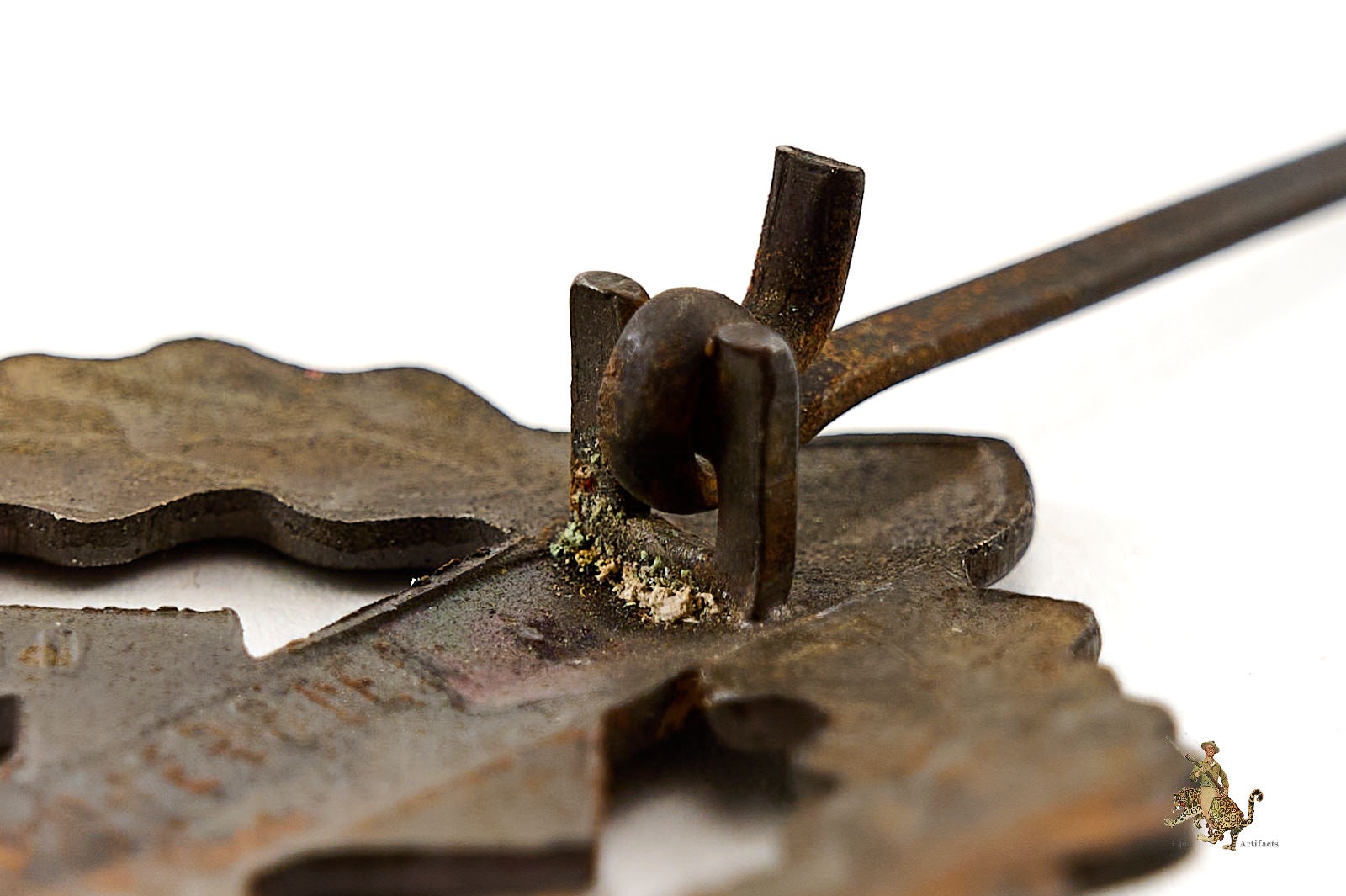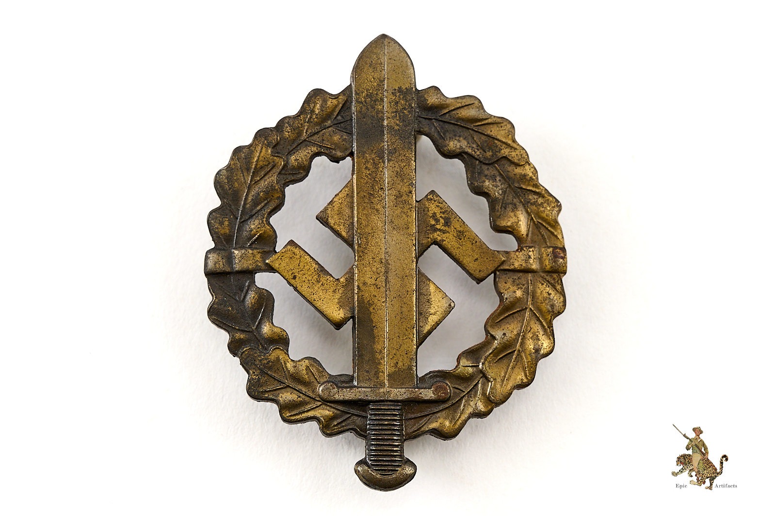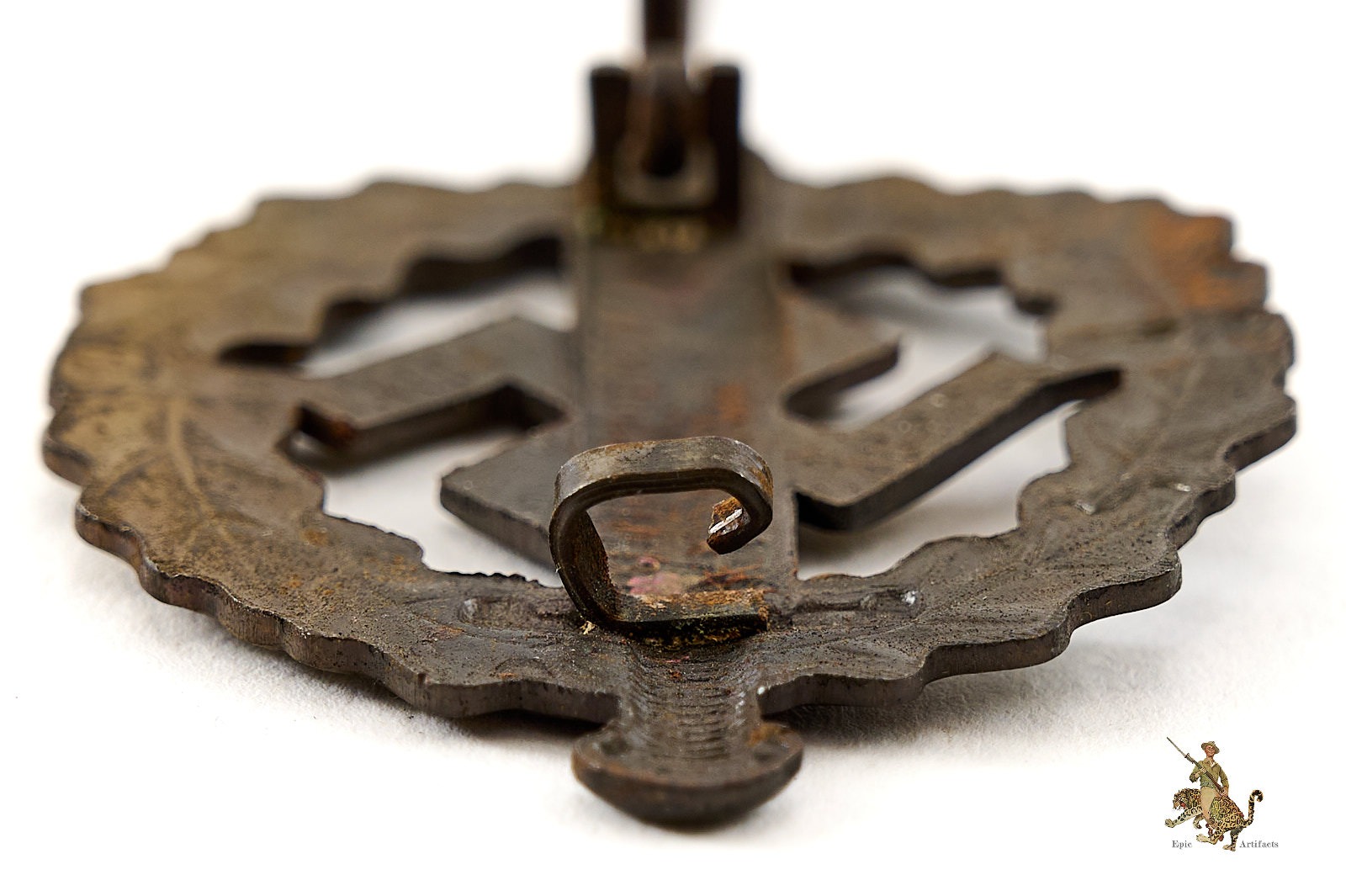 Product Description: This Bronze SA Sports Badge is an honest original piece, showing very little wear and aging. The original bronze finish is mostly intact. The obverse retains lots of original detail and is truly lovely. It’s well marked, with typical SA Property wording, as well as the name of the maker, the firm of Werner Redo Saarlautern. The original reverse hardware setup is intact, functional, and shows no sign of any repair. This badge has pleasant character and remains in excellent condition.
