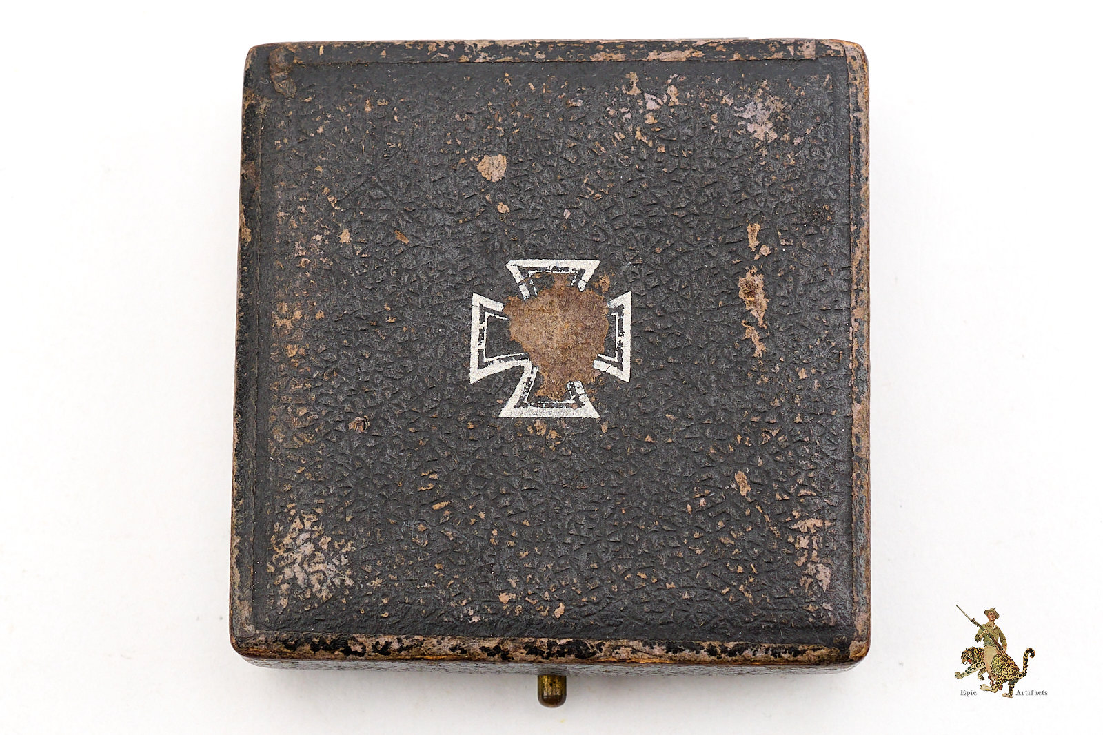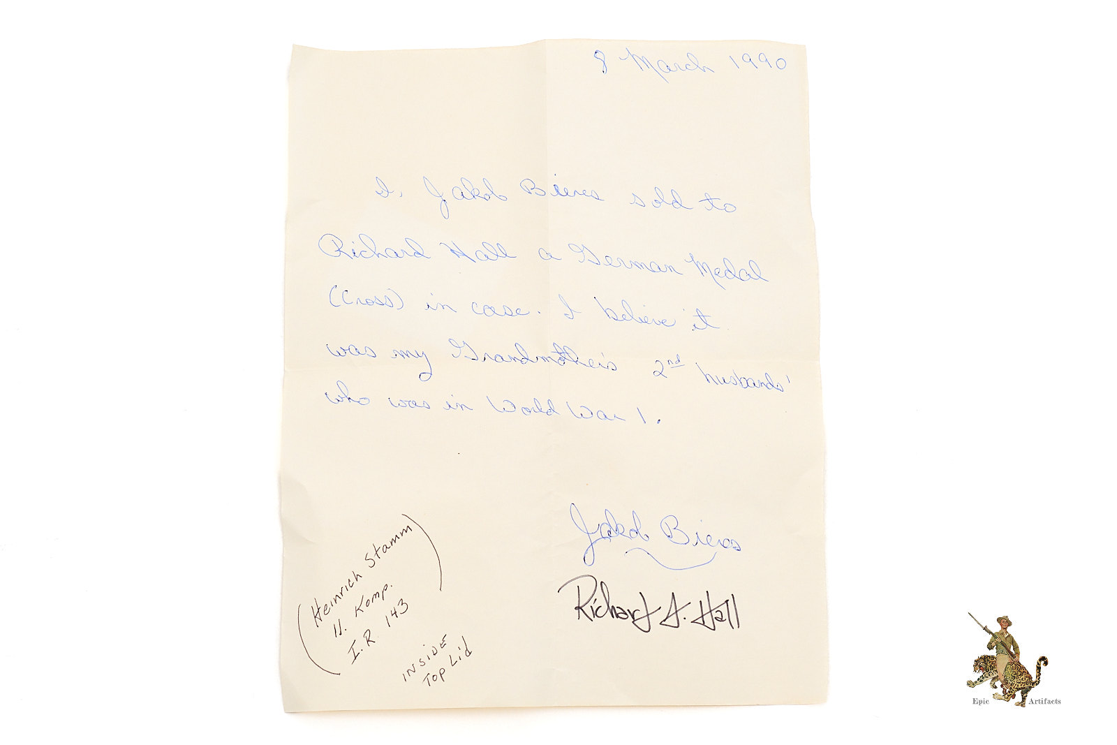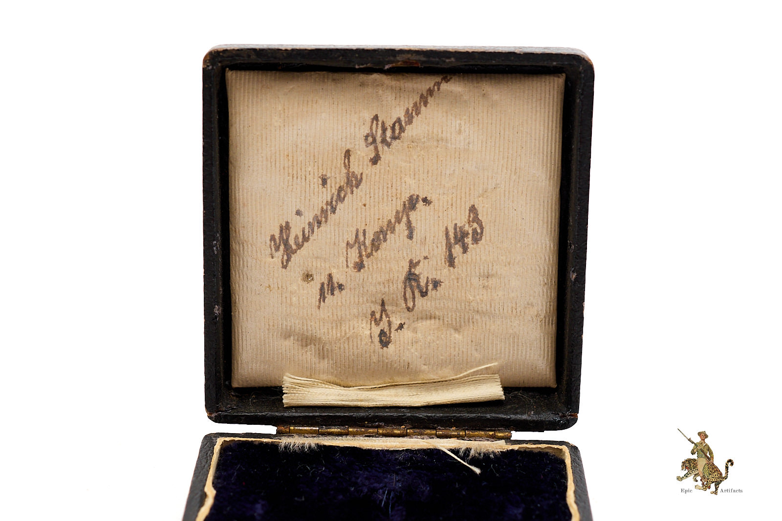 The original Case is included and has the name “Heinrich Stamm – II Komp – I.R. 143” hand written in the top of the case. The case shows wear and flaws, but the original silver Iron Cross is visible on the top of the case. The latch mechanism is in good working order. The inner cloth of the case remains in excellent condition, but the small bit of cloth that originally concealed the hinge is missing. This set comes with a hand written note with original acquisition date of 1990 that will be included.