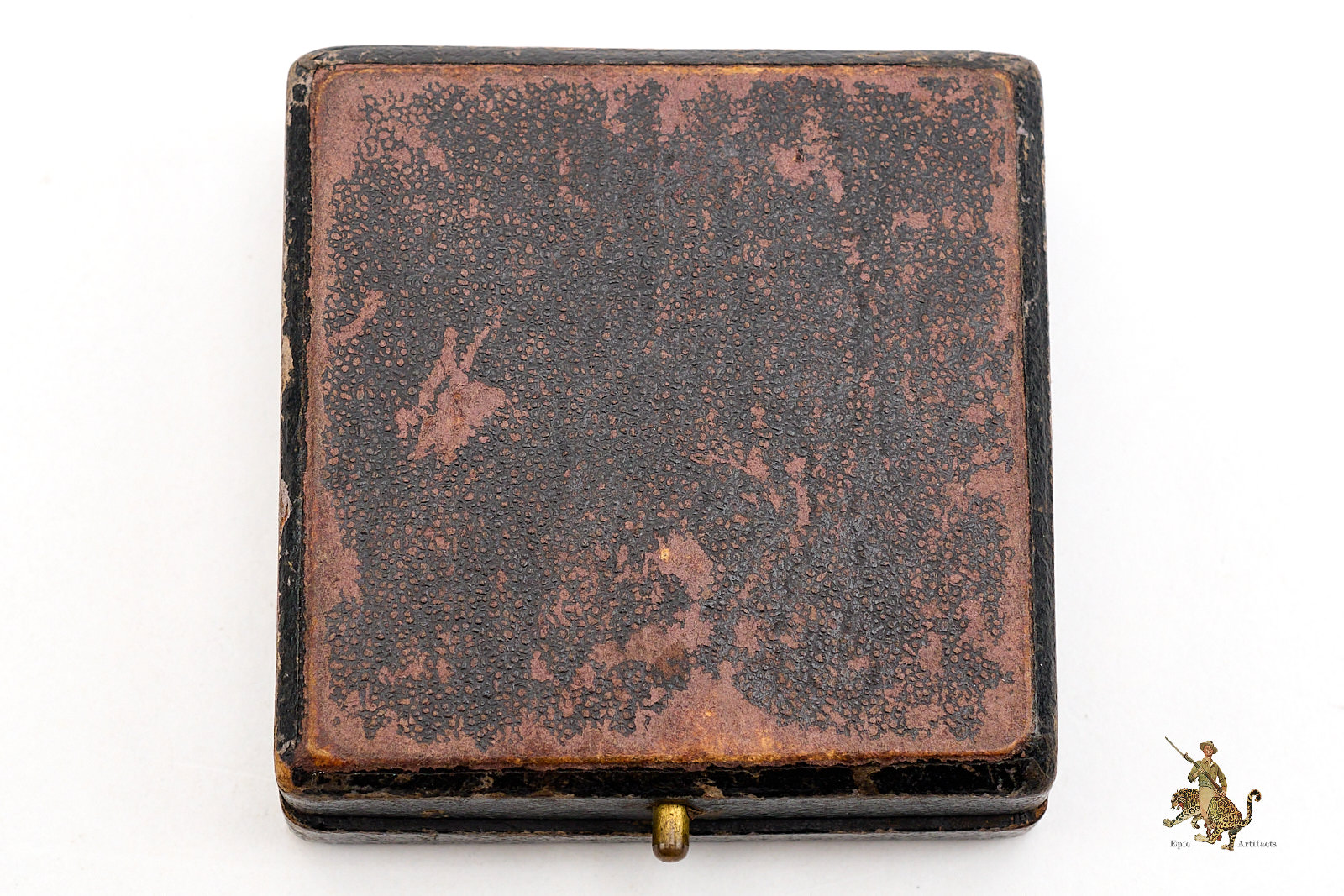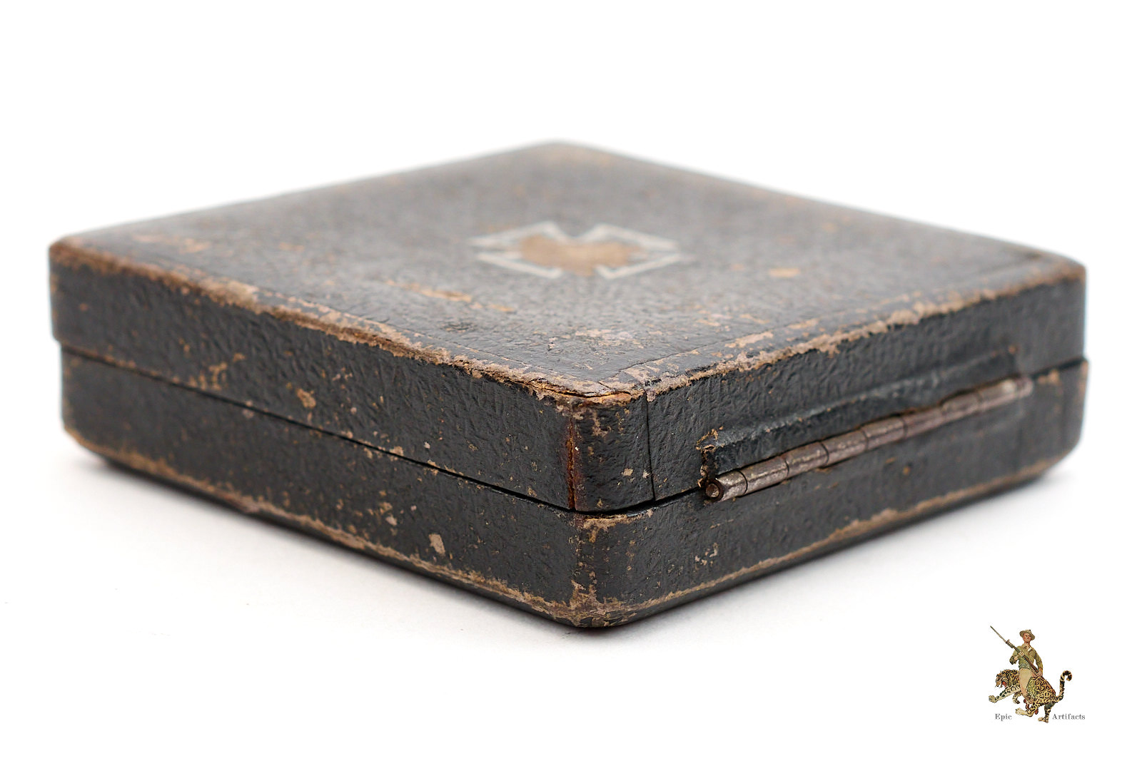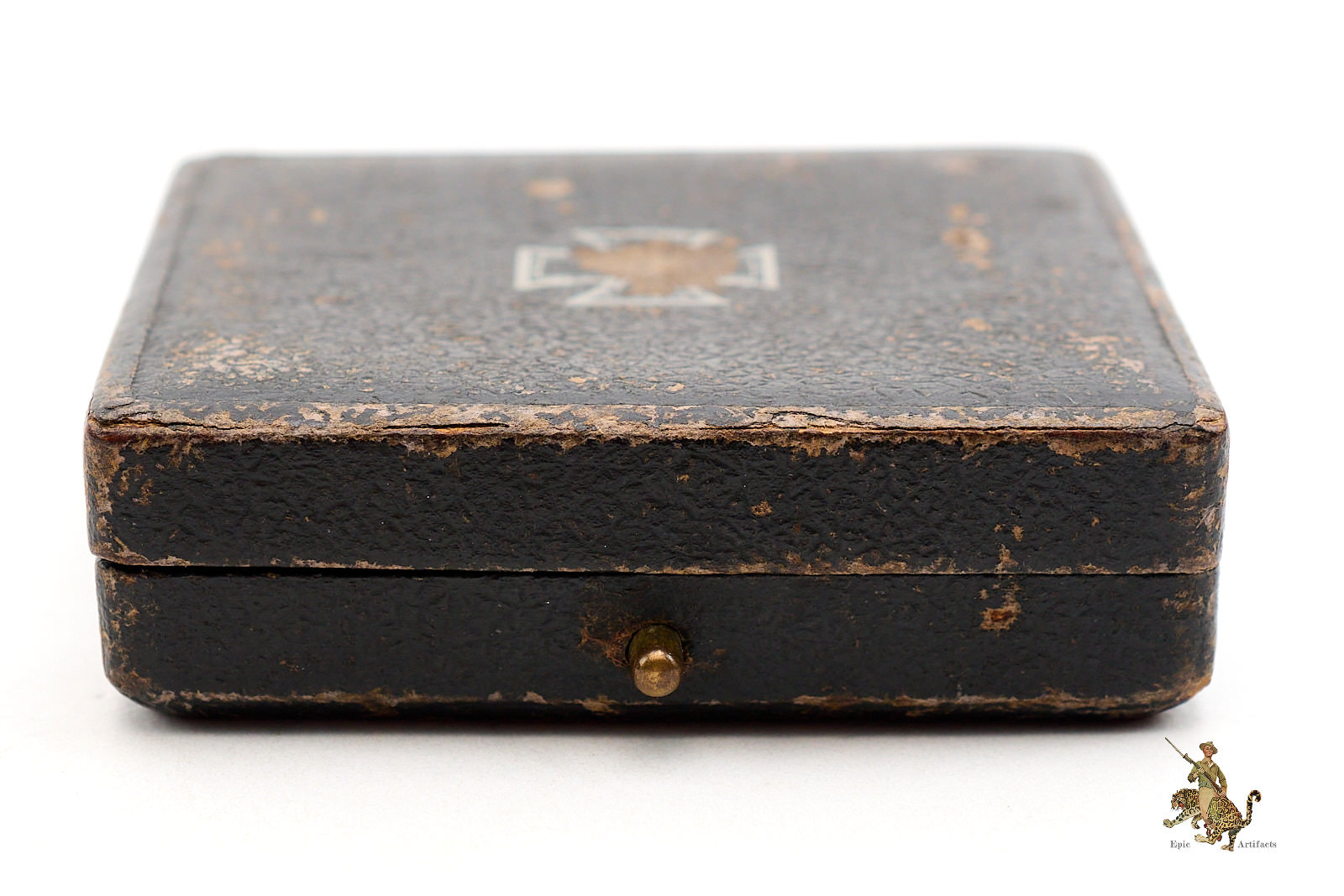 The original Case is included and has the name “Heinrich Stamm – II Komp – I.R. 143” hand written in the top of the case. The case shows wear and flaws, but the original silver Iron Cross is visible on the top of the case. The latch mechanism is in good working order. The inner cloth of the case remains in excellent condition, but the small bit of cloth that originally concealed the hinge is missing. This set comes with a hand written note with original acquisition date of 1990 that will be included.