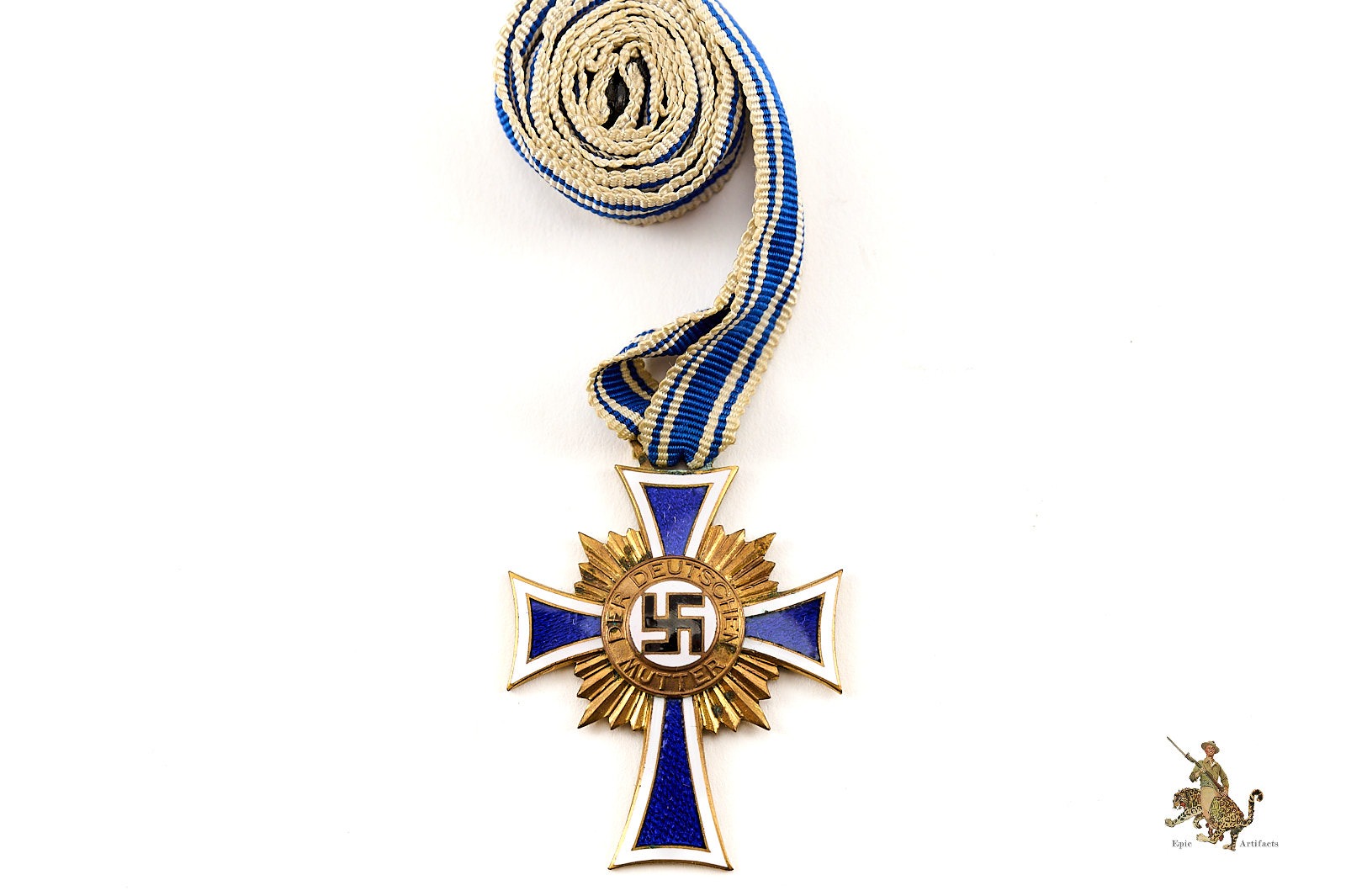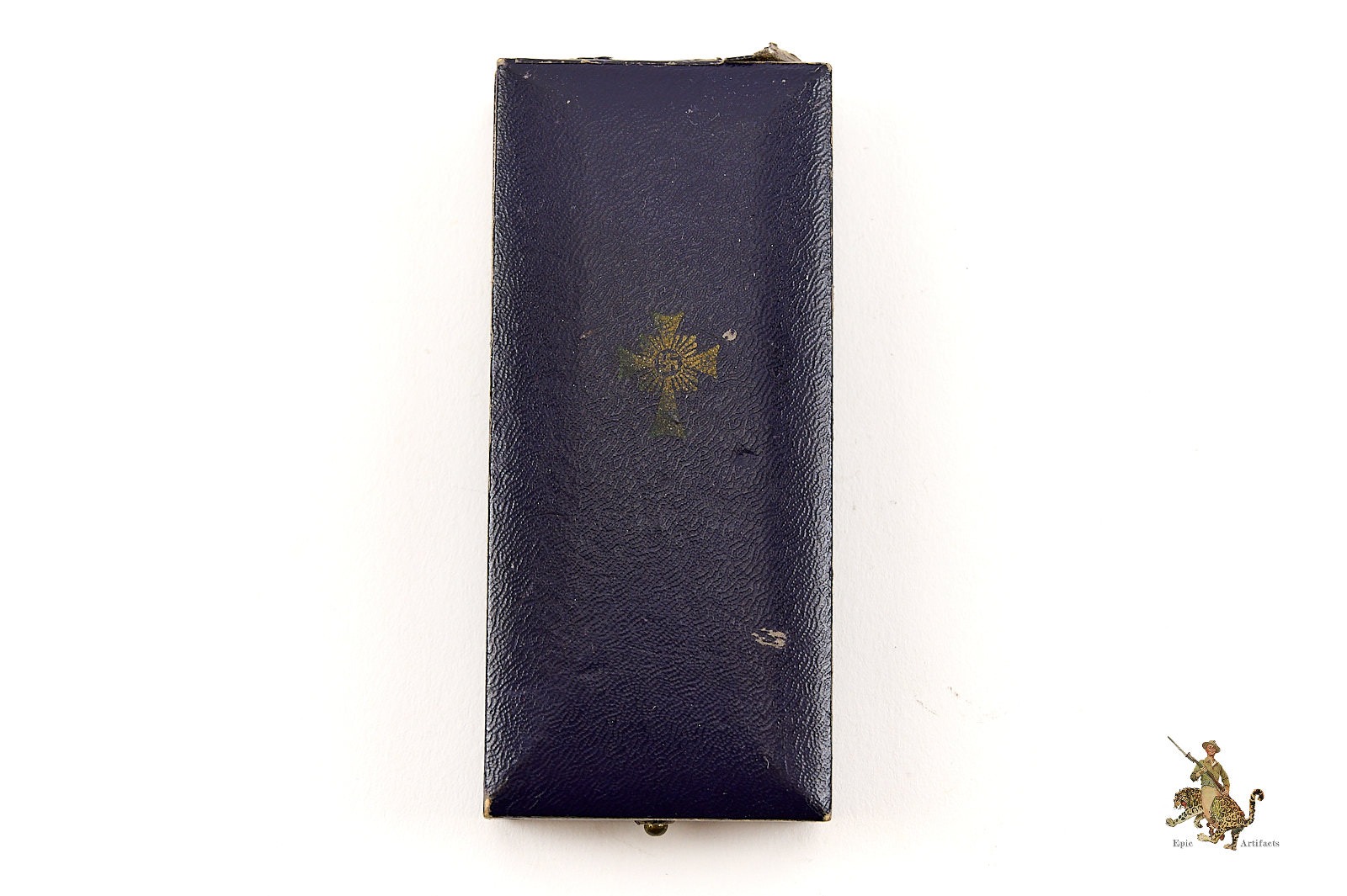 Historical Description: The Nazi plans for the expansion of the German Reich required a robust and growing German population. To encourage this, the Nazis created a number of propaganda campaigns to encourage families to have more children. Beginning in 1934, Mother’s Day became an official holiday in Germany. In 1938, with preparations for war underway, Hitler created a special civil award for mothers in German families. The official name for this award was “Ehrenkreuz der deutschen Mutter” (Honor Cross of the German Mother” but it was often more simply referred to as the “Mutterkreuz,” or Mothers Cross. The design of the cross was created by Franz Berberich, and it was made in three classes. To earn the lowest grade, in bronze, a mother had to have four children. Mothers of at least six children were awarded the silver grade, and the highest level, in gold, was awarded to mothers of eight or more children. The awards themselves were never maker marked. The bronze and silver grades were awarded in simple paper packets, while to gold award came in a presentation case. The back of the very first Mothers Crosses, made in 1938 or early 1939, was inscribed “Das Kind adelt die Mutter” (The child ennobles the mother) and bore a facsimile signature of Adolf Hitler. Later versions featured a slightly different signature, and instead of a motto, were dated “16. Dezember 1938,” the date the award was instituted. The first awards of the Mothers Cross took place on Mother’s Day in May, 1939. The cross was worn on a neck ribbon, and a miniature version was also available. They were awarded until 1945.