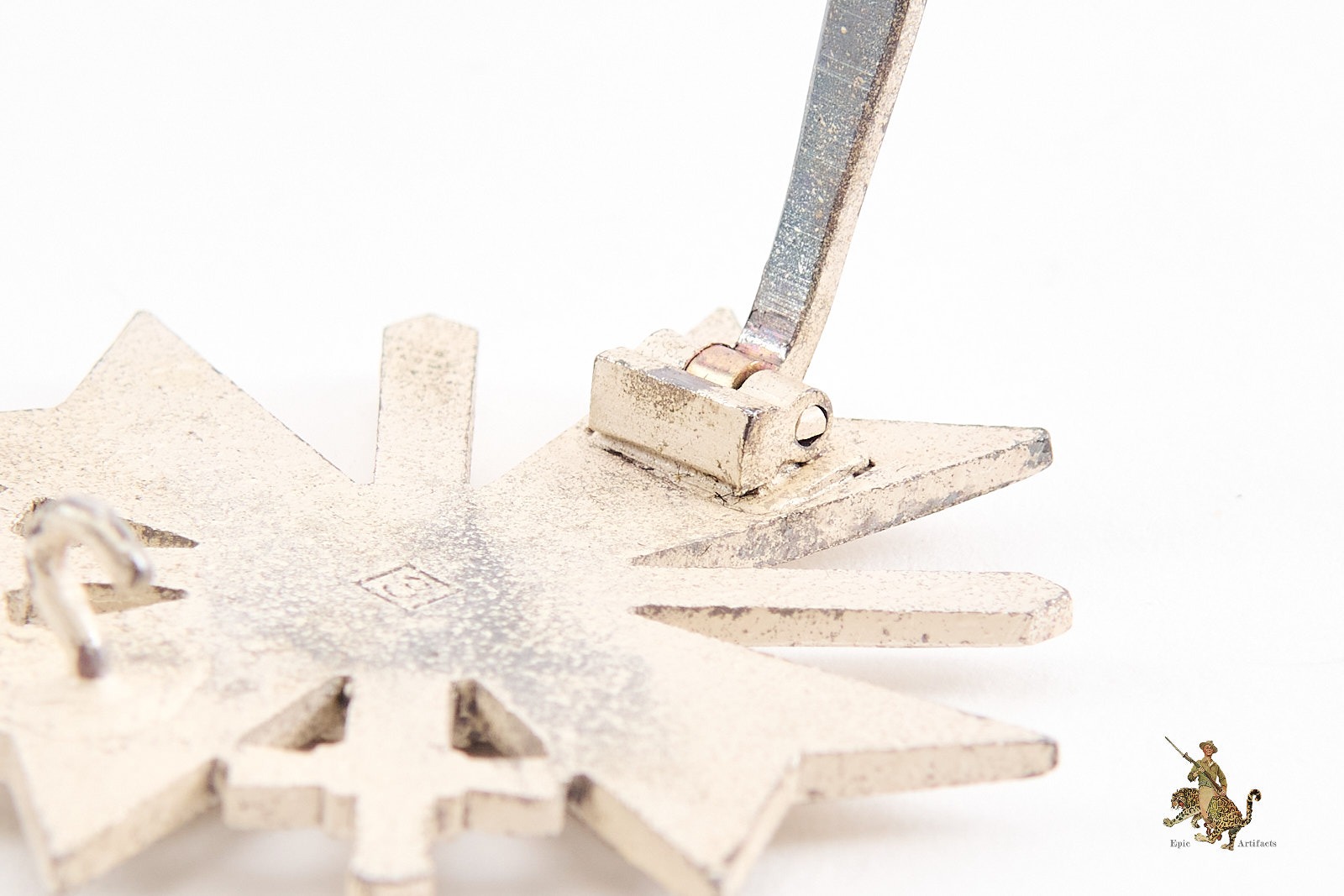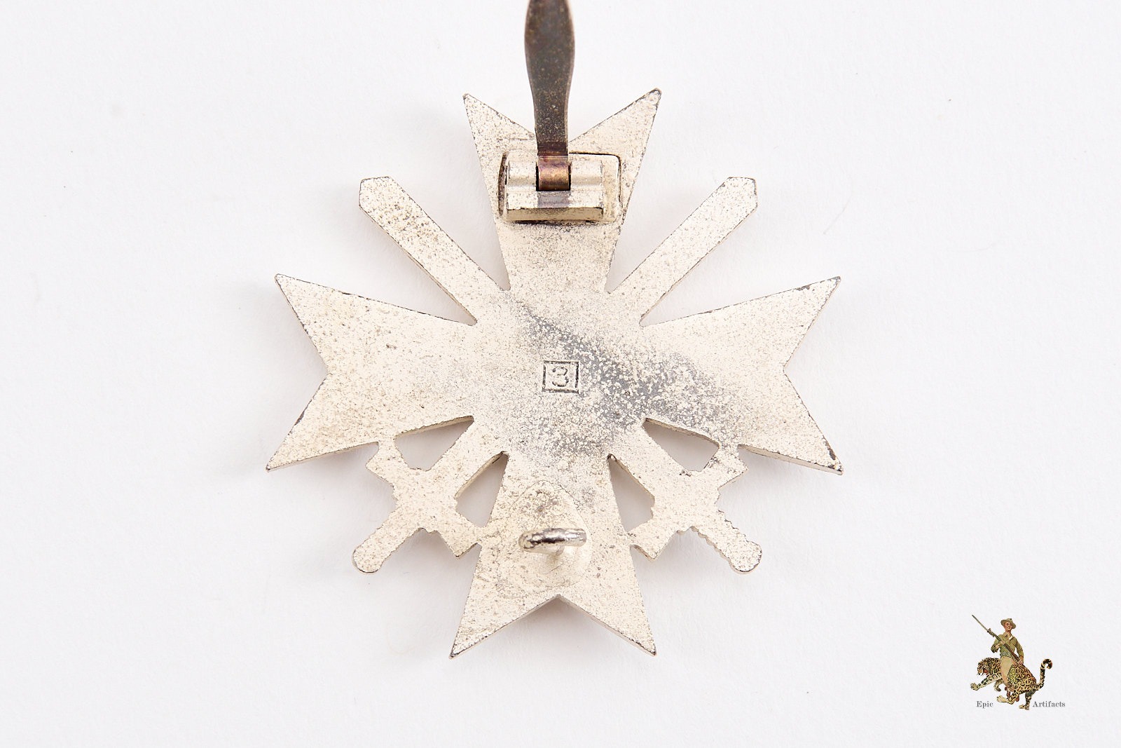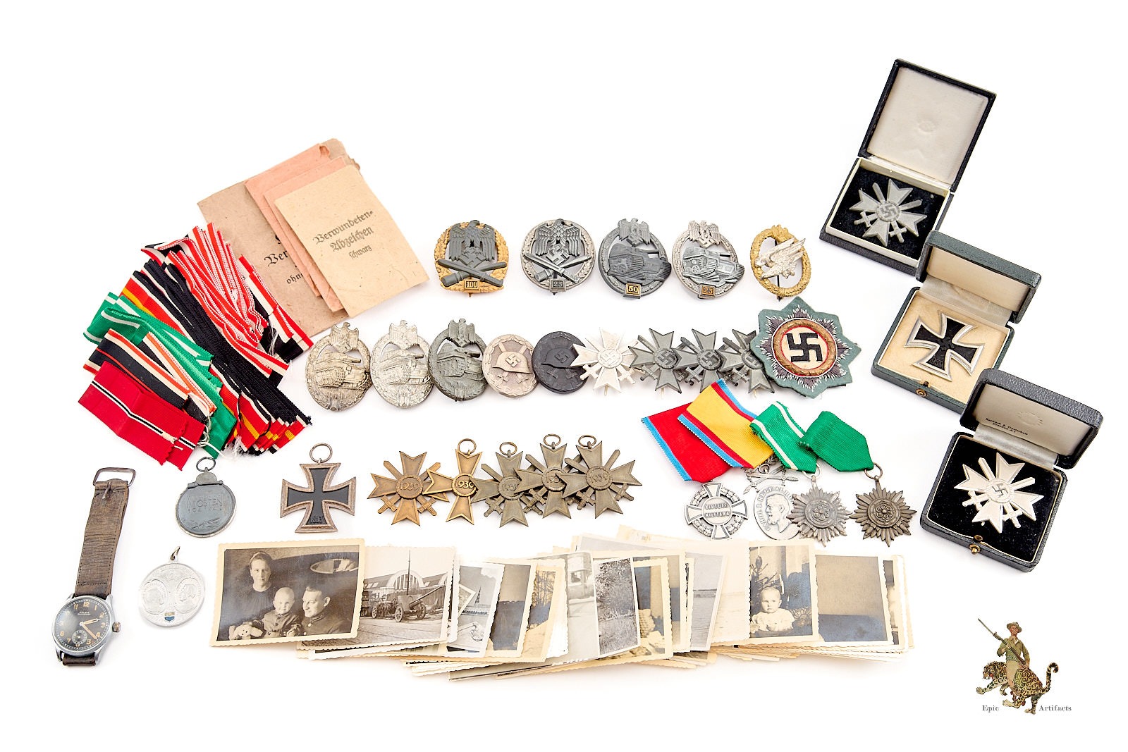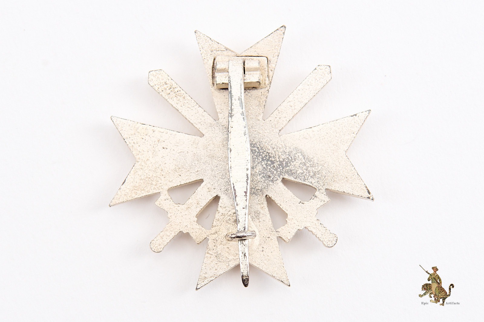Historical Description: The War Merit Cross (Kriegsverdienstkreuz) was likely the most commonly awarded WWII German decoration. In 1939, when Hitler reinstituted the Iron Cross, he did not reinstitute the non-combatant version that had existed in previous wars. As a successor to this, he created the War Merit Cross. It existed in the same grades as the Iron Cross- there was the War Merit Cross 1st Class, War Merit Cross 2nd Class, and Knights Cross of the War Merit Cross. The 2nd Class award was a medal suspended from a ribbon, coated with a bronze finish. The War Merit Cross 1st Class was a pin-on award, with a silver finish. The Knights Cross version was worn on a ribbon around the bearer’s neck. The crosses were further differentiated into two categories: with swords, and without swords. The award with swords was for meritorious service in the face of the enemy and could be awarded to soldiers to recognize achievements, that did not merit award of an Iron Cross, as well as to civilians who fought fires during Allied air raids. The award without swords was for furthering the war effort and could also be awarded to soldiers or civilians. Millions of people were eligible for these crosses, from members of the armed services to personnel of the Reichsbahn, the Luftschutz, border guards and customs agents and members of the other various political and paramilitary Third Reich organizations, and even factory workers. Some soldiers used a sort of military humor to mock the War Merit Cross as a “far-from-combat badge” or “field kitchen assault badge.” But many recipients of these crosses wore them with pride.