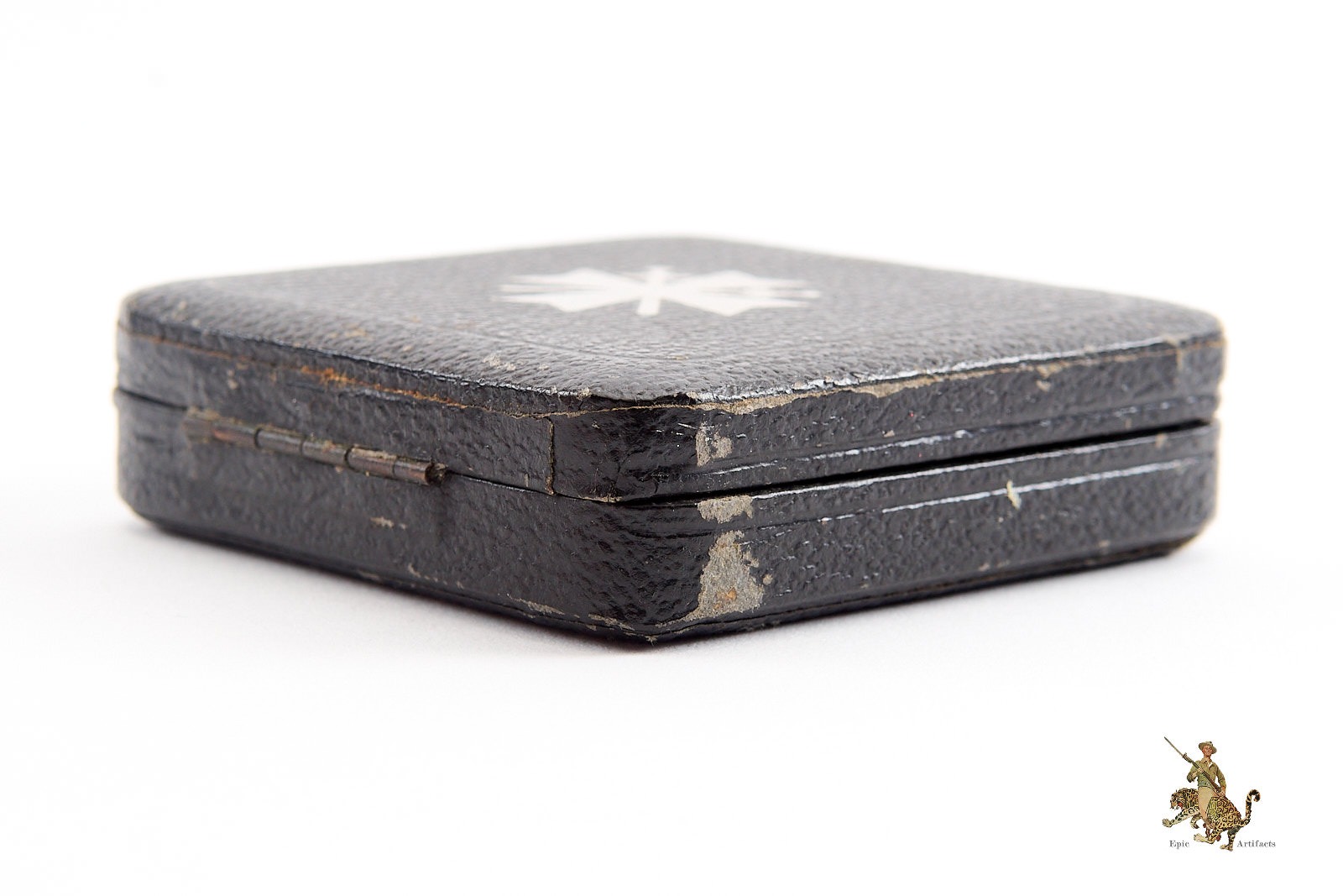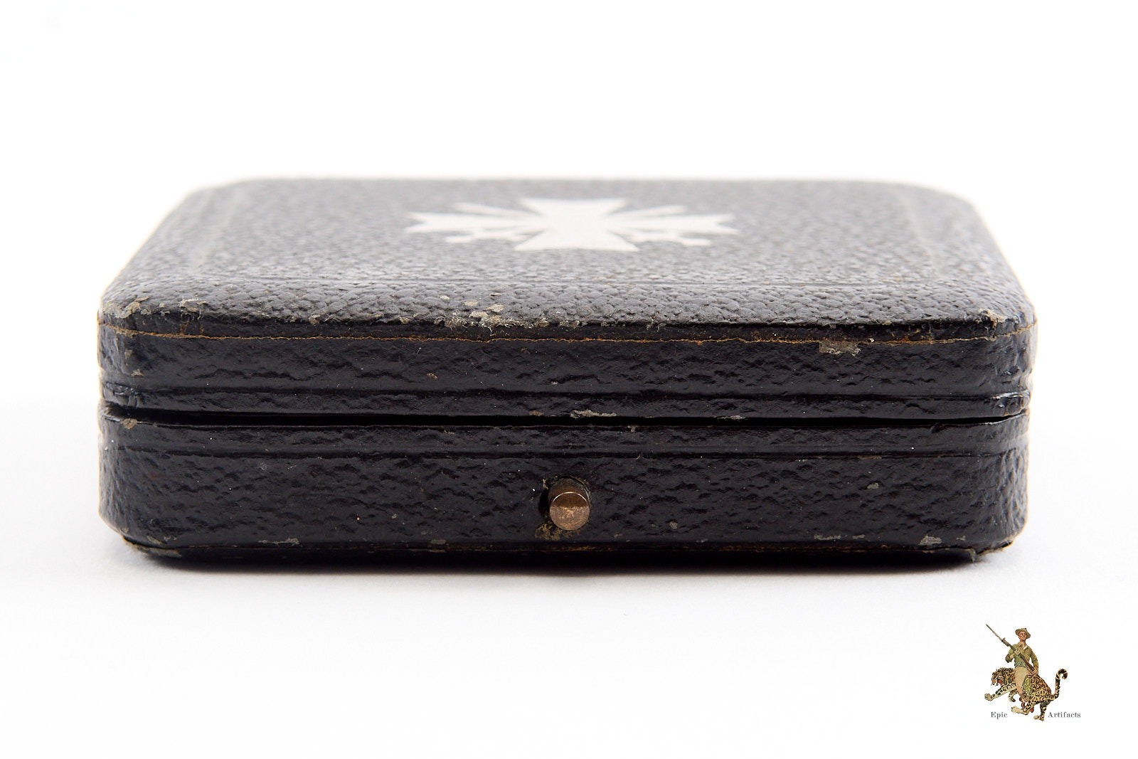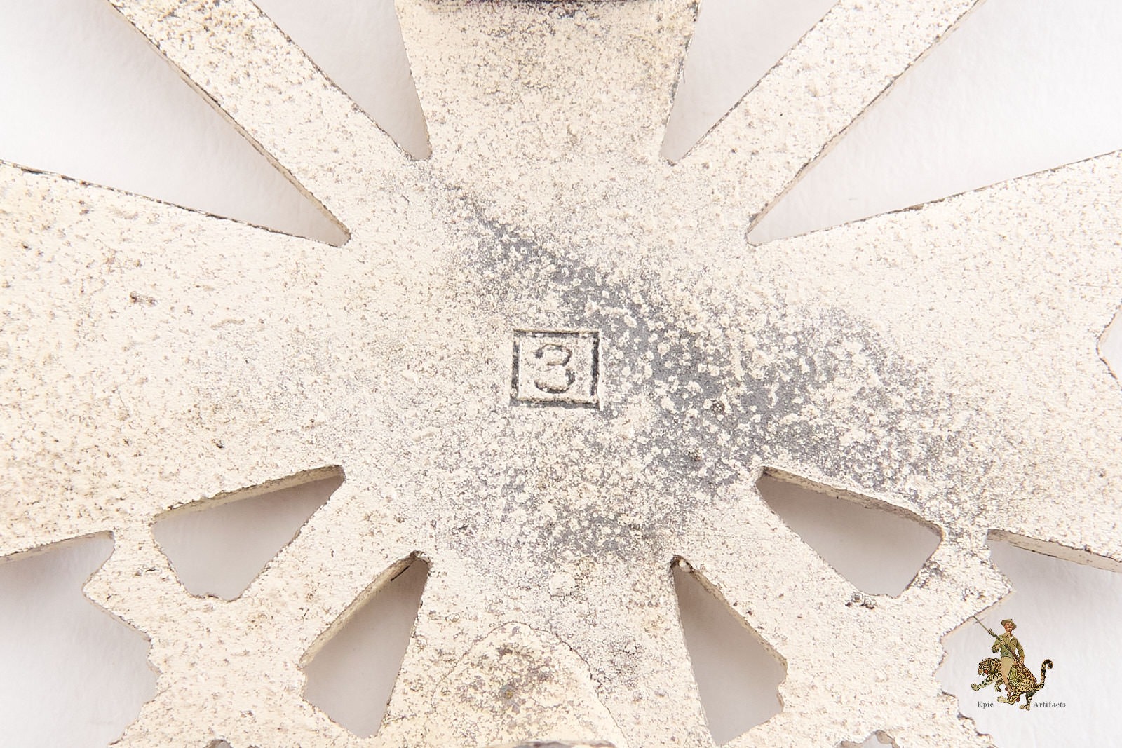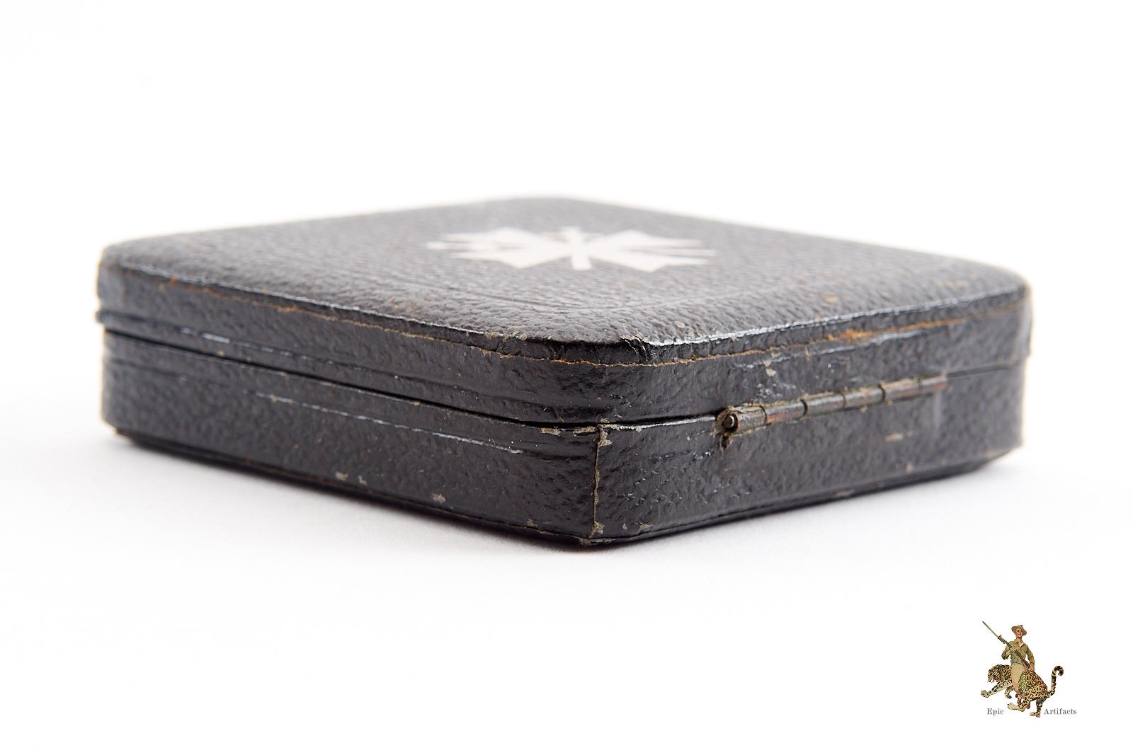 Product Description: This Cased War Merit Cross 1st Class with Swords “3” – Deumer is a very handsome badge. The award is struck from fine zinc, and retains most of the original silver finish. The obverse of the cross shows nice patina with nice silver finish. The reverse of this cross is flat and smooth, with original finish still attached. The hardware setup is functional and all original with soldered block hinge and round wire metal catch. The badge is maker marked with the PKZ code number “3” indicating manufacture by the prestigious firm of Deumer.  Leatherette case is in excellent ++ case with minimal wear mostly to bottom.  This is a great example of a Cased War Merit Cross 1st Class, in excellent ++/NM condition.