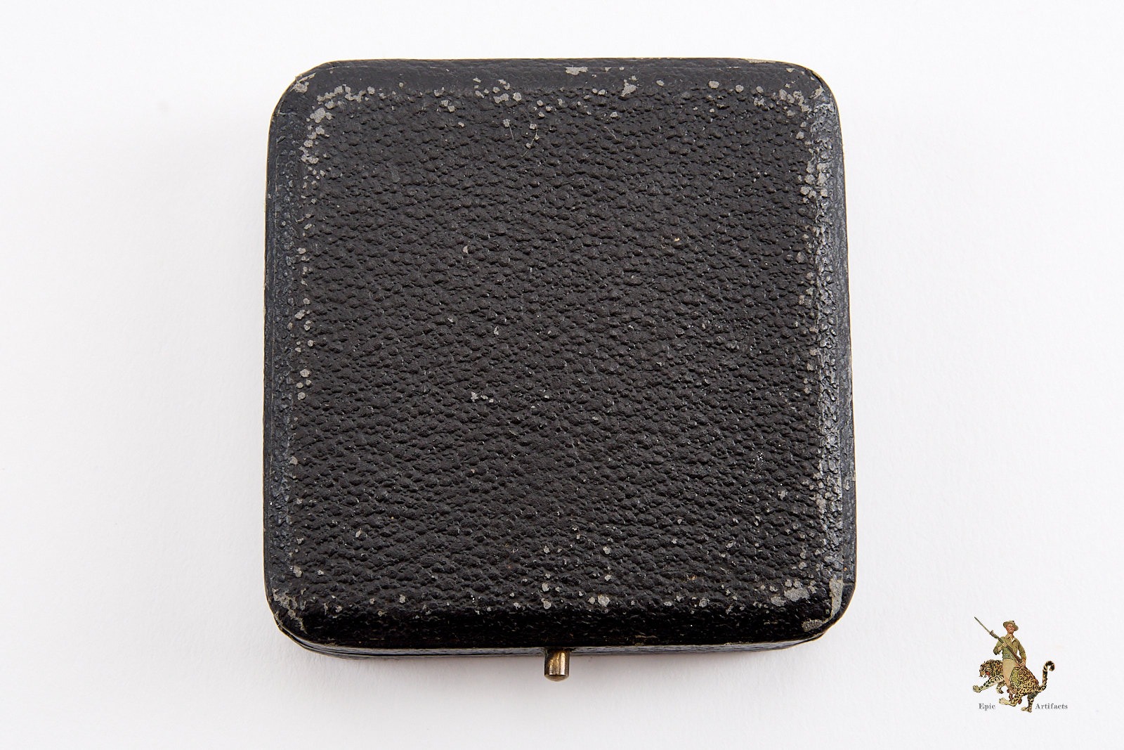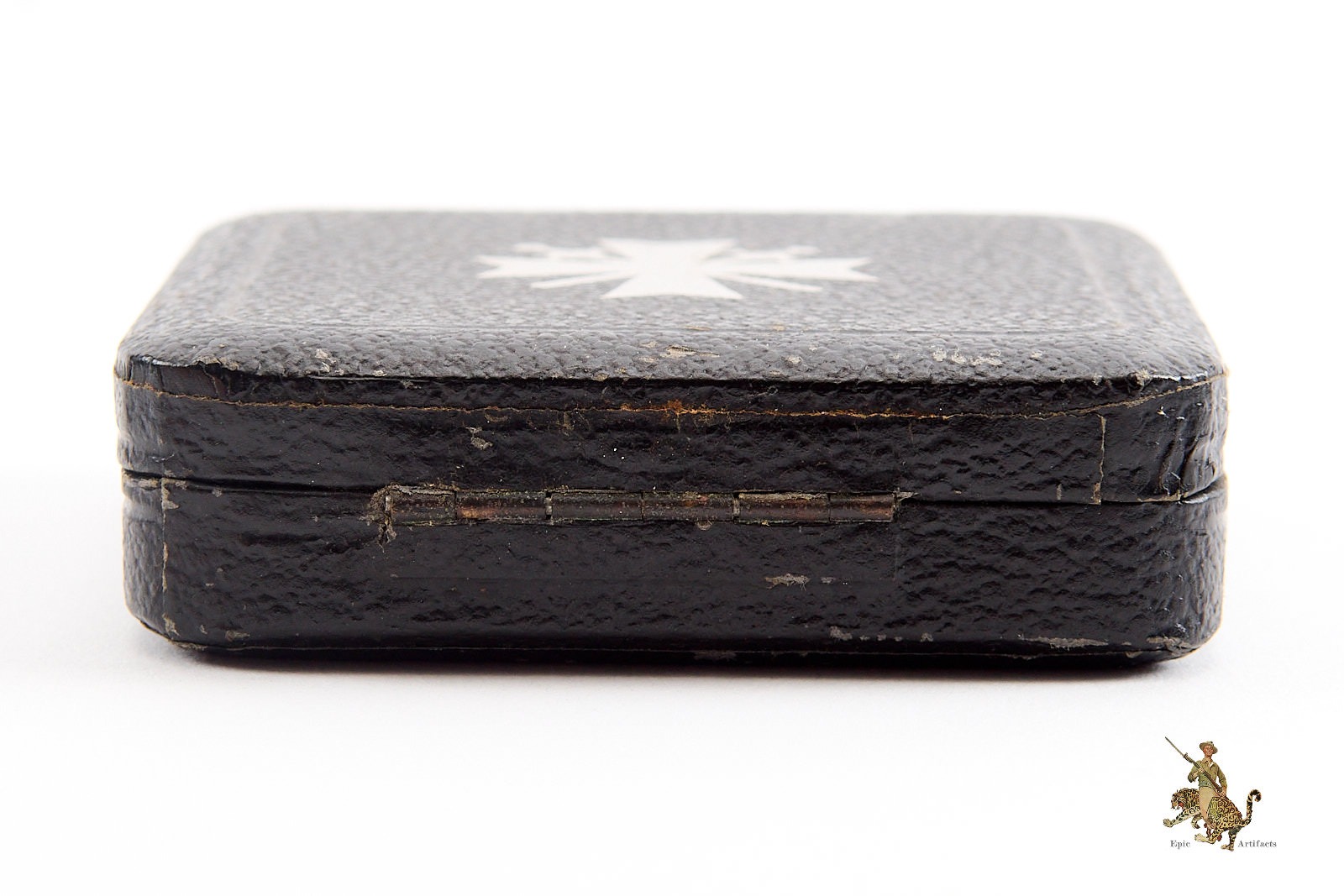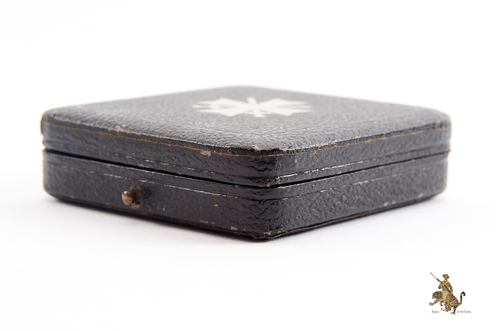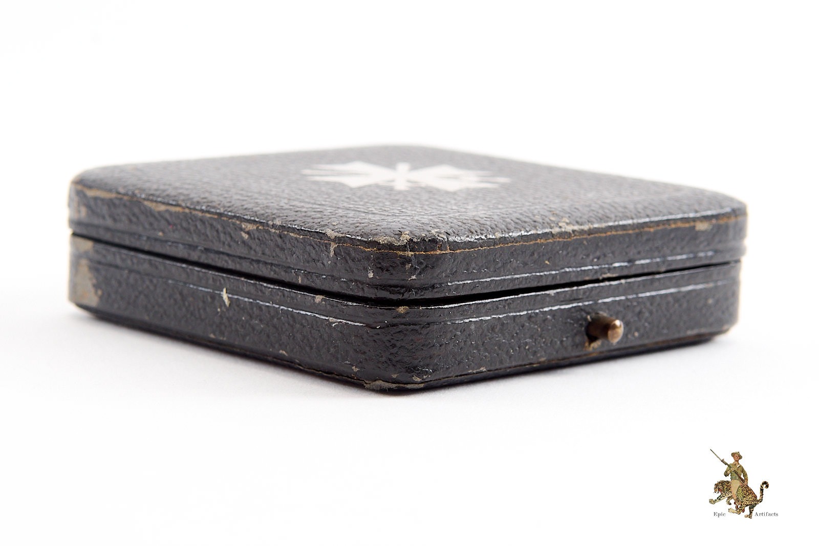 Product Description: This Cased War Merit Cross 1st Class with Swords “3” – Deumer is a very handsome badge. The award is struck from fine zinc, and retains most of the original silver finish. The obverse of the cross shows nice patina with nice silver finish. The reverse of this cross is flat and smooth, with original finish still attached. The hardware setup is functional and all original with soldered block hinge and round wire metal catch. The badge is maker marked with the PKZ code number “3” indicating manufacture by the prestigious firm of Deumer.  Leatherette case is in excellent ++ case with minimal wear mostly to bottom.  This is a great example of a Cased War Merit Cross 1st Class, in excellent ++/NM condition.