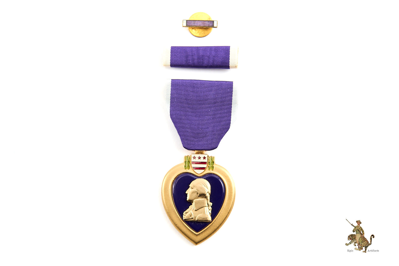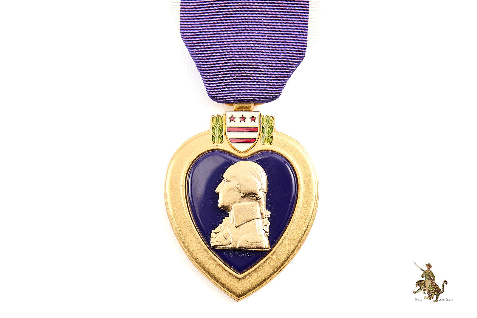 Product Description:  A superb, near mint example of a World War II Purple Heart. The medal features the classic heart-shaped bronze medallion with the left-facing bust of General George Washington in high relief, set against a rich purple enamel field and surmounted by the shield and laurel wreath suspension. The enamel remains vibrant and glossy with no chips, cracks, or repairs, and the gilt bronze finish is beautifully preserved.