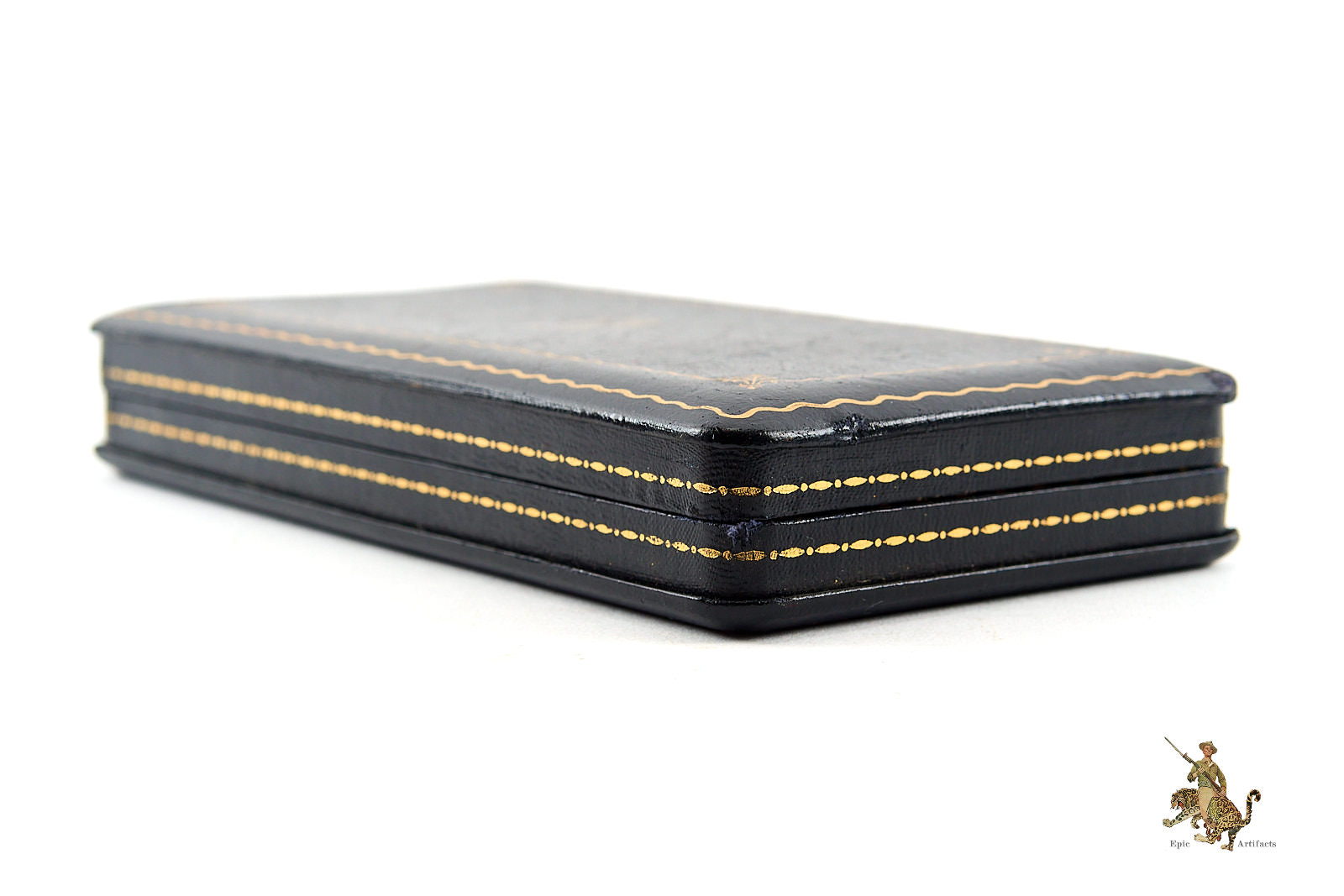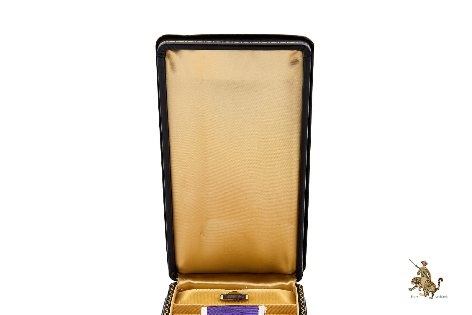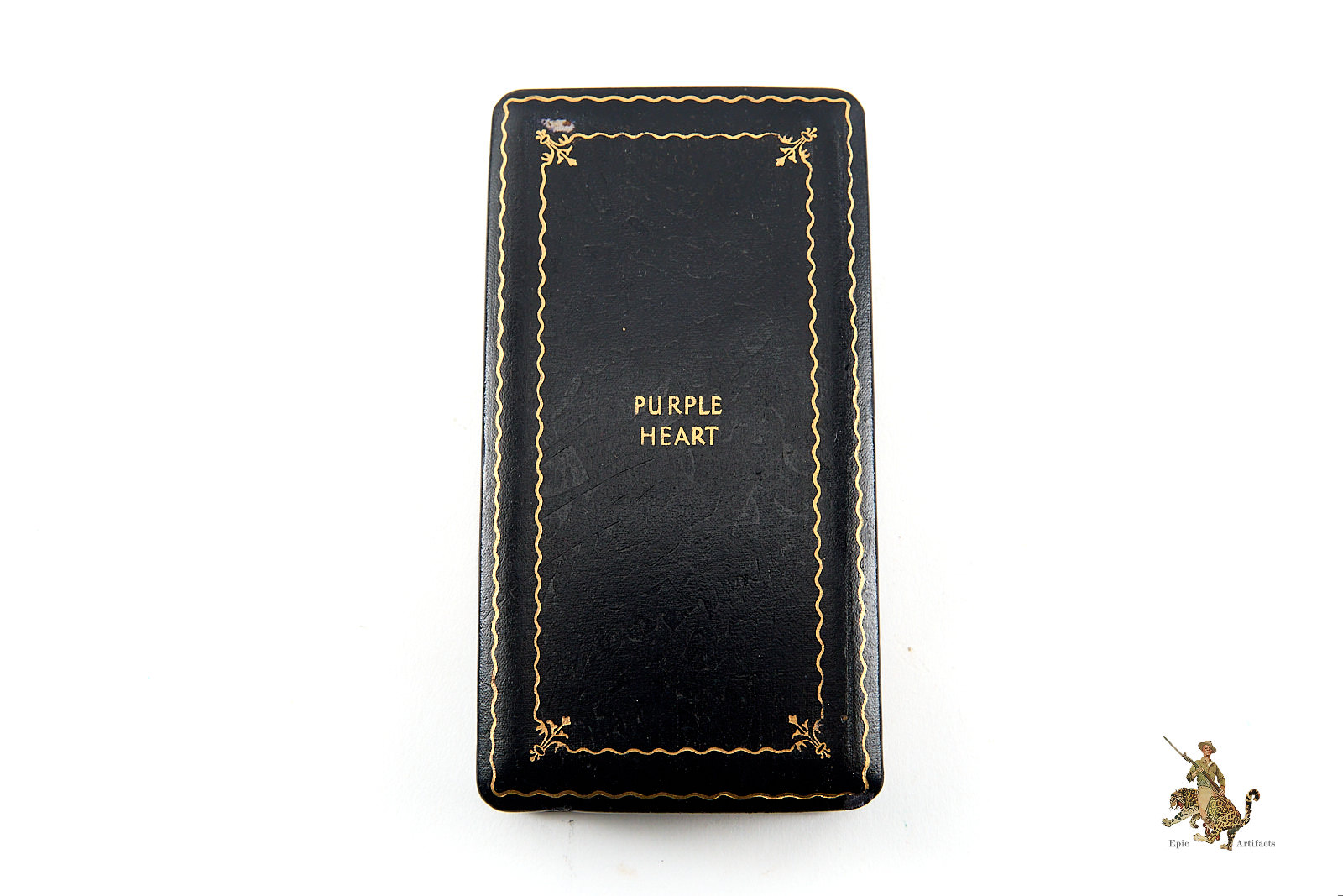 This example is unnamed, as was common for many WWII-issued Purple Hearts, and shows only minimal handling marks consistent with careful preservation. It is complete with its original WWII “coffin” style leatherette presentation case, correct ribbon bar, and lapel button, forming a highly desirable and complete set.