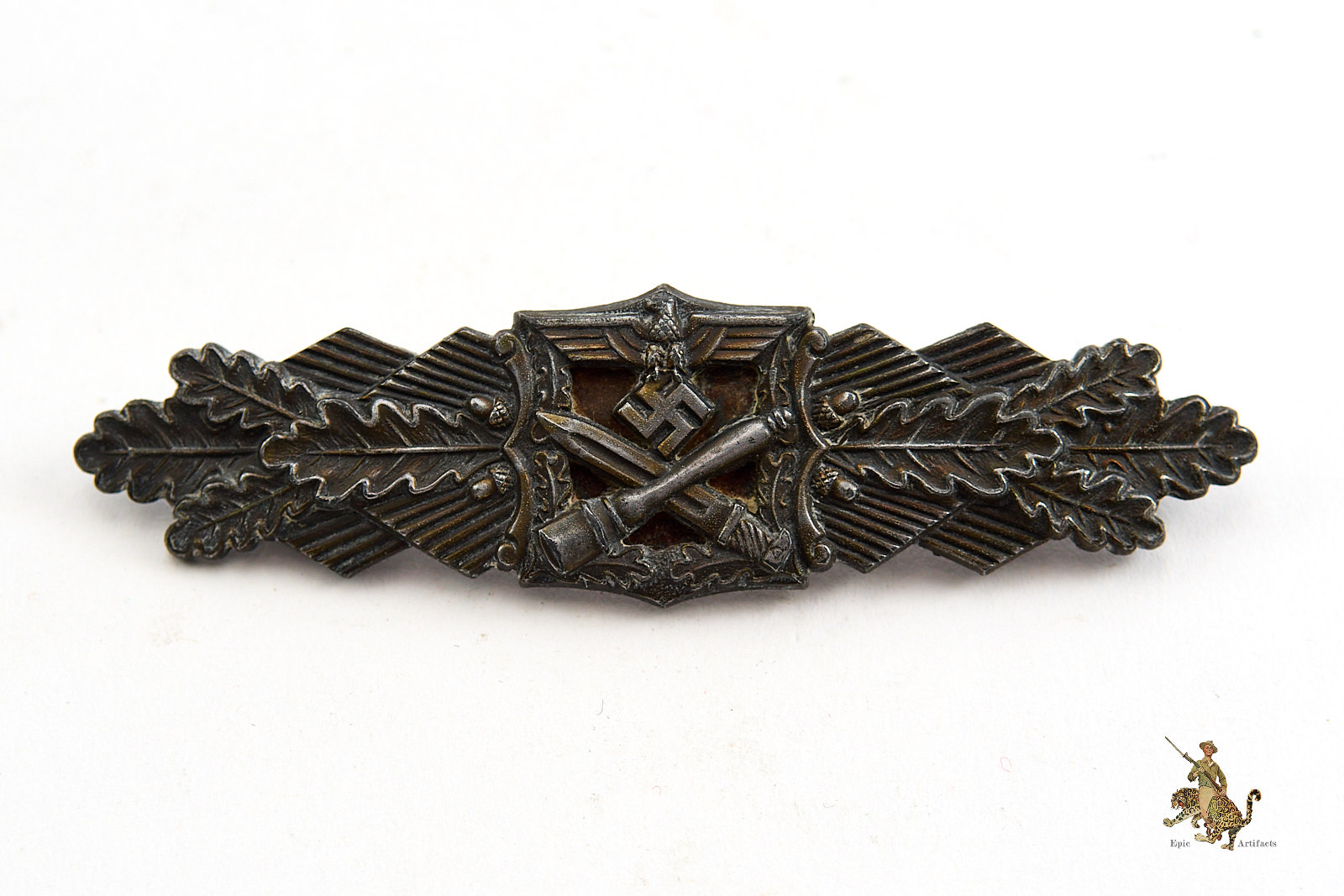 Historical Description: The Close Combat Clasp (Nahkampfspange) was instituted on November 25, 1942, to recognize the feats of German soldiers in close quarters combat. Units with soldiers who survived hand-to-hand fights with the enemy and other extremely close-range combat actions would keep track of the dates and places of each of these battles, and soldiers who managed to make it through many of these fights became eligible for this award. Because only front-line troops with direct combat experience could earn this clasp, it was a regarded by the soldiers as a very prestigious award. The Close Combat Clasp was awarded in three grades: Bronze, for 15 close combat days; Silver, for 25 close combat days, and Gold, for 50 or more days of close combat. Hitler reserved the right to personally award the Gold Close Combat Clasp, which was widely regarded as more prestigious than even the Knight’s Cross. The total amount of these clasps awarded, in all grades, was fewer than 50,000.
