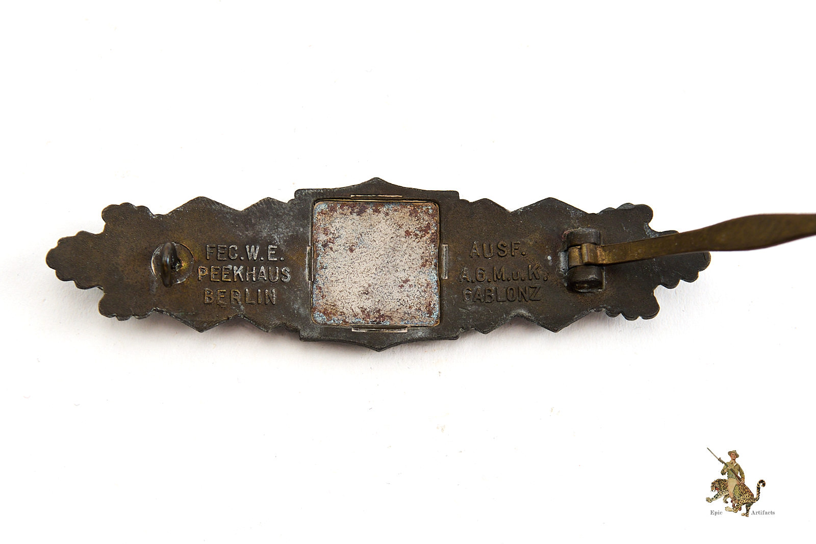 Product Description: A well-preserved and appealing example of a Close Combat Clasp in Bronze manufactured by Arbeitsgemeinschaft Metall und Kunststoff (A.G.M.u.K.), Gablonz. Struck in fine zinc, the clasp retains a minimal amount of its original factory-applied bronze lacquer, the surviving finish displaying attractive bright bronze tones set against the muted surface of the exposed base metal. The obverse remains crisply detailed, with the design elements presenting strong relief and an honest, lightly worn appearance.