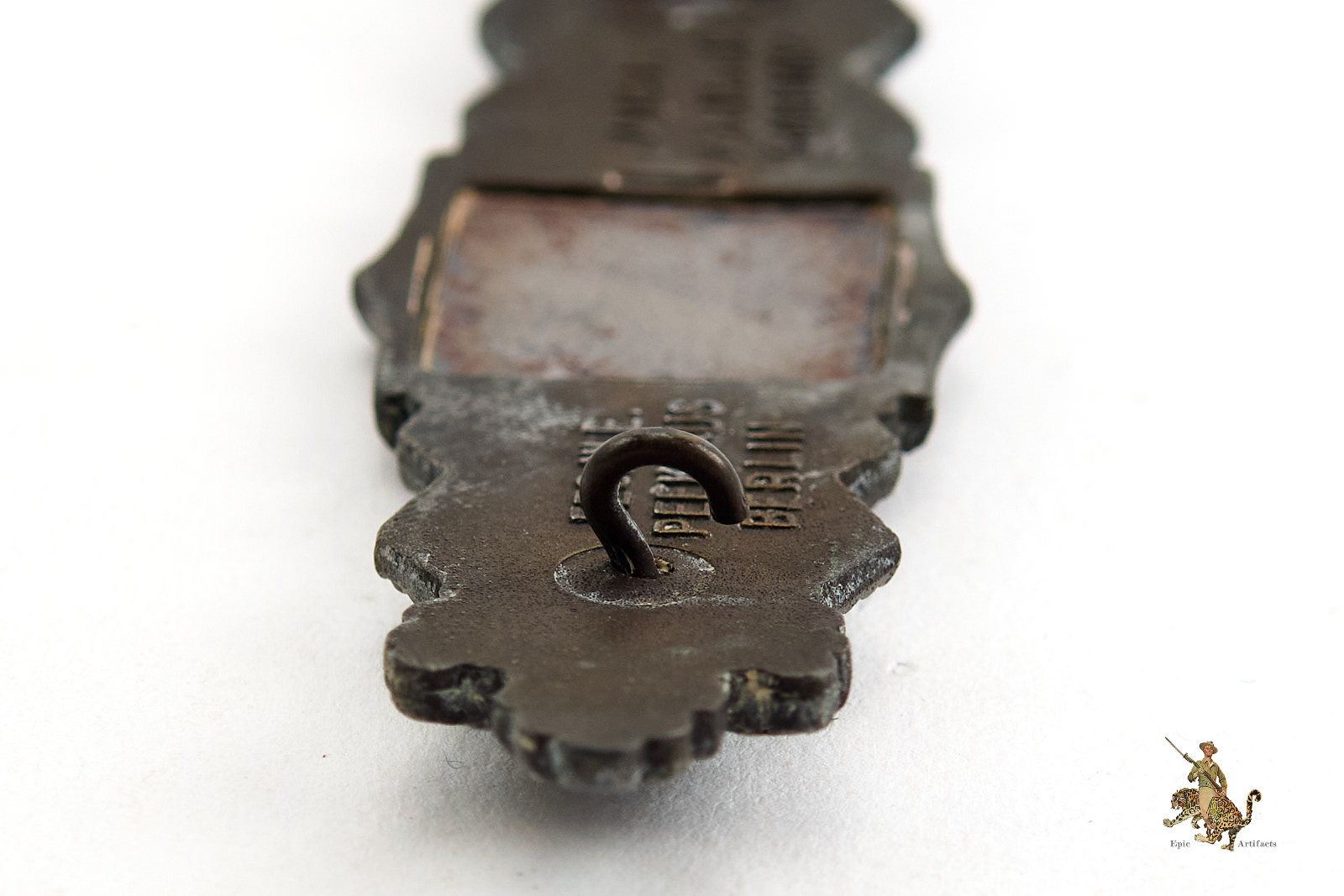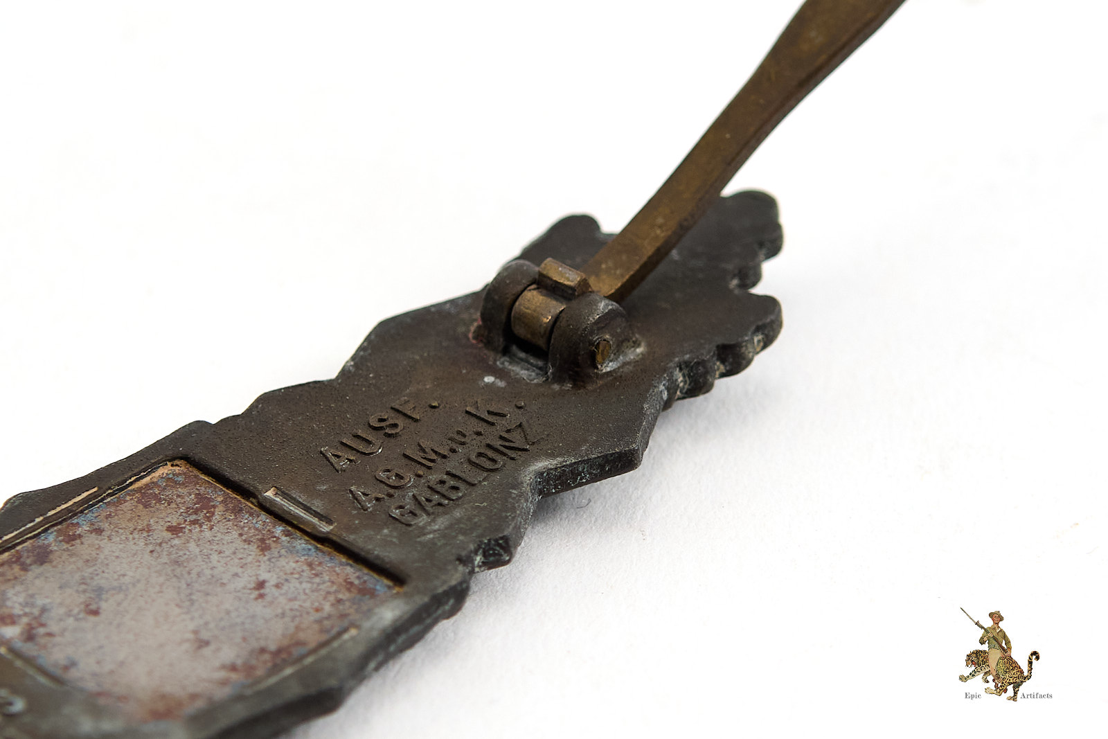 The reverse is flat and smooth, bearing both the raised designer attribution “Peekhaus” and the “A.G.M.u.K.” maker’s mark, fully consistent with known wartime production by this firm. The hardware is textbook and fully intact, including the original functional attachment pin. The steel back plate remains secured by its original crimps and shows minor, expected age-related corrosion. Increasingly scarce on the market, this example represents a solid and authentic specimen of its type, assessed overall as Excellent.