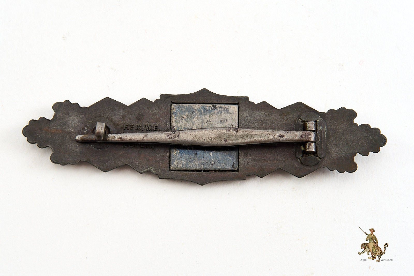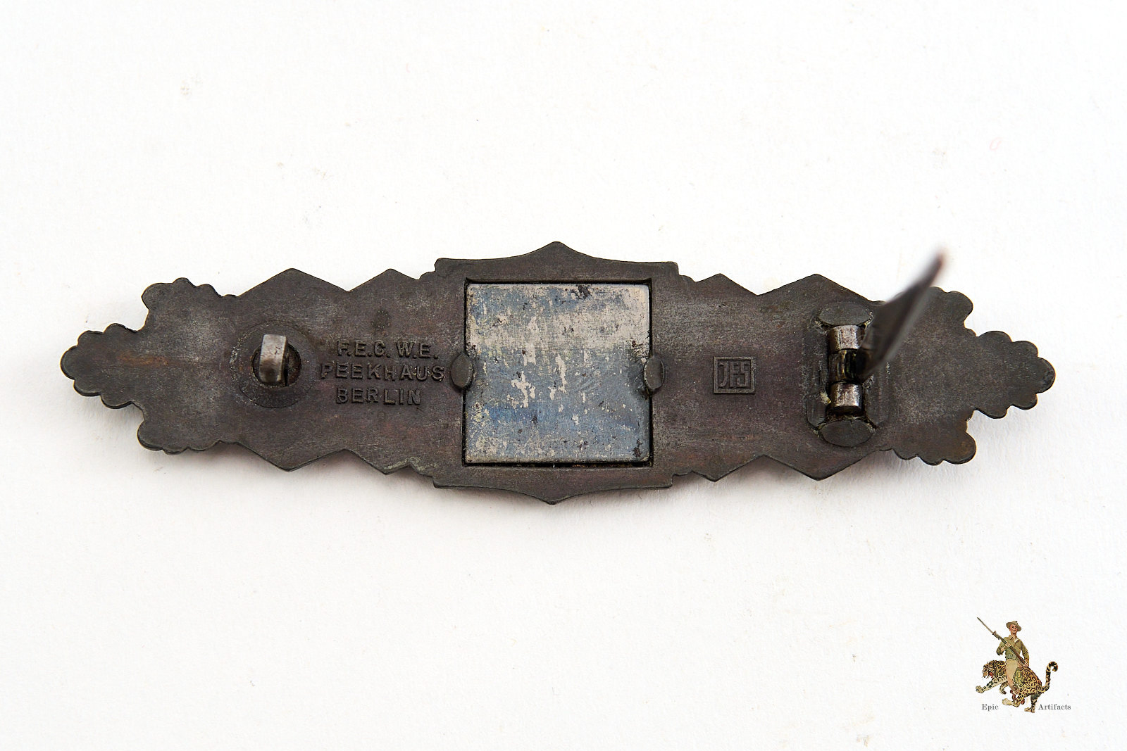 Historical Description: The Close Combat Clasp (Nahkampfspange) was instituted on November 25, 1942, to recognize the feats of German soldiers in close quarters combat. Units with soldiers who survived hand-to-hand fights with the enemy and other extremely close-range combat actions would keep track of the dates and places of each of these battles, and soldiers who managed to make it through many of these fights became eligible for this award. Because only front-line troops with direct combat experience could earn this clasp, it was a regarded by the soldiers as a very prestigious award. The Close Combat Clasp was awarded in three grades: Bronze, for 15 close combat days; Silver, for 25 close combat days, and Gold, for 50 or more days of close combat. Hitler reserved the right to personally award the Gold Close Combat Clasp, which was widely regarded as more prestigious than even the Knight’s Cross. The total amount of these clasps awarded, in all grades, was fewer than 50,000.