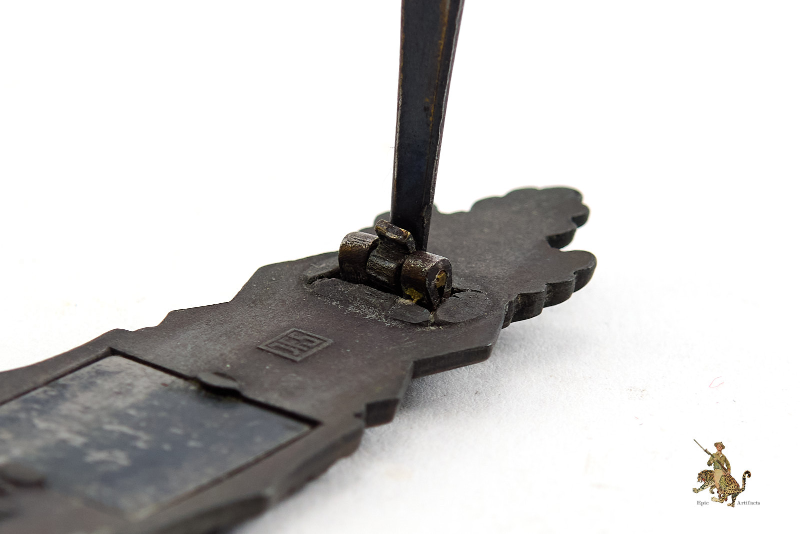 The reverse is characteristically flat and smooth, bearing the raised “JFS” designer attribution denoting production by Josef Feix & Söhne. All hardware components remain original and fully functional, including the textbook attachment pin. The steel back plate is firmly secured by its original crimps and shows only minor, expected wear from age. Increasingly difficult to source in such honest and undisturbed condition, this example stands as a representative and desirable specimen, assessed overall as Excellent.