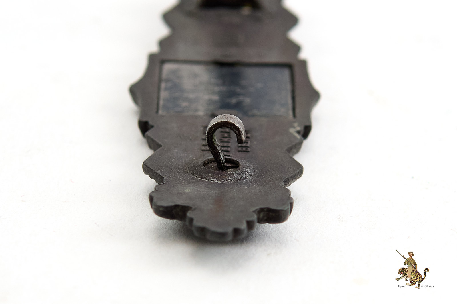Product Description: A well-presented example of a Close Combat Clasp in Bronze manufactured by Josef Feix & Söhne (JFS) of Gablonz, executed in fine zinc and retaining approximately thirty percent of its original factory-applied bronze lacquer. The remaining finish displays appealing warm tonal contrasts—bright bronze highlights set against the muted grey of exposed zinc—giving the piece an attractive and authentic character. The obverse retains strong detail, with the clasp’s distinctive relief elements still clearly defined.