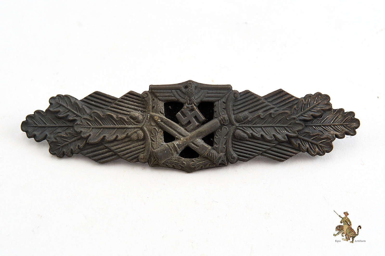 Historical Description: The Close Combat Clasp (Nahkampfspange) was instituted on November 25, 1942, to recognize the feats of German soldiers in close quarters combat. Units with soldiers who survived hand-to-hand fights with the enemy and other extremely close-range combat actions would keep track of the dates and places of each of these battles, and soldiers who managed to make it through many of these fights became eligible for this award. Because only front-line troops with direct combat experience could earn this clasp, it was a regarded by the soldiers as a very prestigious award. The Close Combat Clasp was awarded in three grades: Bronze, for 15 close combat days; Silver, for 25 close combat days, and Gold, for 50 or more days of close combat. Hitler reserved the right to personally award the Gold Close Combat Clasp, which was widely regarded as more prestigious than even the Knight’s Cross. The total amount of these clasps awarded, in all grades, was fewer than 50,000.