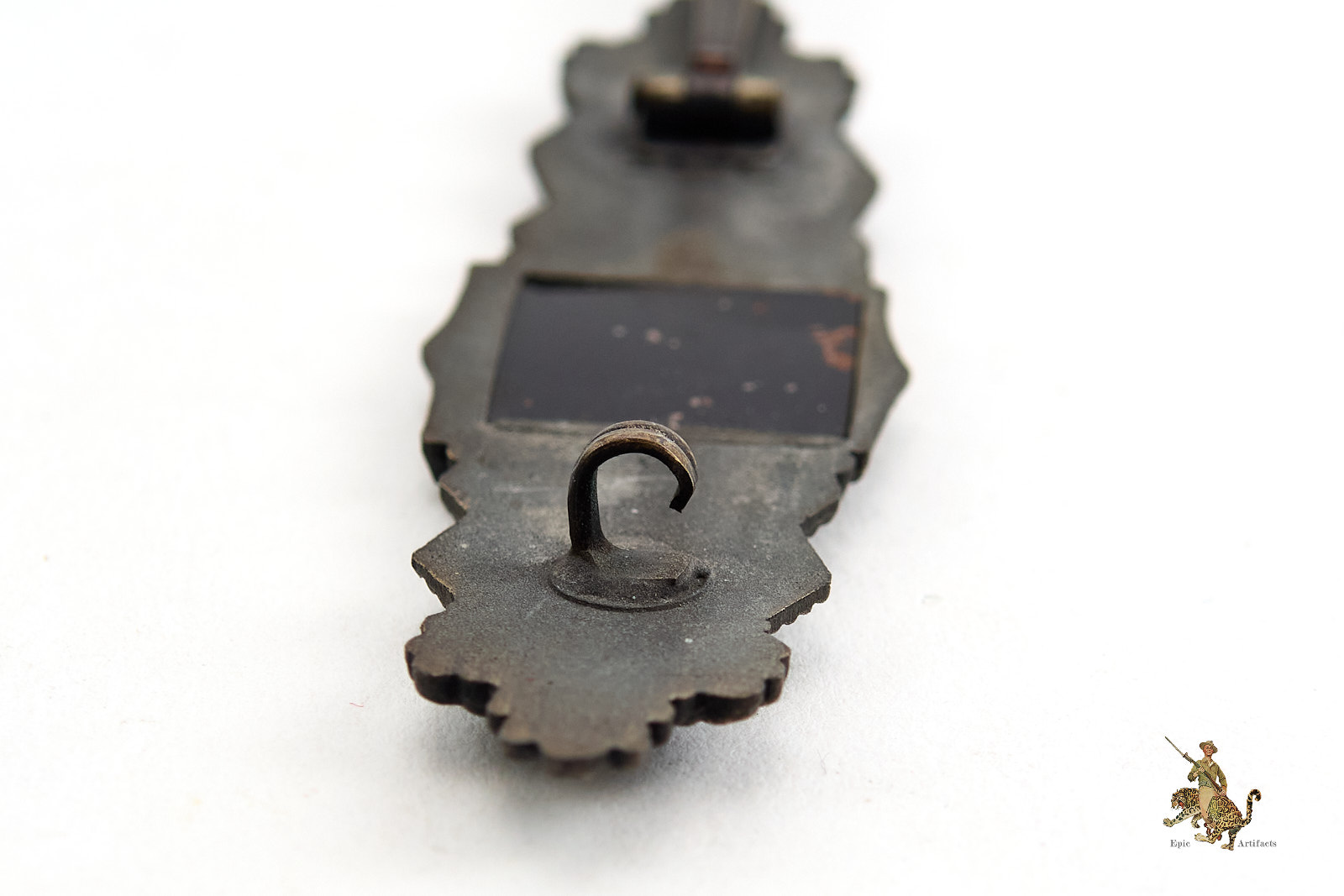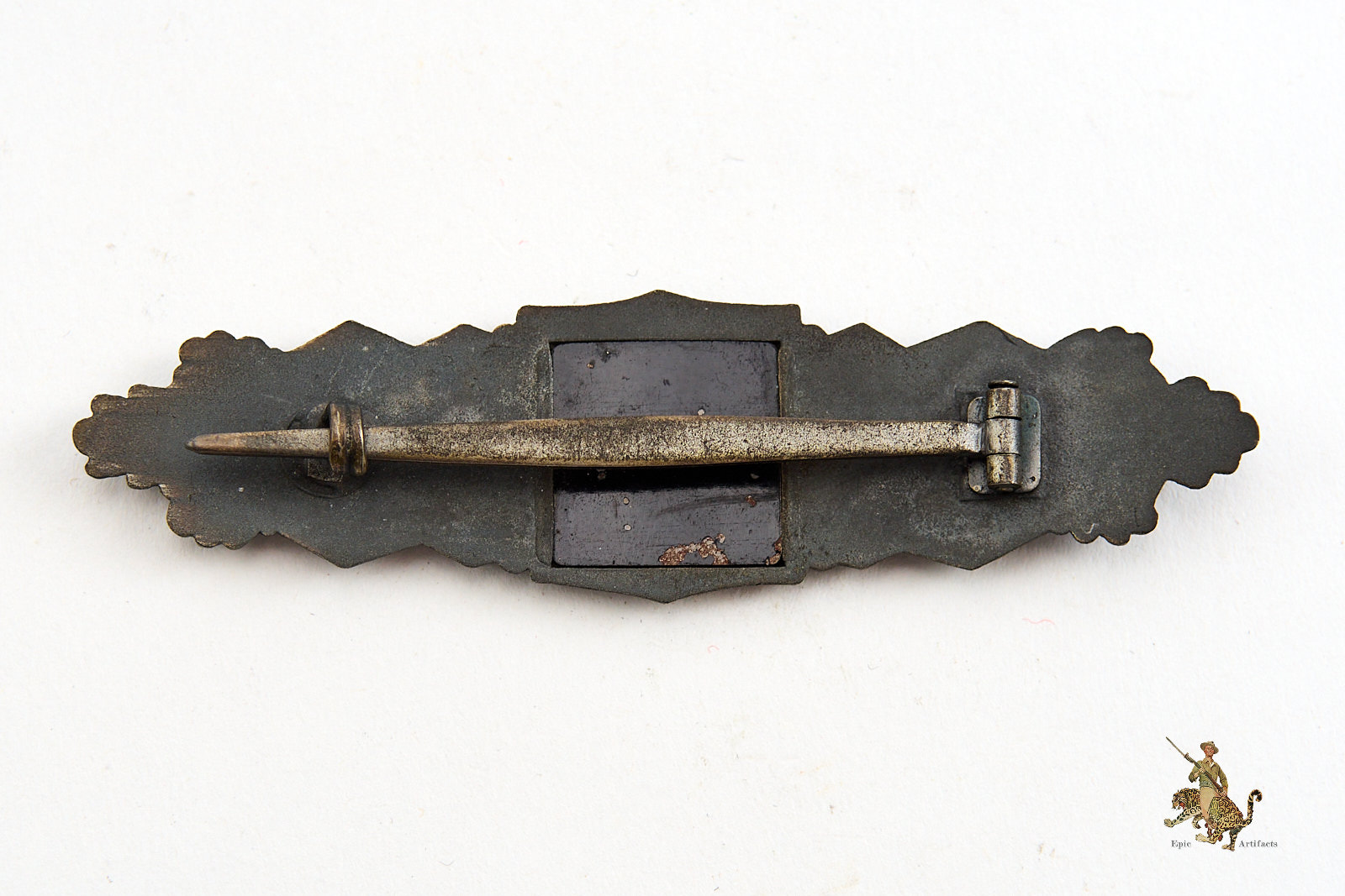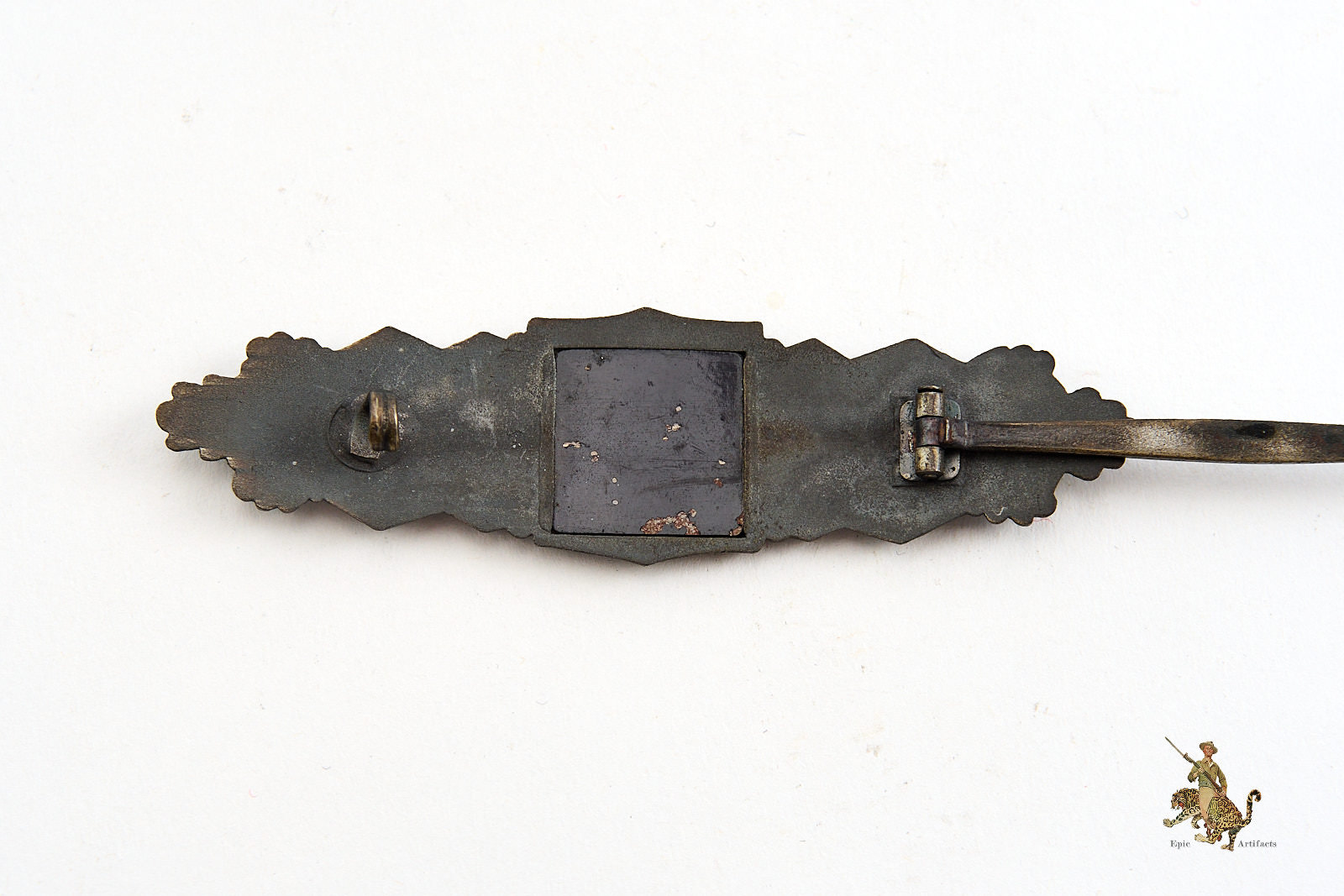 Product Description: A well-preserved and uncommon Close Combat Clasp in Silver – Deschler, attributed to the Deschler firm through its distinctive construction characteristics. Struck in zinc and unmarked, the clasp now exhibits the muted grey tonality typical of zinc pieces whose original finish has largely dissipated. The obverse retains sharp, bold detail, with untouched, older patination settled into the recessed areas of the design, creating appealing visual depth and clear evidence of period wear.