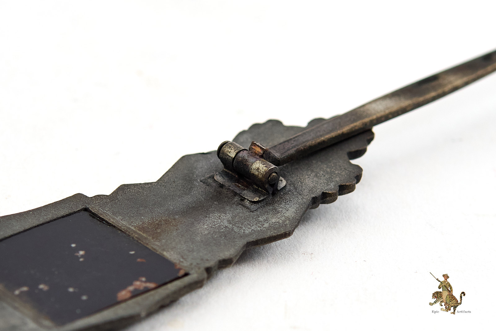 The reverse remains clean and undisturbed, with the backing plate preserving its original darkened finish. The silver-toned hardware—including the banjo pin, block hinge, and sheet-metal catch—retains a noteworthy amount of its original surface, leaving no doubt as to the silver grade. All components remain fully functional. Overall, this Close Combat Clasp in Silver – Deschler is a highly attractive example from a desirable maker attribution, presented here in Excellent condition.