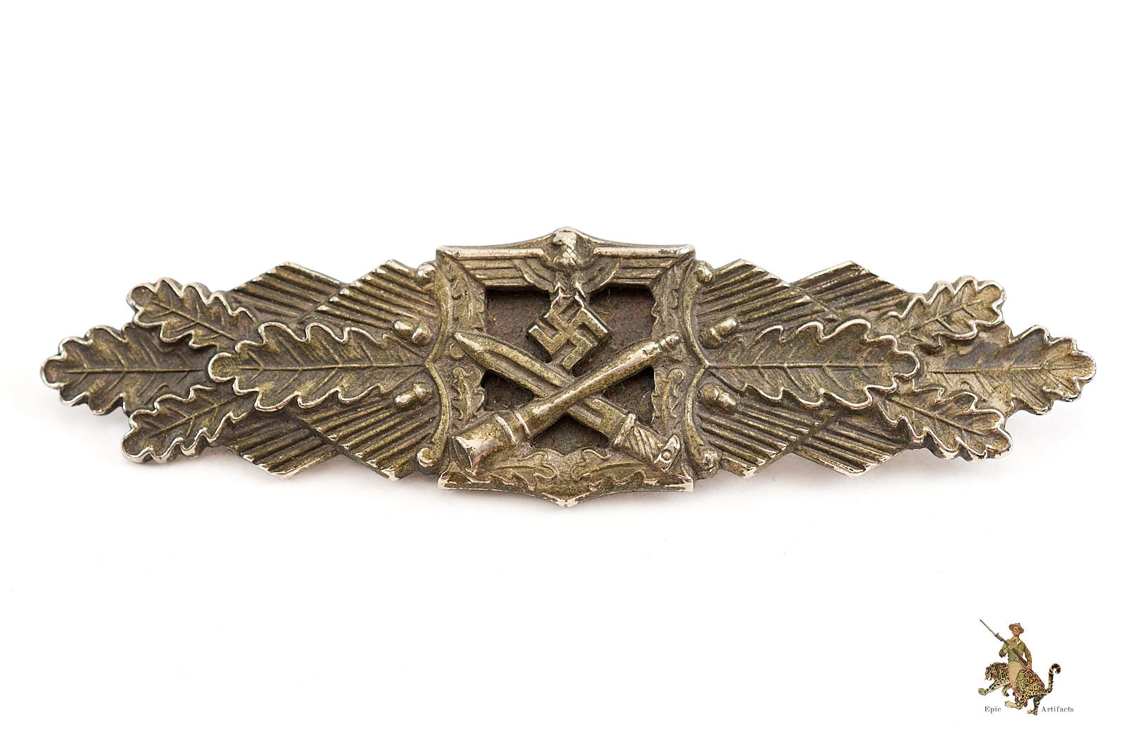 Historical Description: The Close Combat Clasp (Nahkampfspange) was instituted on November 25, 1942, to recognize the feats of German soldiers in close quarters combat. Units with soldiers who survived hand-to-hand fights with the enemy and other extremely close range combat actions would keep track of the dates and places of each of these battles, and soldiers who managed to make it through many of these fights became eligible for this award. Because only front-line troops with direct combat experience could earn this clasp, it was a regarded by the soldiers as a very prestigious award. The Close Combat Clasp was awarded in three grades: Bronze, for 15 close combat days; Silver, for 25 close combat days, and Gold, for 50 or more days of close combat. Hitler reserved the right to personally award the Gold Close Combat Clasp, which was widely regarded as more prestigious than even the Knight’s Cross. The total amount of these clasps awarded, in all grades, was fewer than 50,000.