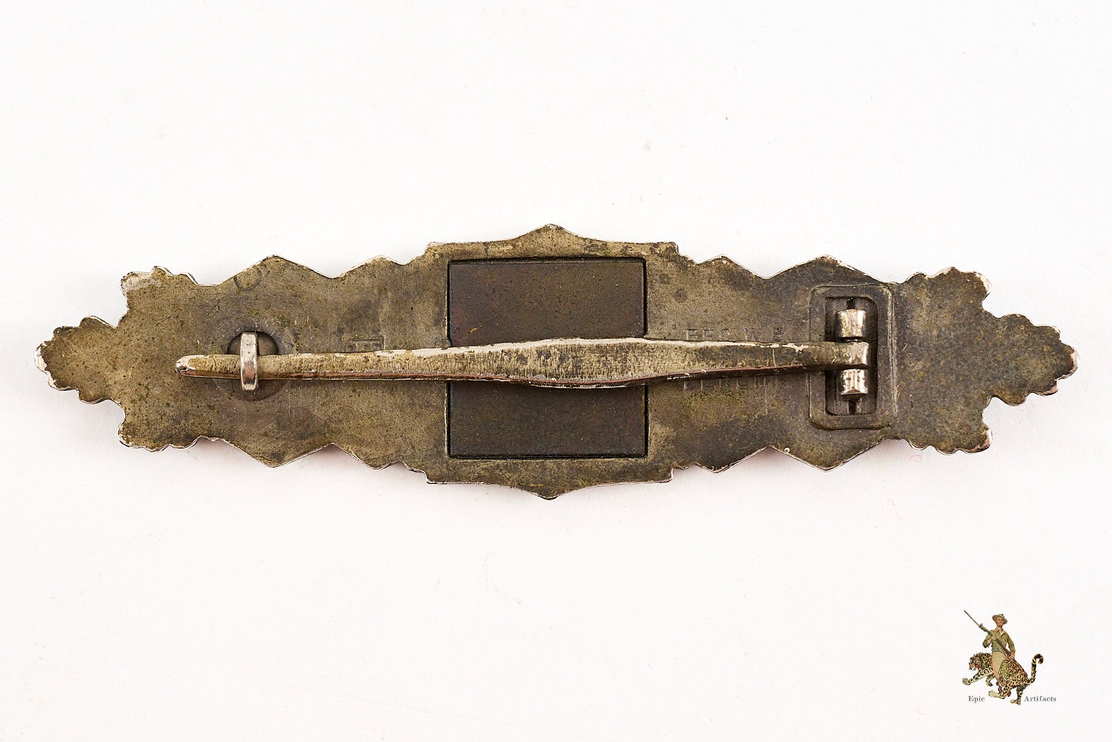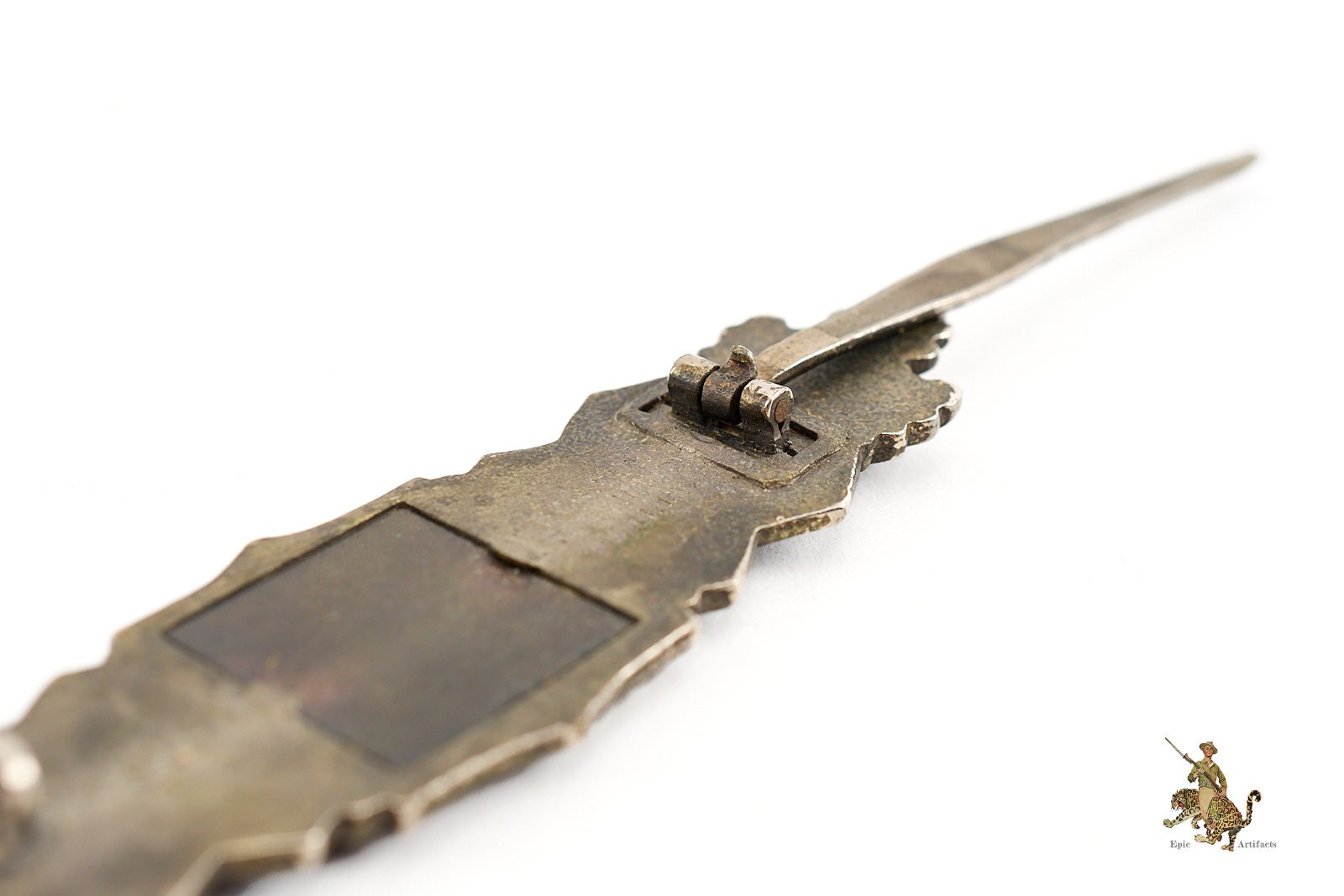 Product Description: A superb and highly desirable example of the Close Combat Clasp in Silver – JFS, manufactured in the second pattern by Josef Feix & Sohn (JFS) of Gablonz. Awarded for participation in a minimum of 30 days of close-quarters combat, this decoration remains one of the most iconic and hard-earned awards of the Wehrmacht. The clasp retains the majority of its original silver finish, with a pleasing, even patina and subtle wear to the high points, resulting in an attractive, aged luster. The reverse is clearly marked with the JFS maker’s stamp and features the correct barrel hinge, banjo-style pin, and flat wire catch, all fully functional. This Close Combat Clasp in Silver – JFS stands out as an excellent example of a rare and combat-earned award.