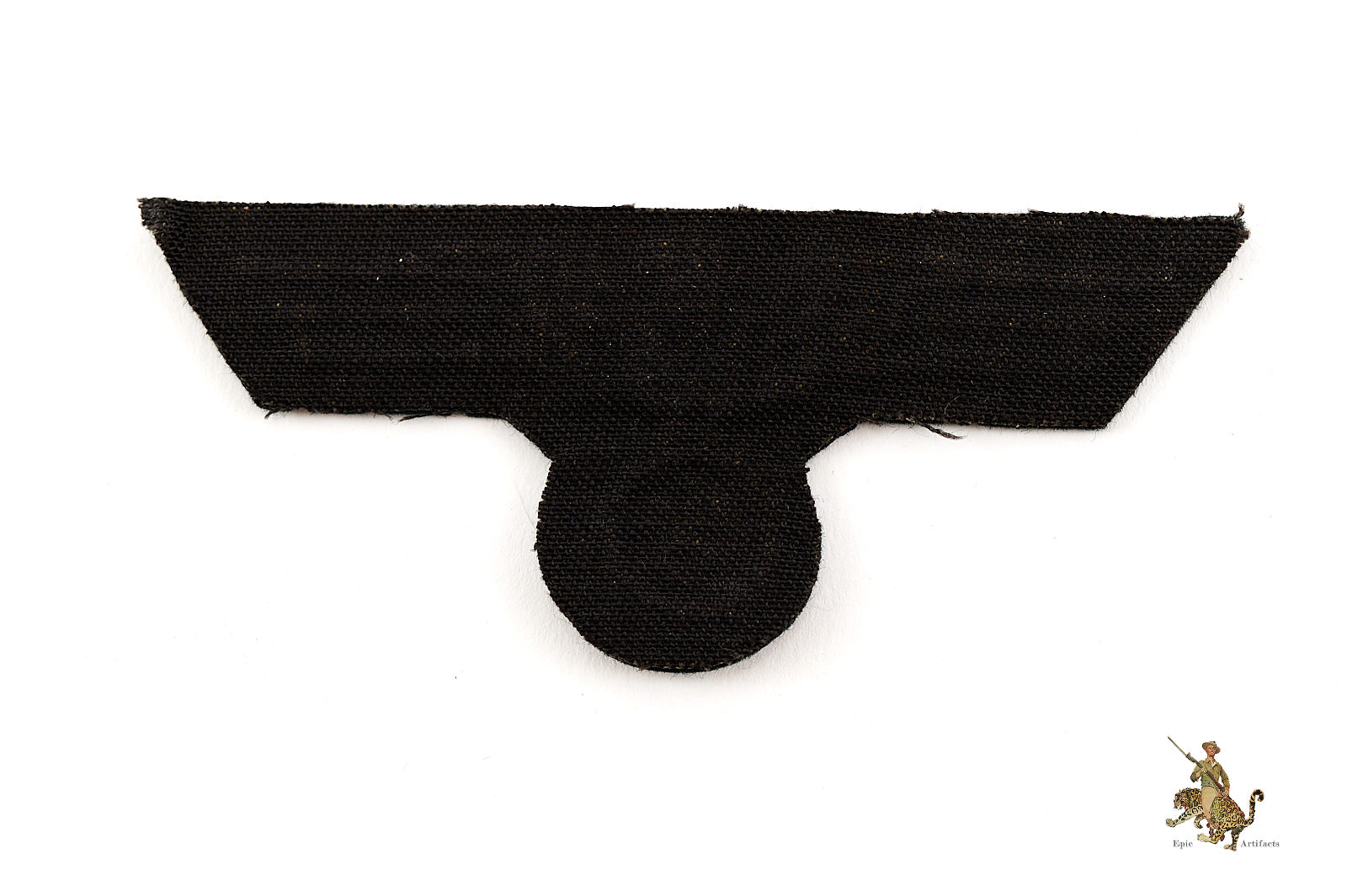 Historical Description: The German Armed Forces (Wehrmacht), as formed in 1935, and as they existed until the end of World War 2, consisted of the Army (Heer), the Air Force (Luftwaffe) and the Navy (Kriegsmarine). The Waffen-SS fell under the command of the Wehrmacht during the war. Each of these branches of service had a unique eagle design that was worn on both the formal dress and parade uniforms, and the field uniforms, of the members of that branch. These eagles were worn on soft headgear, including service and field caps, as well as on the uniform jacket. In the Heer, the Luftwaffe, and the Kriegsmarine, this eagle was worn on the chest of the tunic; collectors have termed these “breast eagles.” The Heer and the Luftwaffe generally used the same eagle style, though variations in color of the eagle or the backing distinguish between the two. The Luftwaffe used their own flying eagle emblem. The Waffen-SS sleeve eagle (and cap eagle) had wings that came to a distinctive tapered point. The cap, breast and sleeve eagles used by the various military branches were manufactured in many variations. There were machine-woven and machine embroidered versions, usually used by officers and NCOs. Hand-embroidered bullion wire eagles were typically for officers. There were metal eagles, for caps, or for uniforms that were intended to have detachable insignia. There were even eagles embroidered on camouflage fabric, intended for use on special field uniforms. There were also eagles in specific colors for use on tropical uniforms. Some of these eagles were mass-produced and are still common today. Others were, and are, very rare.