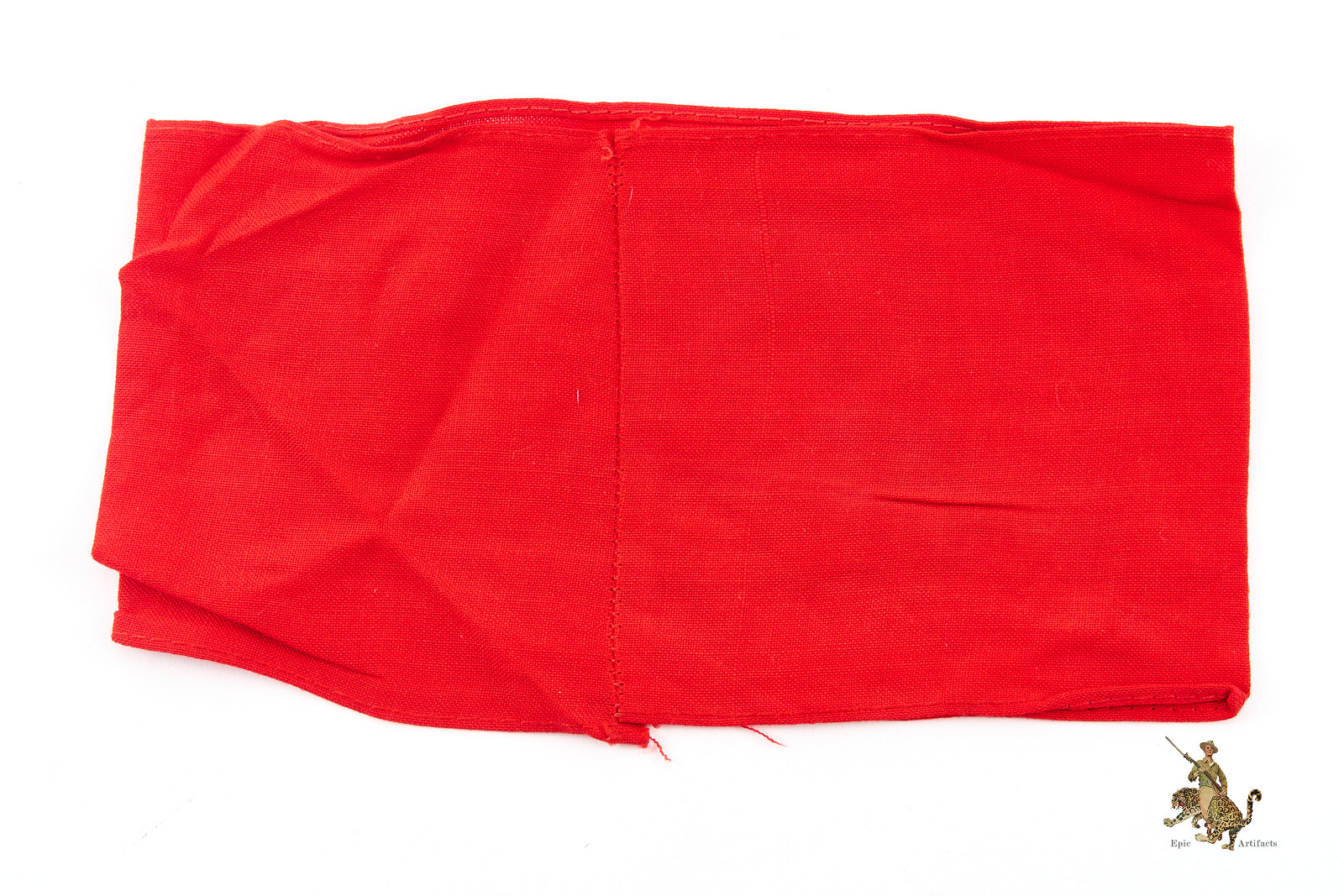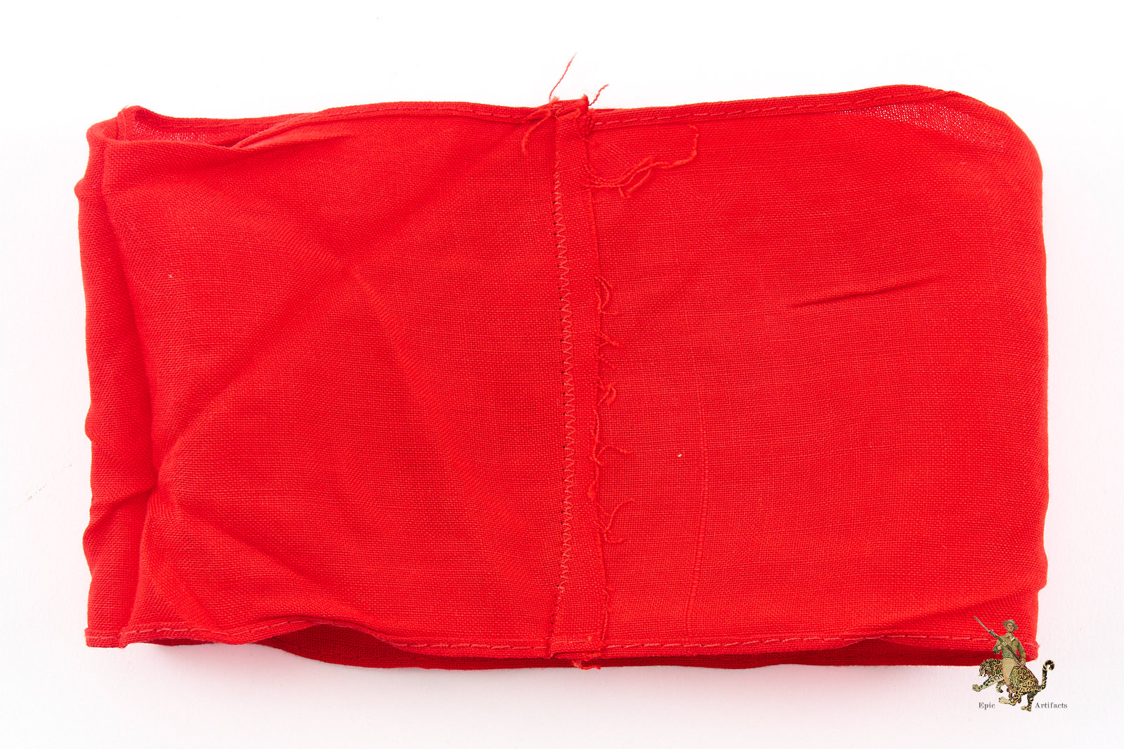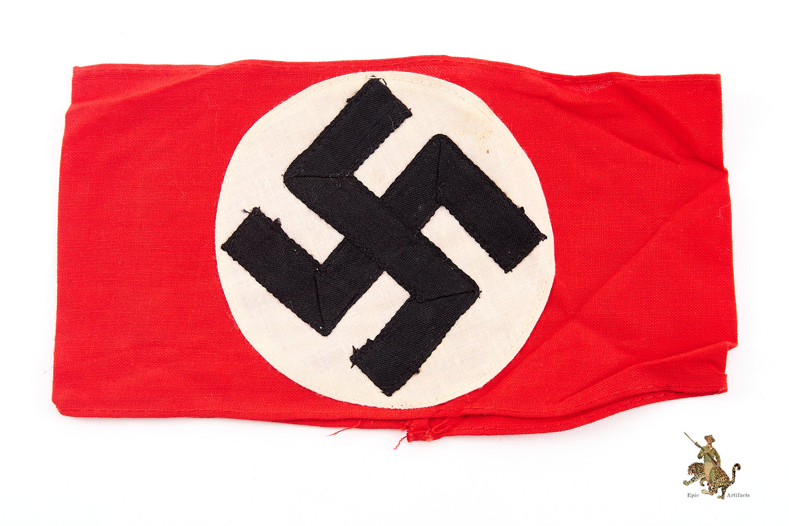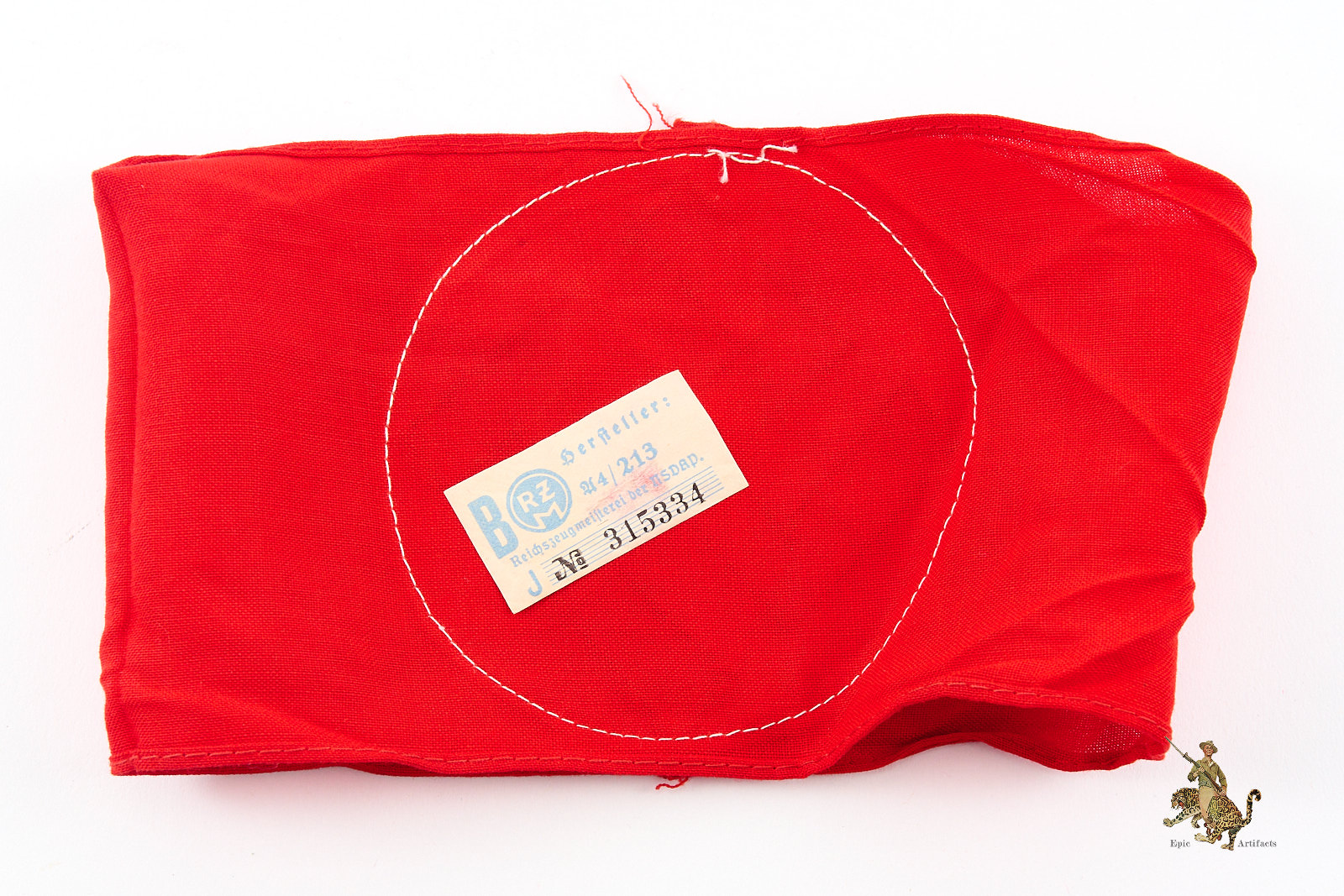 Product Description: An original Cotton Three-Piece NSDAP Armband – RZM Tag, presented here as an exemplary textbook specimen distinguished by clear evidence of period wear and strong visual character. Crafted from high-quality red polished cotton, the armband displays a separately applied white cotton roundel bearing a precisely executed black cotton swastika, each element neatly machine-stitched to the body. Both upper and lower edges are cleanly finished, with the ends joined by machine stitching consistent with recognized period construction.