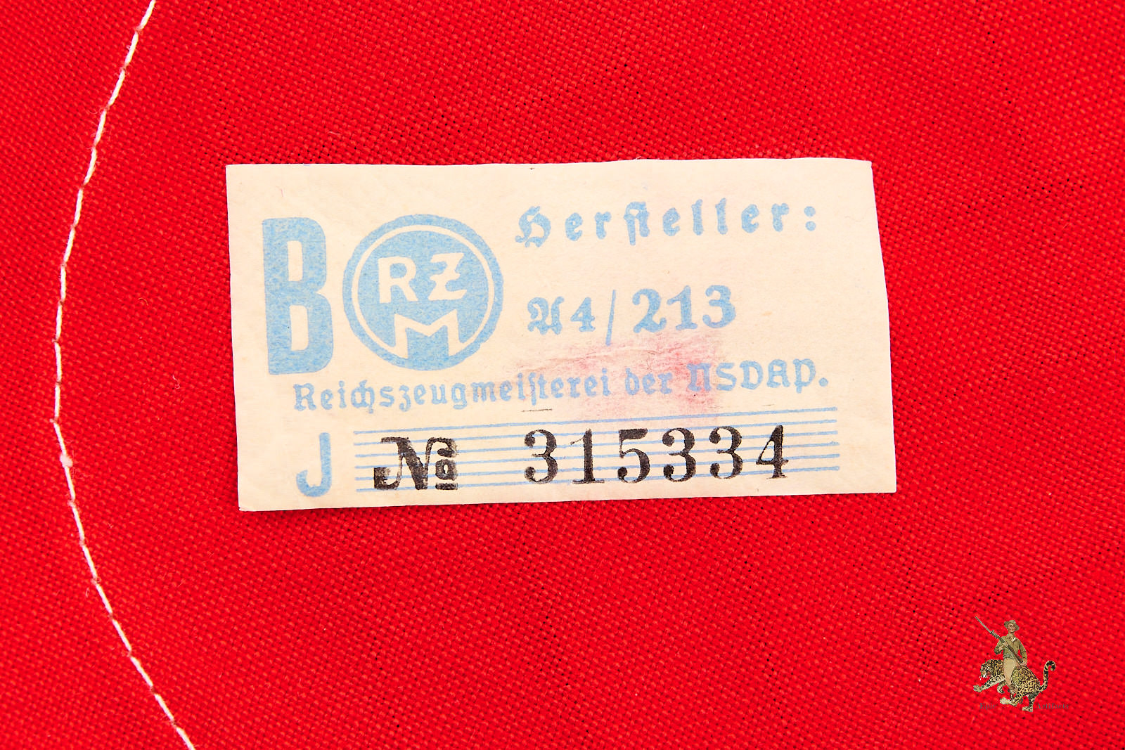 This Cotton Three-Piece NSDAP Armband – RZM Tag shows extremely minor discoloration to the roundel and some creasing from storage. Despite these expected signs of age and wear, the exterior retains a notably strong, rich coloration and presents in excellent overall condition—a well-preserved and highly representative example suitable for the discerning collector. The inside shows RZM tag marked A4/213 for the maker.
