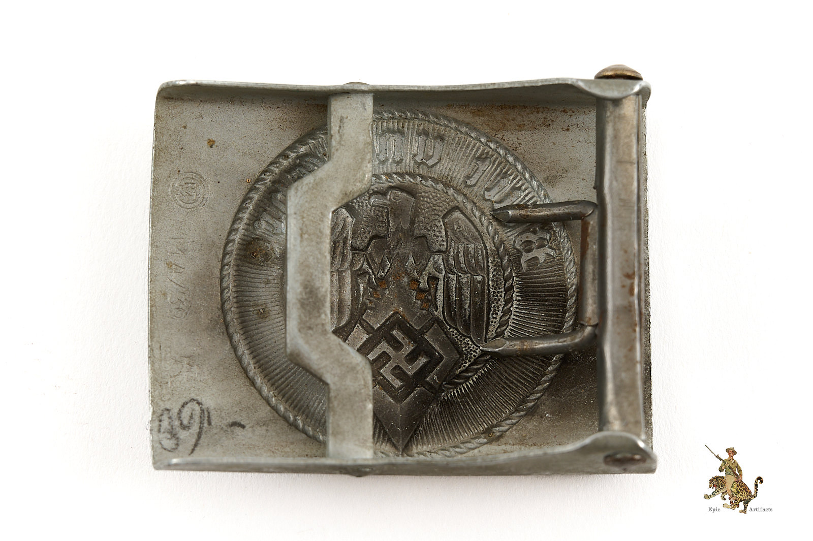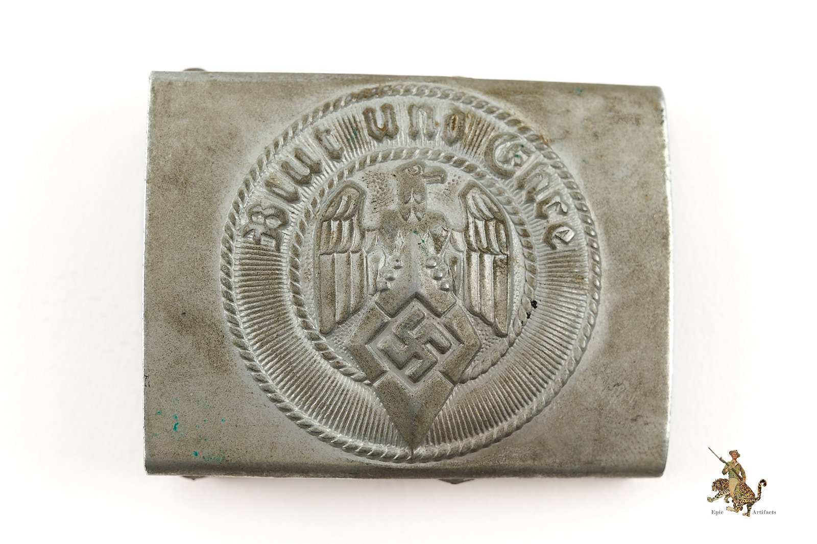 Product Description: This Crank Catch Hitler Youth Buckle is a very desirable variant, by a maker associated with top quality pieces. It’s an early, prewar buckle made of zinc. It appears that this buckle once had a silver finish, as some traces remain in the recesses of the design, but most of the surface has reverted to bare metal. There is a pleasant, light age patina throughout, and lots of detail to the central roundel with “Blood and Honor” motto. The reverse of this buckle shows the sought-after variant “crank” style belt catch. The buckle is nicely marked near the catch, with the round RZM logo, the stylized “A” maker mark of F. W. Assmann & Söhne in Lüdenscheid, and the Assmann RZM code “M4/39.” The Crank Catch Hitler Youth Buckle is a rare buckle to find. This one is in excellent condition.