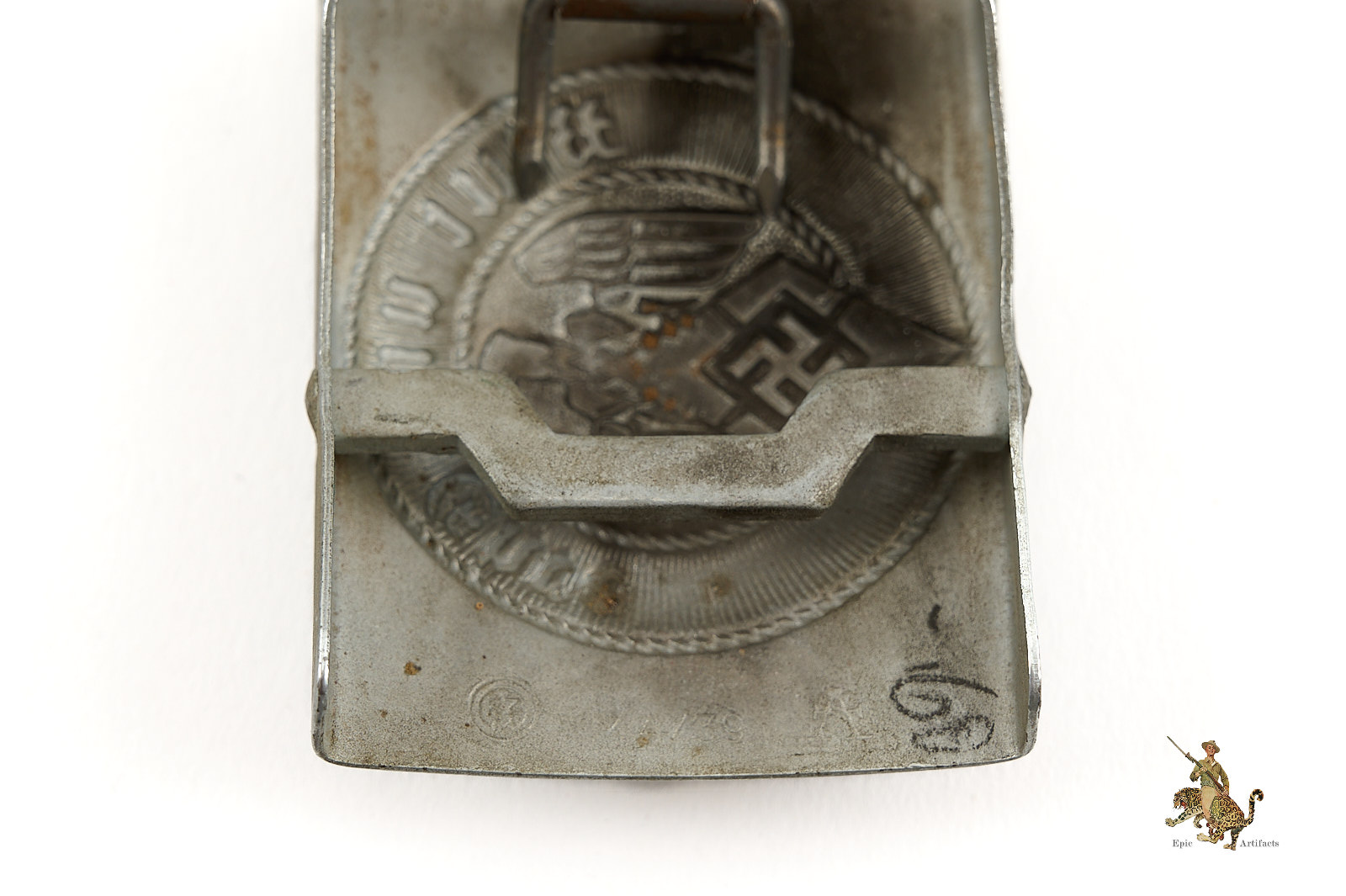 Historical Description: The belt buckle was an important part of the regalia worn by all uniformed military, civil, political and paramilitary organizations during the Third Reich. The belt (“Koppel”) was part of the uniform and would always be worn while on duty. The belt buckle (“Koppelschloss”) was generally specific to each organization, with many organizations having separate belt buckles for officers and for enlisted personnel, sometimes with different colors and finishes to further denote specific purposes. The buckles were adorned with various mottos and designs specific to the organizations for which they were intended. Many designs used the German national eagle emblem, in a variety of forms. Belt buckles were worn with uniforms ranging from finely tailored officer parade uniforms, to the issue uniforms of enlisted soldiers in combat. Generally speaking, most German belt buckles of the Third Reich were made with two prongs on the reverse, to allow the buckle to be worn and adjusted on a belt. The buckle had a catch that would mate with a hook on the belt, when worn. The earliest Third Reich buckles were often made of brass, or nickel silver. Later, aluminum became very common, and was used on private purchase as well as enlisted buckles of the German military, with or without a painted or plated finish. After WWII began, most enlisted military buckles were steel. Nazi belt buckles were popular souvenirs for Allied troops who served in Europe. Some types were made by the millions and remain quite common today. Others were made in limited numbers and are very rare.