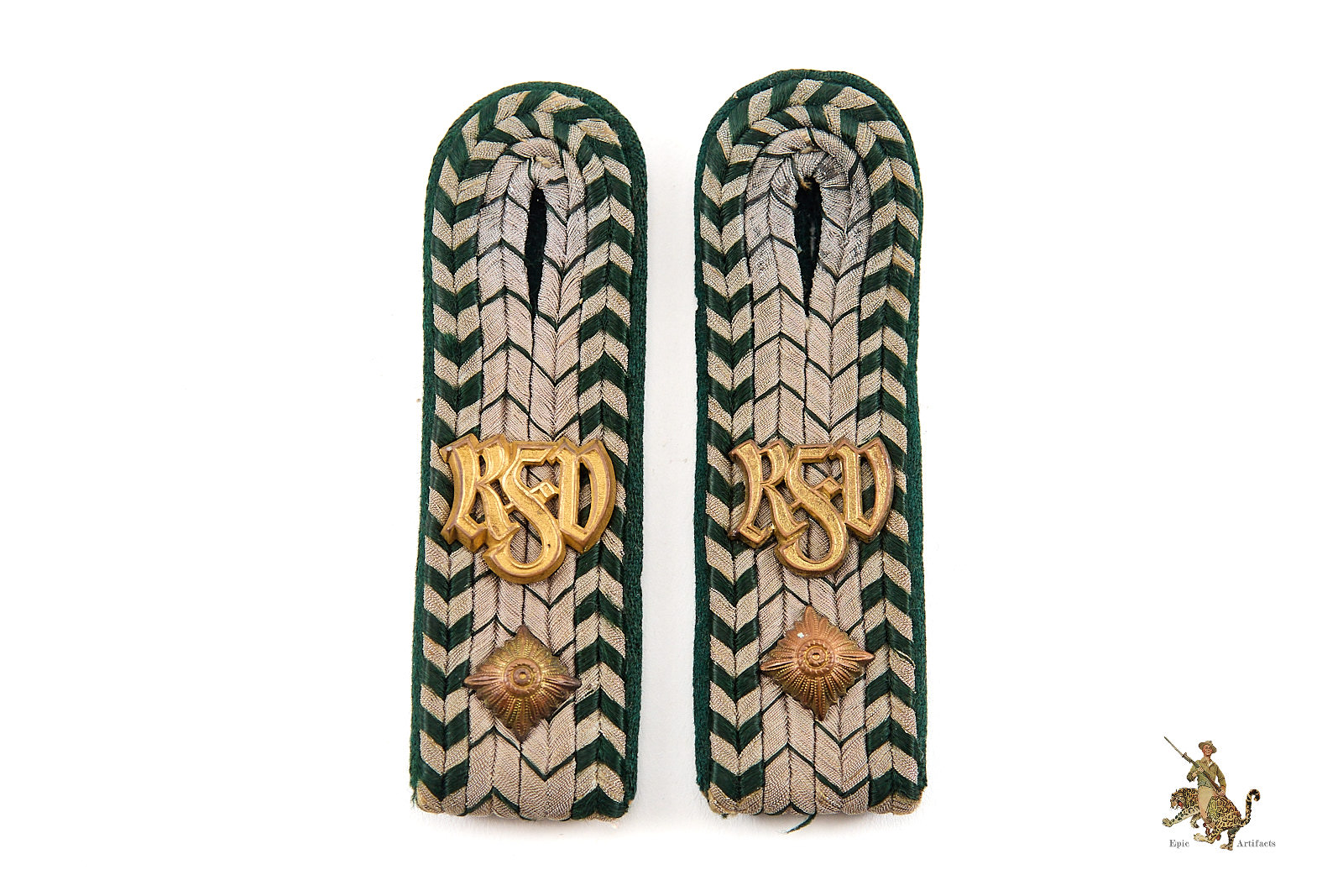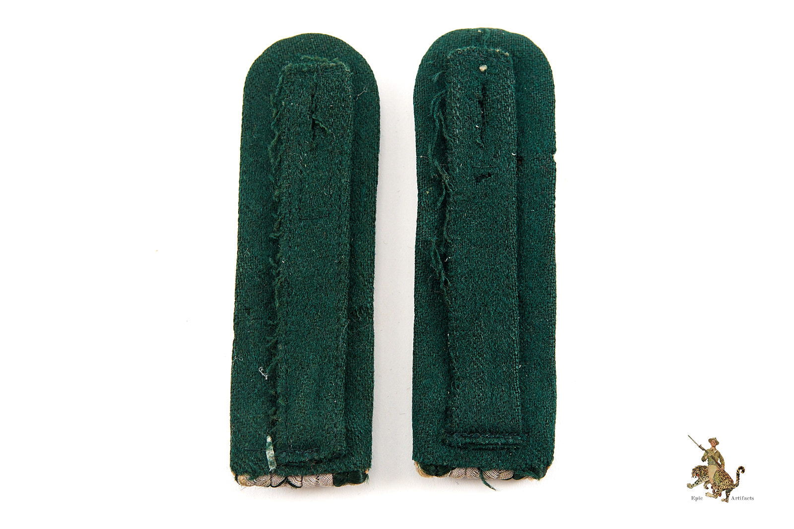 Historical Description: The German military as well as civil, political and paramilitary organizations traditionally used shoulder straps and shoulder boards as uniform insignia, to denote the rank or function of the wearer. After the Nazi rise to power in 1933, there was a tremendous increase in the number of groups and organizations in Germany wearing officially sanctioned uniforms, and most of these organizations used shoulder straps and shoulder boards as a component of their regalia. The exact color of piping utilized, the material color, the type of braid or Tresse that was used, and the number or location of devices and pips present, allow shoulder boards to be tracked to the exact organization that issued them, and often yield even further detail such as the wearer’s rank and even his specific military unit. Normally worn in pairs, the boards were in some cases plain, and in other cases adorned with detailed embroidery or metal emblems. Some shoulder boards were made in the millions, others were specific to a single individual.