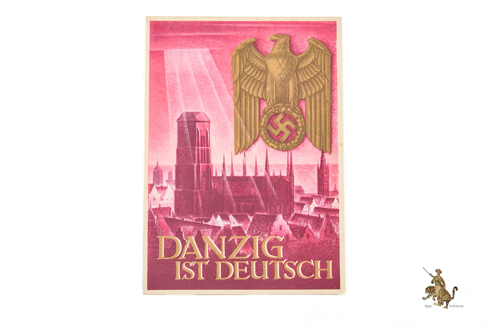 Emblematic of the annexation of Free City of Danzig into Nazi Germany in 1939, this Danzig Ist Deutsch 6 Reich Postcard represents a historically significant piece of wartime-era printed ephemera with strong visual appeal for collectors.