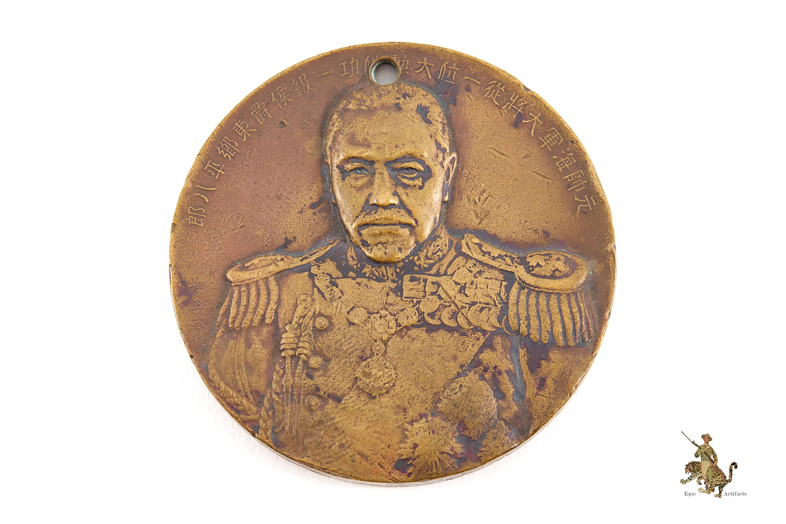 Surface wear and light scratches are visible, consistent with age and handling, and a small hole has been added at the upper edge for suspension, as shown. Despite this alteration, the medal remains a desirable historical artifact with well-preserved artistry. A characteristic example of its commemorative type, this Death of Admiral Heihachiro Togo Table Medal offers collectors an appealing combination of condition, craftsmanship, and naval historical significance.