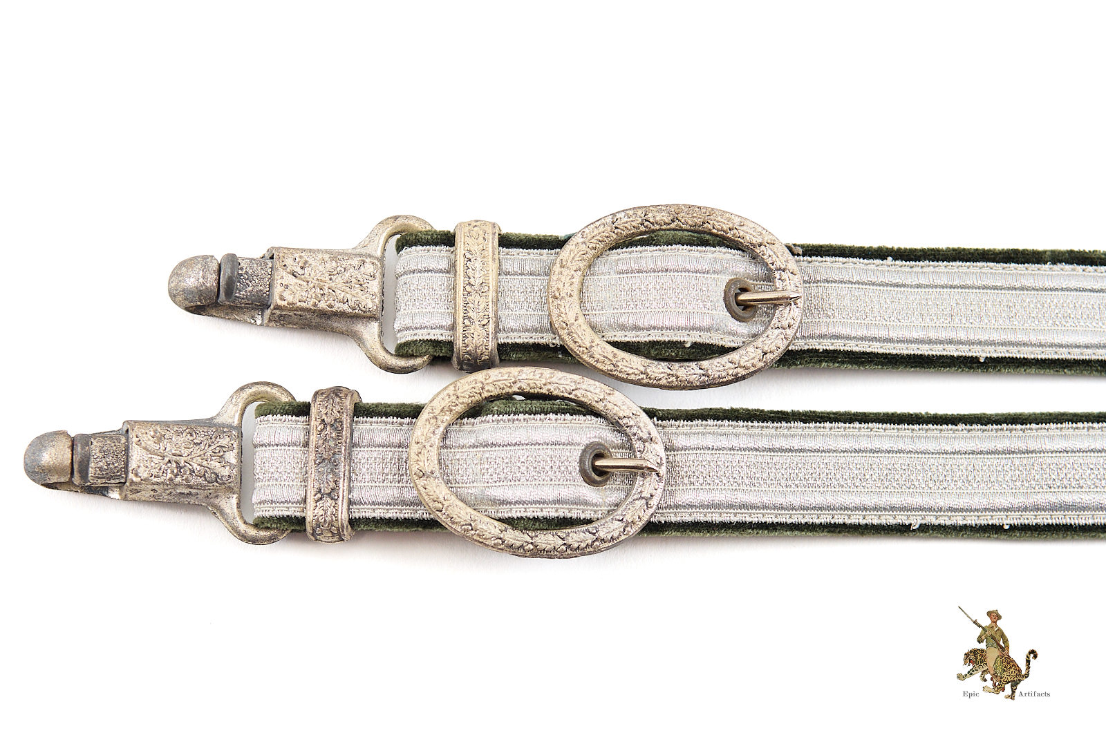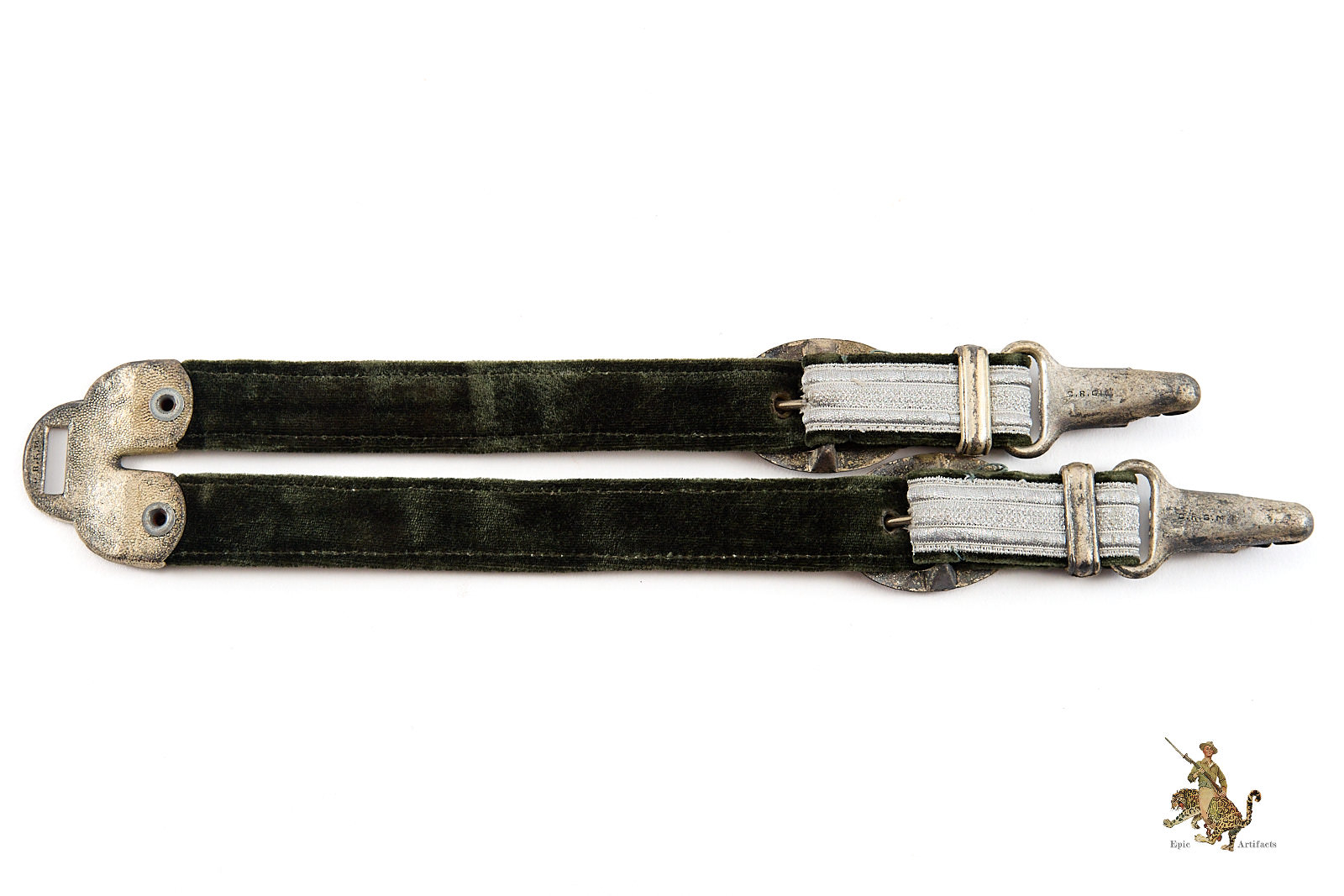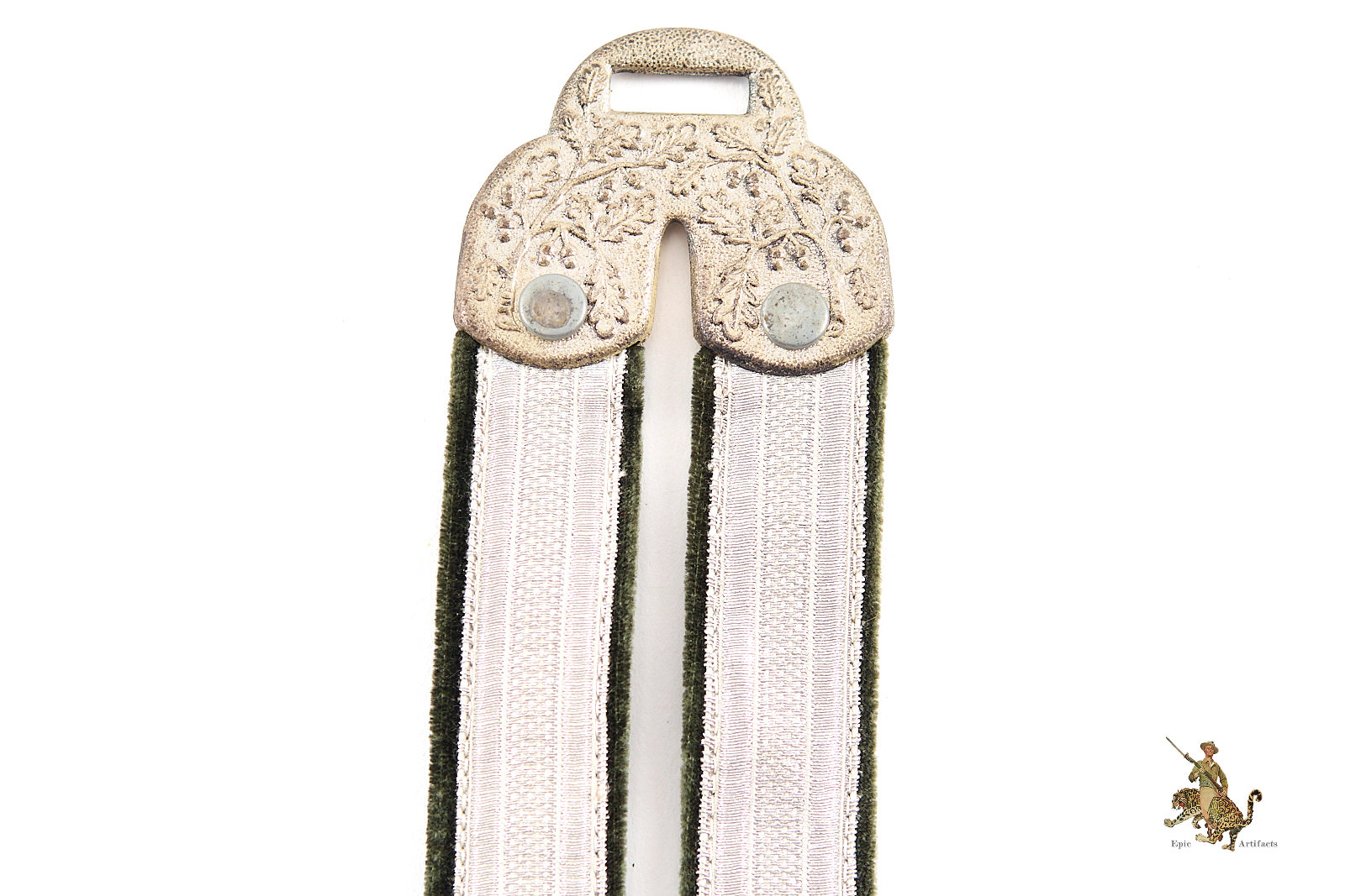 Product Description: These Deluxe Heer Dagger Horseshoe Hangers are an outstanding set, that would be perfect for completing a top quality dagger. They are nicely worn, with a great look. The woven aluminum wire brocade is completely intact, showing little to no wear. They are backed with velvet, which retains its original surface with a smooth nap. The metal fittings are made of zinc. The end of the hangers that would be affixed to a uniform features a D.R.G.M. marked fitting for attachment to a spring clip. The brocade and velvet hangers are fastened to this using deluxe horseshoe metal fittings, riveted in place, with stamped oak leaf ornamentation; these are also D.R.G.M. marked indicating a Reich protected design. At the other end of the hangers, the buckles and the D.R.G.M. marked spring clips are intact and functional, with intricate detail intact. The finish has faded from the zinc in spots. These deluxe Heer dagger hangers are an interesting and very appealing set. The condition is near mint.