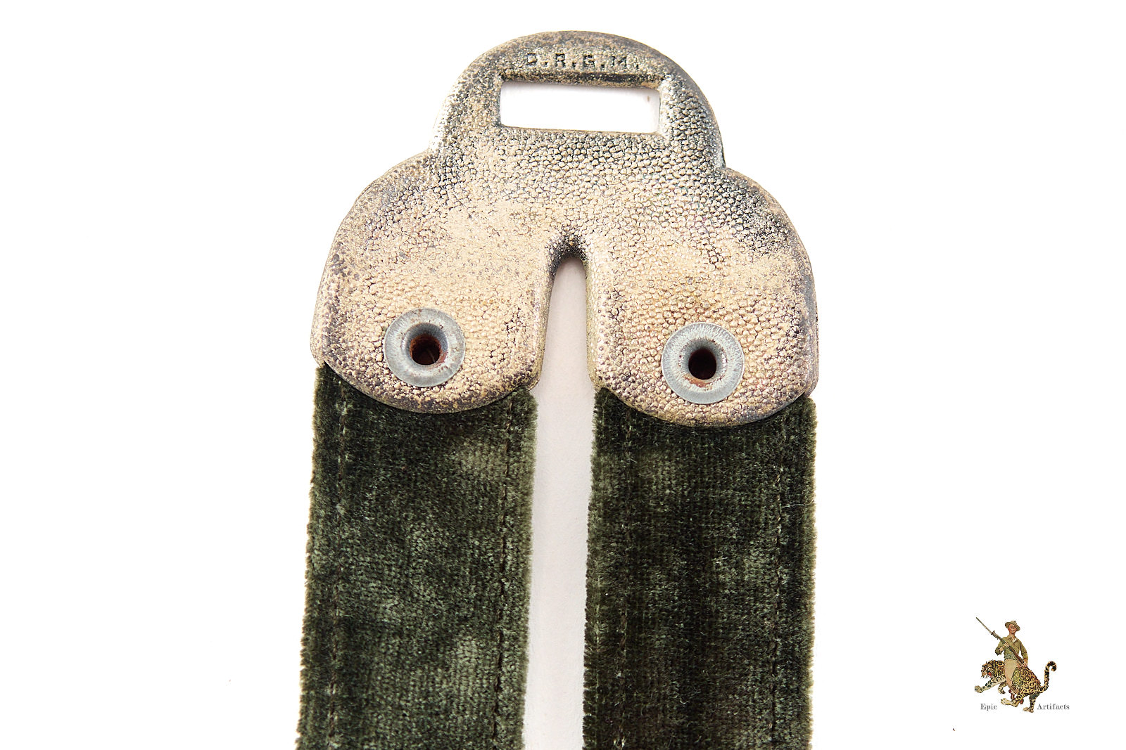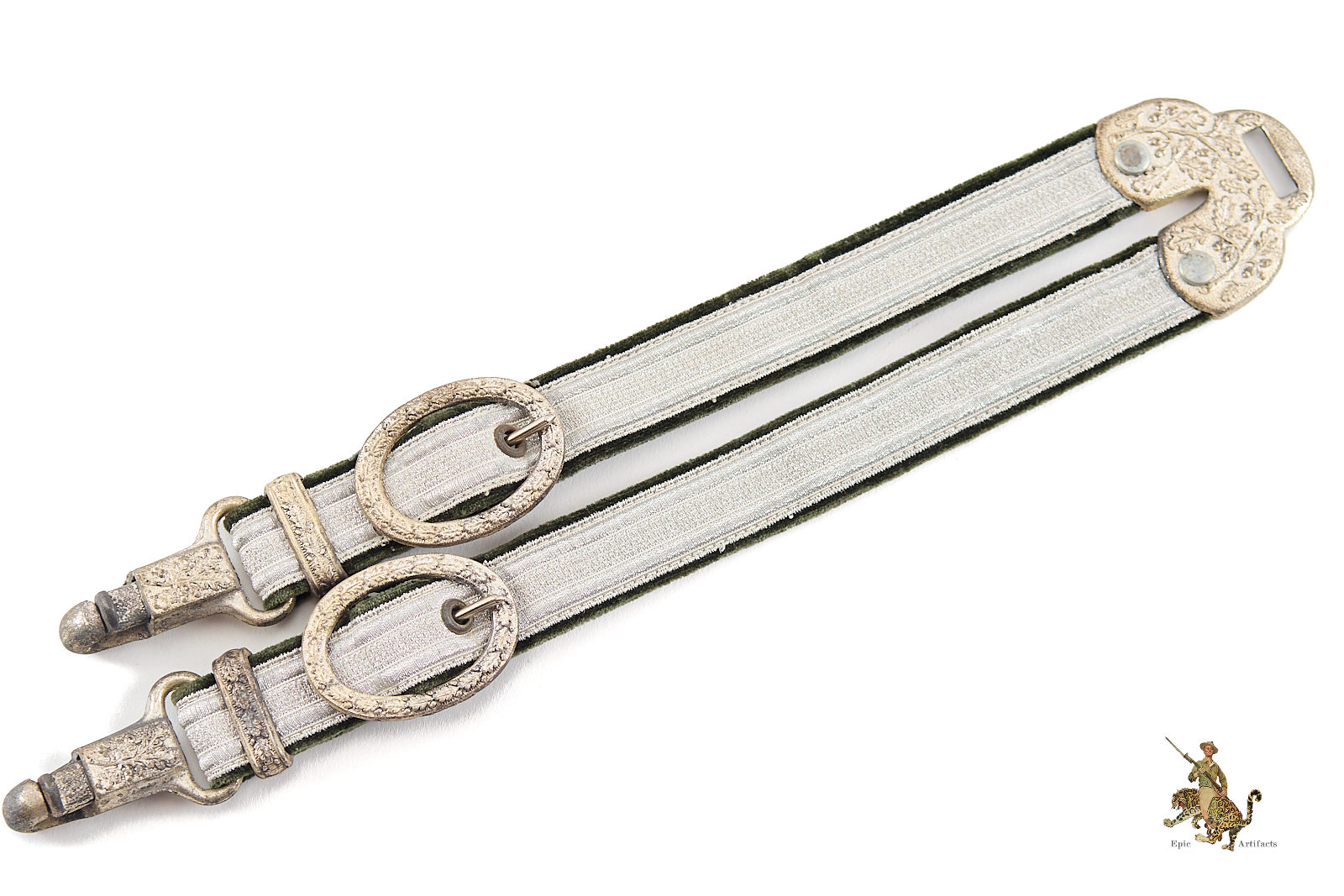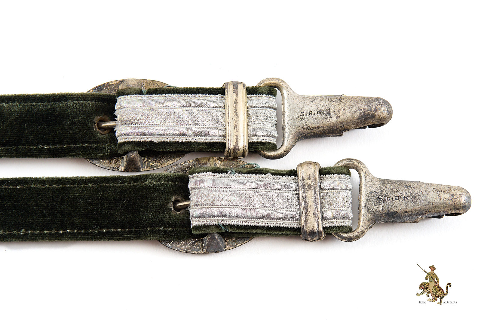 Product Description: These Deluxe Heer Dagger Horseshoe Hangers are an outstanding set, that would be perfect for completing a top quality dagger. They are nicely worn, with a great look. The woven aluminum wire brocade is completely intact, showing little to no wear. They are backed with velvet, which retains its original surface with a smooth nap. The metal fittings are made of zinc. The end of the hangers that would be affixed to a uniform features a D.R.G.M. marked fitting for attachment to a spring clip. The brocade and velvet hangers are fastened to this using deluxe horseshoe metal fittings, riveted in place, with stamped oak leaf ornamentation; these are also D.R.G.M. marked indicating a Reich protected design. At the other end of the hangers, the buckles and the D.R.G.M. marked spring clips are intact and functional, with intricate detail intact. The finish has faded from the zinc in spots. These deluxe Heer dagger hangers are an interesting and very appealing set. The condition is near mint.