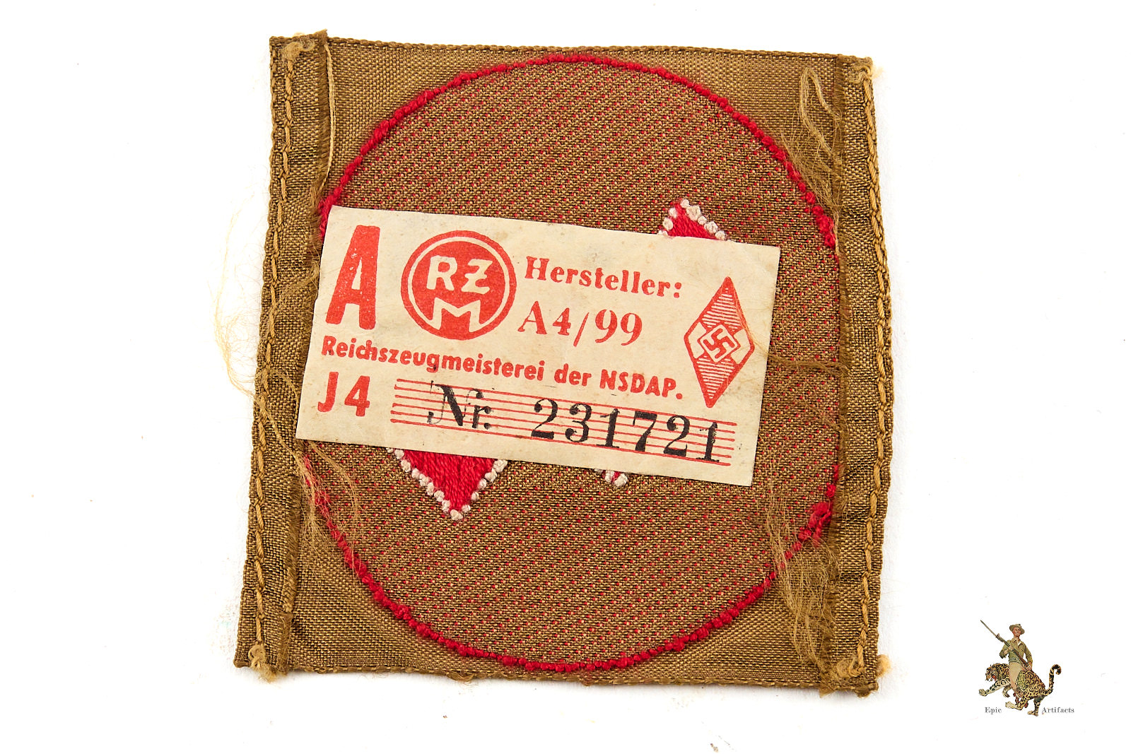 Product Description: The DJ Sigrune Sleeve Badge with RZM Tag is must have for any DJ collector. A machine woven, white Sigrune on a red oval field beyond which may be seen its tan rayon backing. Two edges have been folded over and stitched together. It measures approximately 3 1/2 inches wide and tall. Deutsches Jungvolk DJ sigrune sleeve badge were worn on the left sleeve. It is in near perfect condition. This DJ Sigrune badge retains the original RZM tag with code A4/99. Please note that in the reference photo the other colors and what they were to signify.