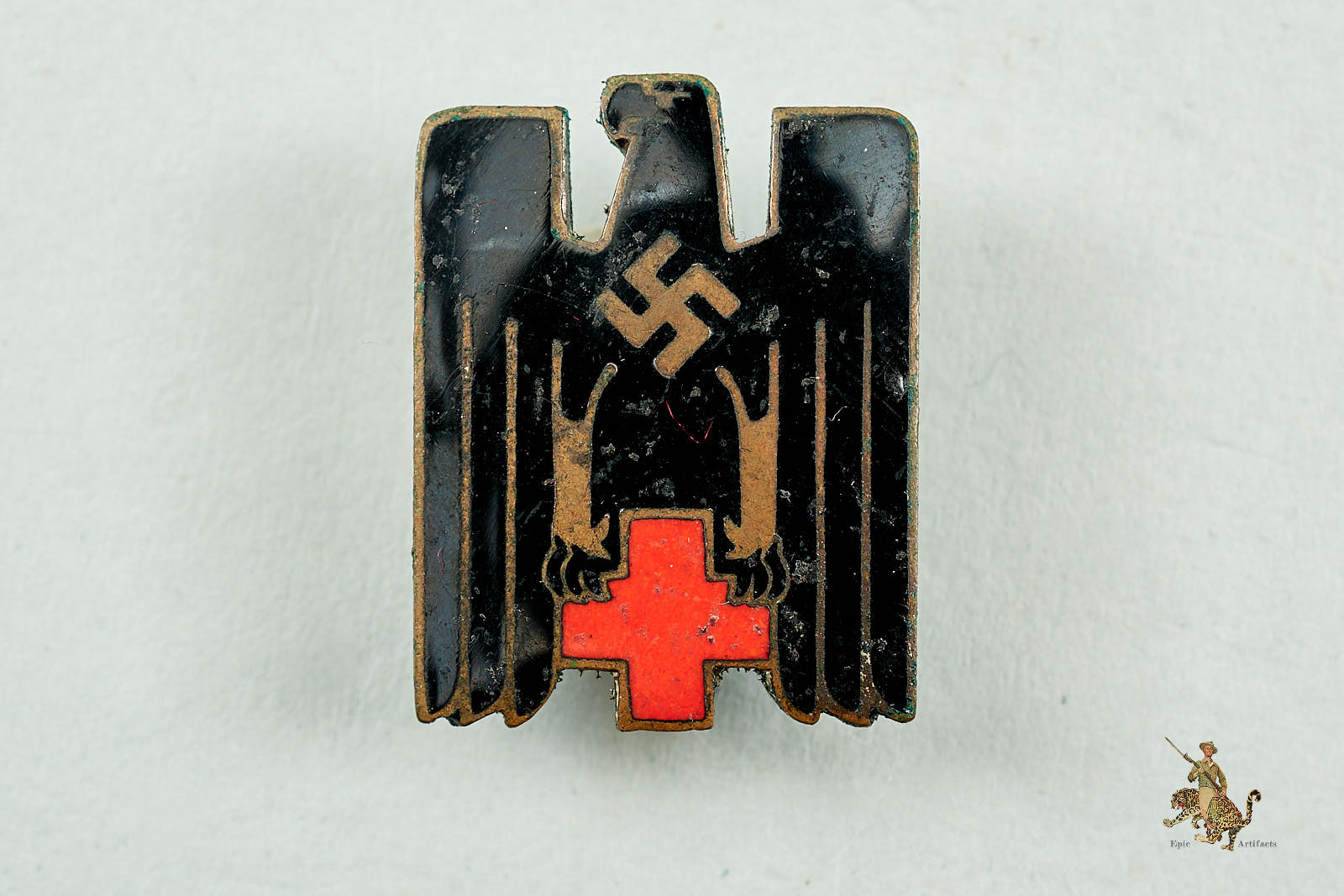 Product Description: A fine and well-preserved example of the DRK German Red Cross Cap Eagle, manufactured to a high standard and intended for wear on the headgear of personnel serving in the Deutsches Rotes Kreuz during the Third Reich period. Crafted from quality materials, the obverse features smooth black and red enamel with strong color retention. Minor surface scratching and light wear are present but do not detract from overall presentation. The eagle motif remains crisp and well-defined. The obverse silver finish is worn away revealing the tombak undertones.