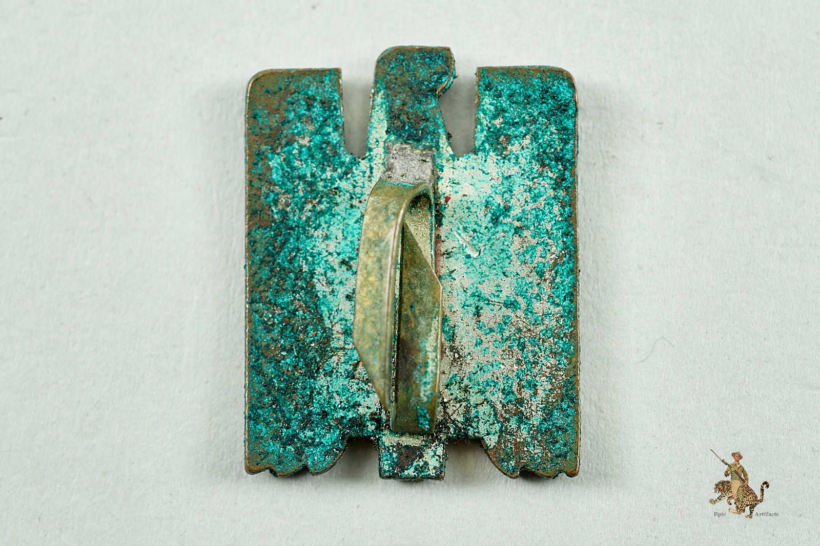 The reverse is flat and retains traces of the original silver finish, exhibiting typical age toning and oxidation. The original two-prong attachment remains firmly affixed, with no evidence of repair or alteration.