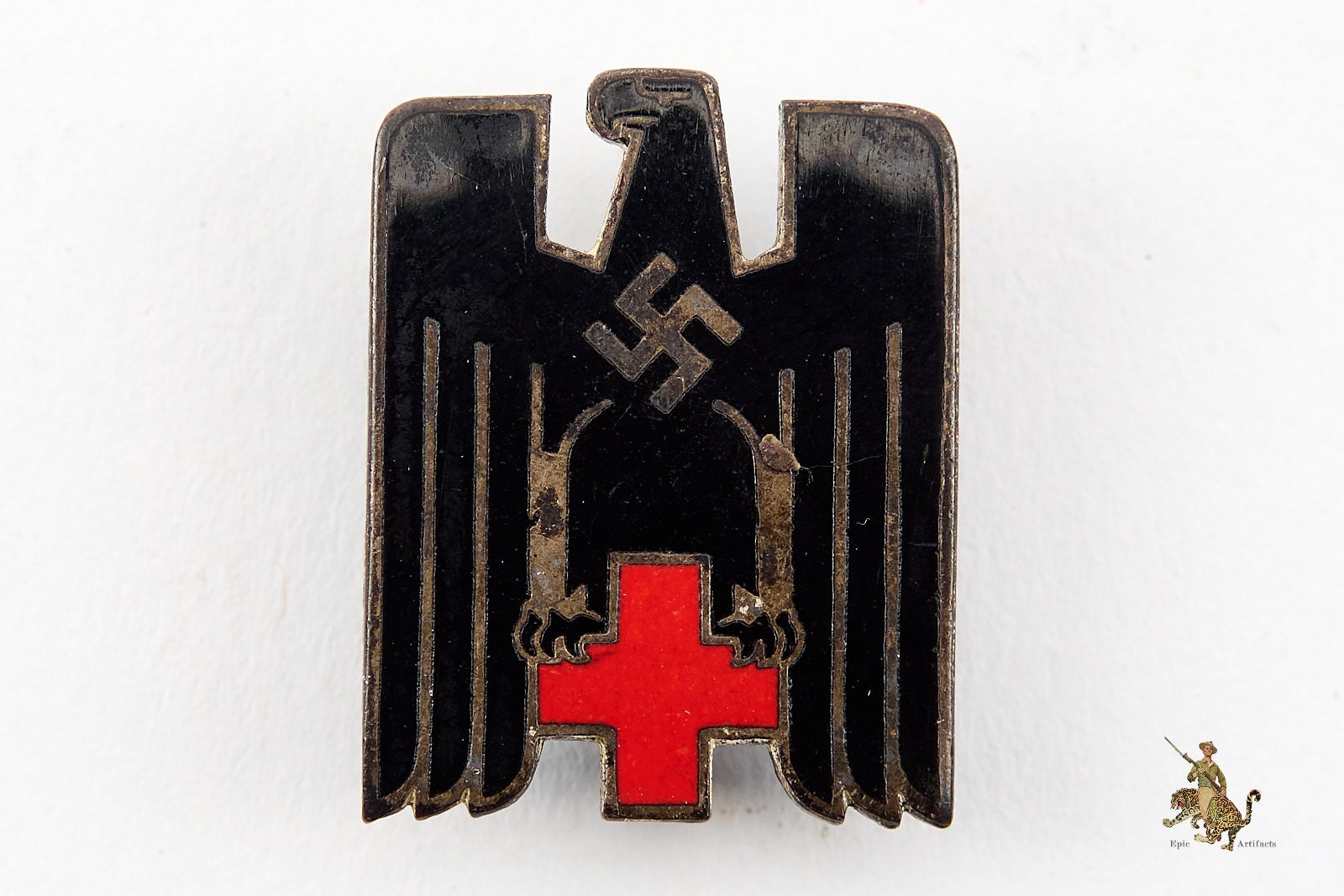 Product Description: A fine and well-preserved example of the DRK German Red Cross Cap Eagle, manufactured to a high standard and intended for wear on the headgear of personnel serving in the Deutsches Rotes Kreuz during the Third Reich period. Crafted from quality materials, the obverse features smooth black and red enamel with strong color retention. Minor surface scratching and light wear are present but do not detract from overall presentation. The eagle motif remains crisp and well-defined.