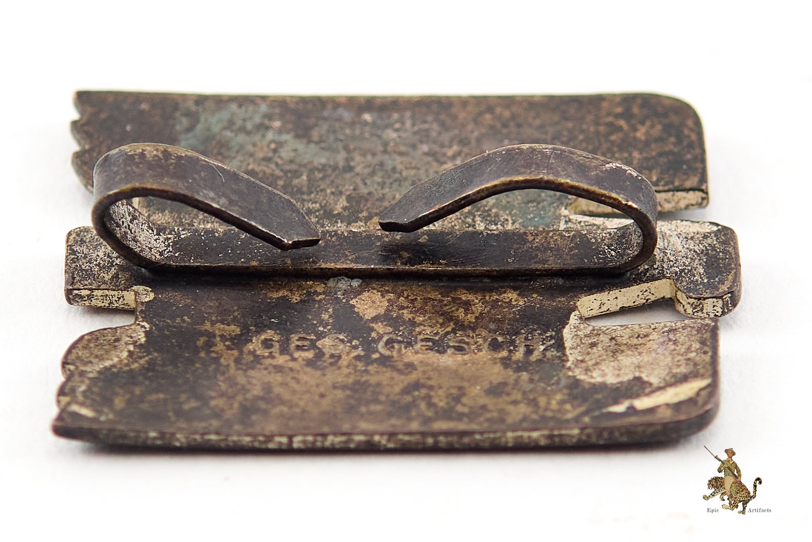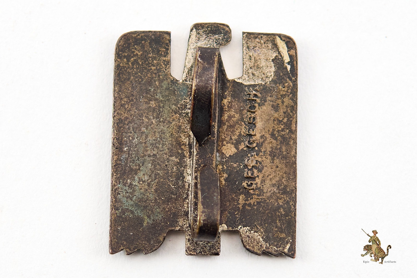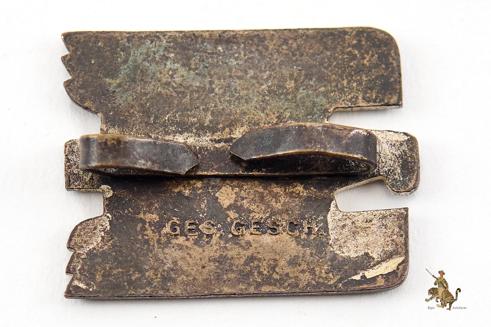 The reverse is flat and retains traces of the original silver finish, exhibiting typical age toning. The original two-prong attachment remains firmly affixed, with no evidence of repair or alteration. The badge is clearly marked “Ges. Gesch.”, indicating a legally protected design under German law.