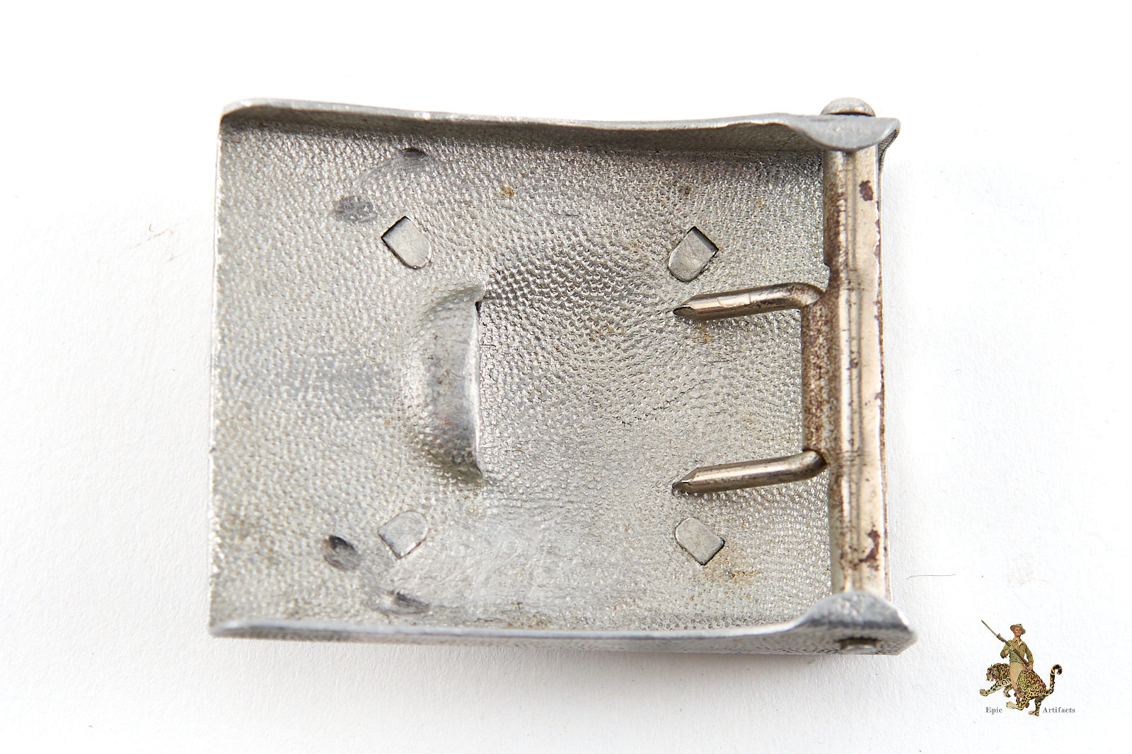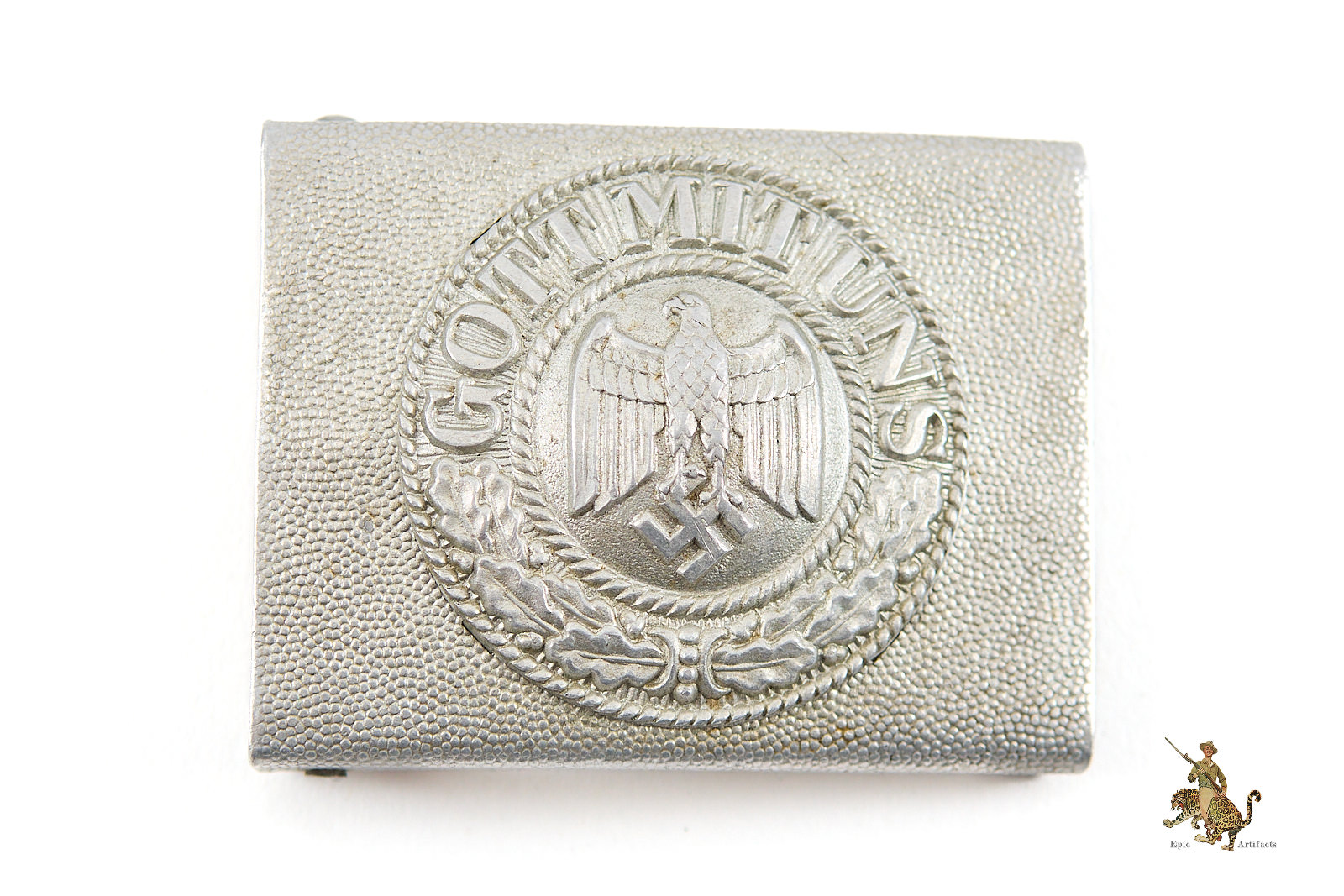 Historical Description: The belt buckle was an important part of the regalia worn by all uniformed military, civil, political, and paramilitary organizations during the Third Reich. The belt (“Koppel”) was part of the uniform and would always be worn while on duty. The belt buckle (“Koppelschloss”) was generally specific to each organization, with many organizations having separate belt buckles for officers and for enlisted personnel, sometimes with different colors and finishes to further denote specific purposes. The buckles were adorned with various mottos and designs specific to the organizations for which they were intended. Many designs used the German national eagle emblem, in a variety of forms. Belt buckles were worn with uniforms ranging from finely tailored officer parade uniforms, to the issue uniforms of enlisted soldiers in combat. Generally speaking, most German belt buckles of the Third Reich were made with two prongs on the reverse, to allow the buckle to be worn and adjusted on a belt. The buckle had a catch that would mate with a hook on the belt, when worn. The earliest Third Reich buckles were often made of brass, or nickel silver. Later, aluminum became very common, and was used on private purchase as well as enlisted buckles of the German military, with or without a painted or plated finish. After WWII began, most enlisted military buckles were steel. Nazi belt buckles were popular souvenirs for Allied troops who served in Europe. Some types were made by the millions and remain quite common today. Others were made in limited numbers and are very rare.