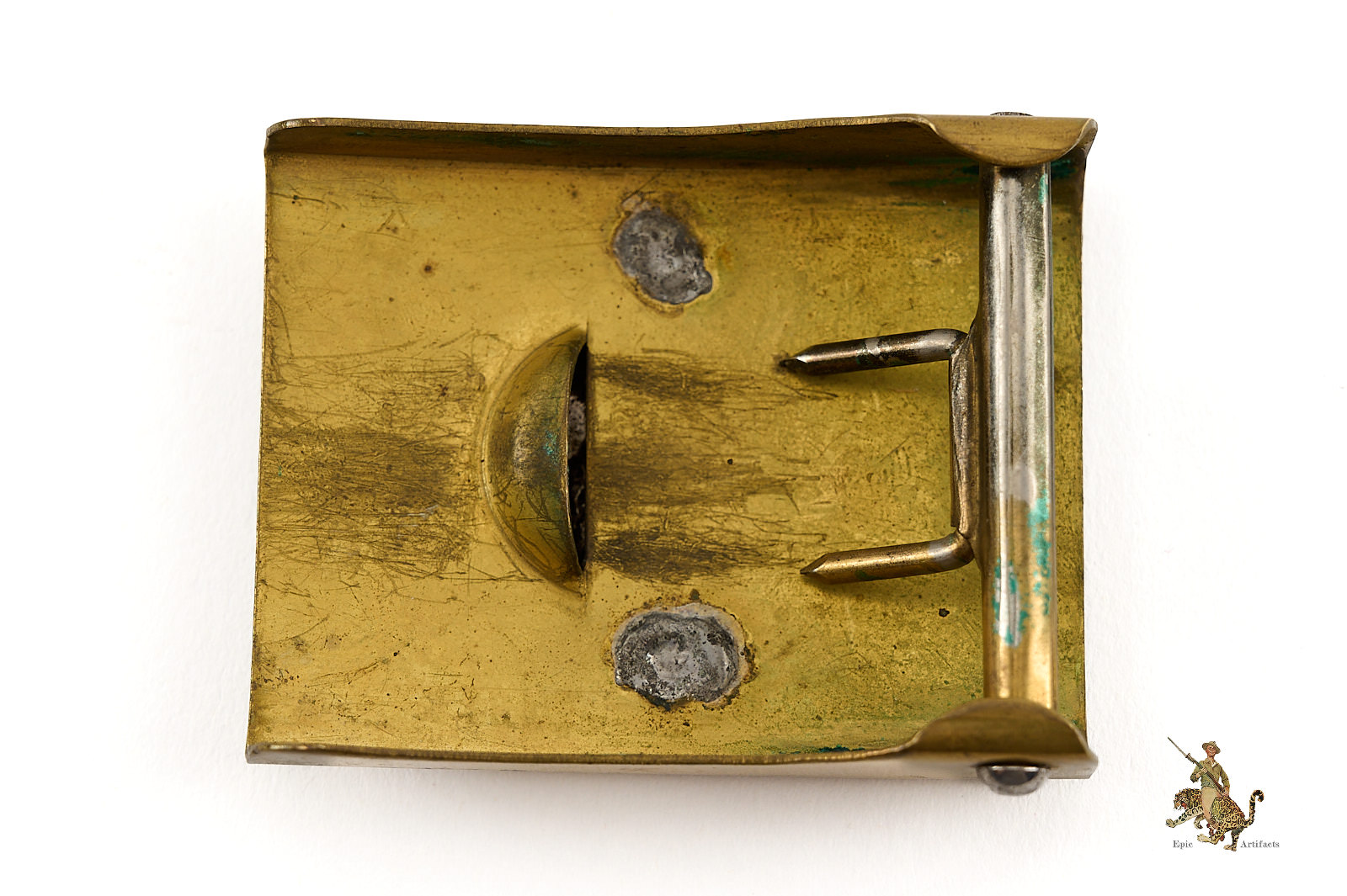 Historical Description: The belt buckle was an important part of the regalia worn by all uniformed military, civil, political and paramilitary organizations during the Third Reich. The belt (“Koppel”) was part of the uniform and would always be worn while on duty. The belt buckle (“Koppelschloss”) was generally specific to each organization, with many organizations having separate belt buckles for officers and for enlisted personnel, sometimes with different colors and finishes to further denote specific purposes. The buckles were adorned with various mottos and designs specific to the organizations for which they were intended. Many designs used the German national eagle emblem, in a variety of forms. Belt buckles were worn with uniforms ranging from finely tailored officer parade uniforms, to the issue uniforms of enlisted soldiers in combat. Generally speaking, most German belt buckles of the Third Reich were made with two prongs on the reverse, to allow the buckle to be worn and adjusted on a belt. The buckle had a catch that would mate with a hook on the belt, when worn. The earliest Third Reich buckles were often made of brass, or nickel silver. Later, aluminum became very common, and was used on private purchase as well as enlisted buckles of the German military, with or without a painted or plated finish. After WWII began, most enlisted military buckles were steel. Nazi belt buckles were popular souvenirs for Allied troops who served in Europe. Some types were made by the millions and remain quite common today. Others were made in limited numbers and are very rare.