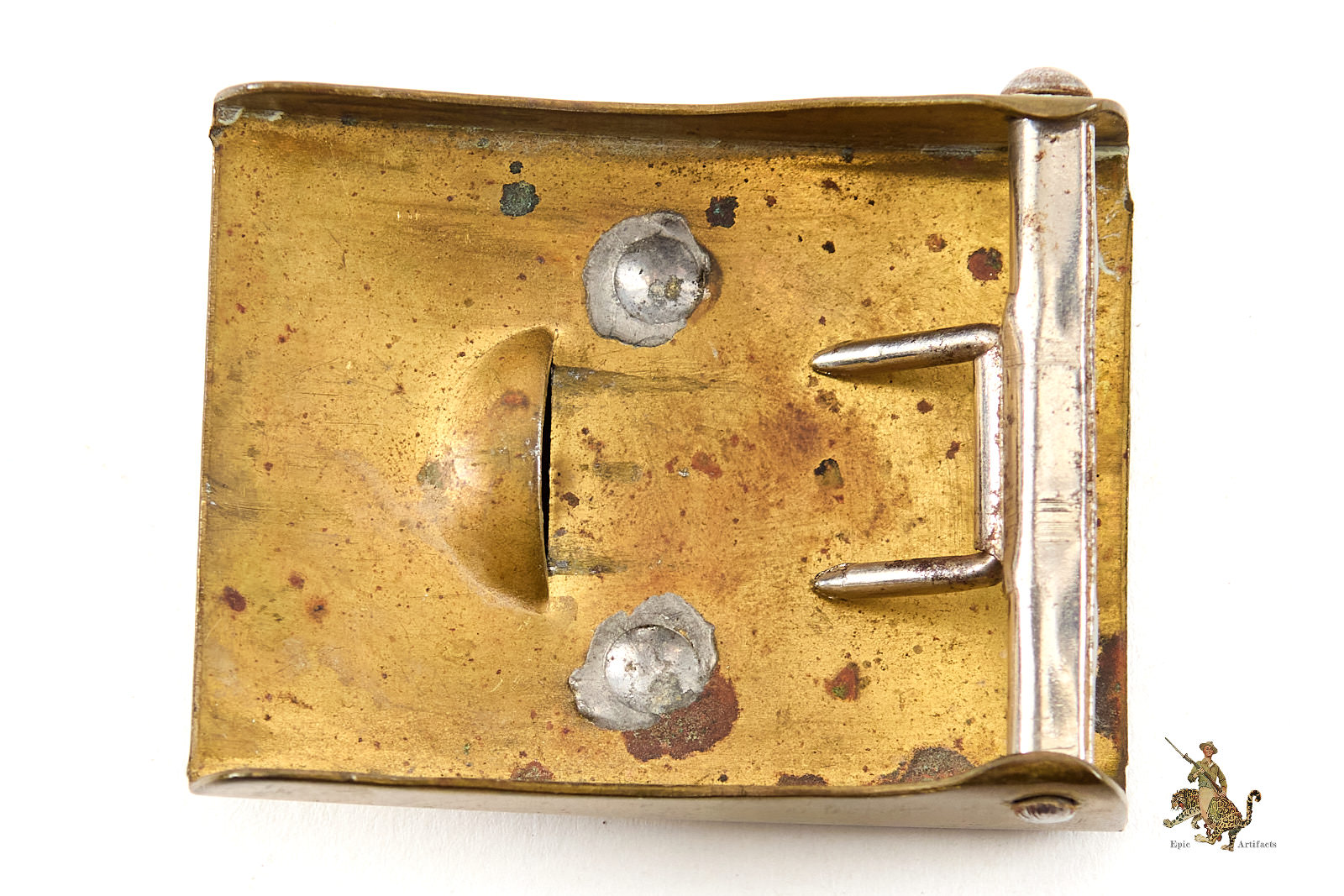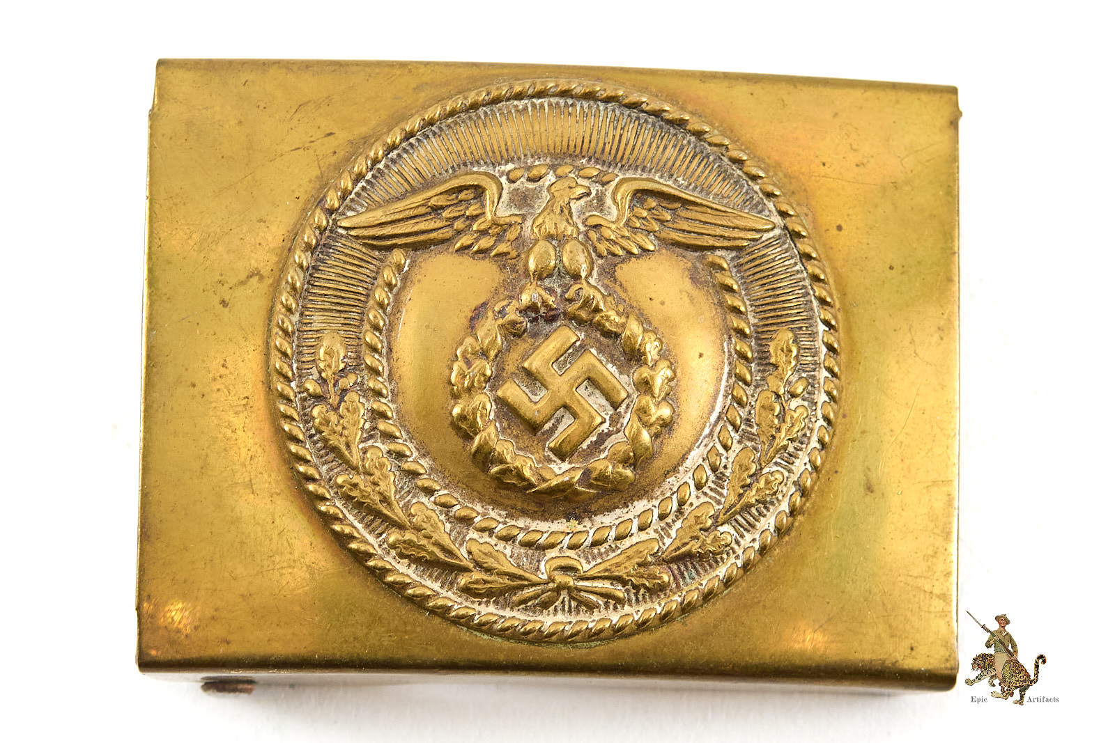 Product Description: This Early Brass SA/HJ Buckle is a choice, untouched piece. It’s a textbook two-piece buckle. The body of the buckle and the separately applied SA eagle and swastika roundel are both made of brass. All of the original fine detail is intact, and the bare brass shows lovely, uncleaned patina. The reverse of this early brass SA buckle is flat and unmarked, as is typical for these. The two solder joints used to affix the roundel to the buckle body are intact, with no issues. There are some light scratches near the integral catch that show that this buckle was worn on a belt in the past. The roller bar and prongs assembly is made of brass, and remains functional. This buckle has a great look, and remains in excellent condition.