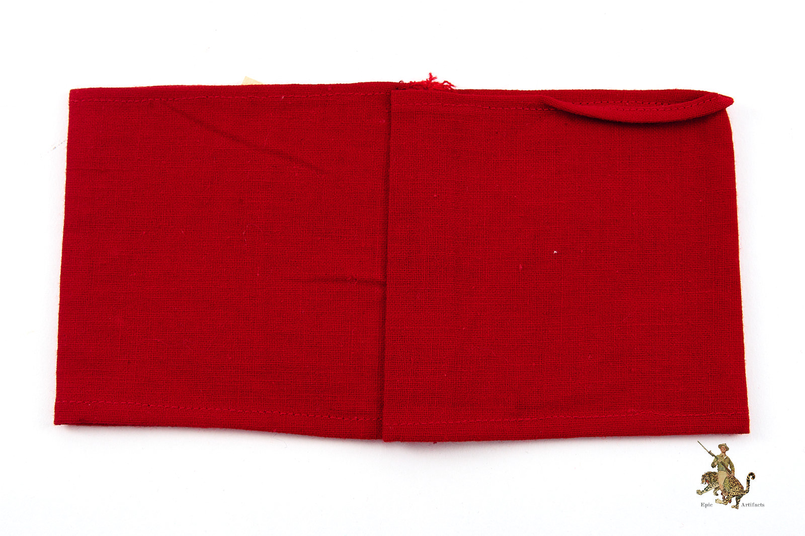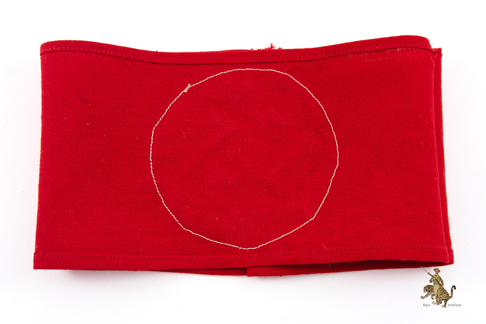 Product Description: An original Early Cotton Three Piece NSDAP Armband, presented here as an exemplary textbook specimen distinguished by clear evidence of period wear and strong visual character. Crafted from high-quality red cotton, the armband displays a separately applied white cotton roundel bearing a precisely executed black cotton swastika, each element neatly machine-stitched to the body. Both upper and lower edges are cleanly finished, with the ends joined by machine stitching consistent with recognized period construction.