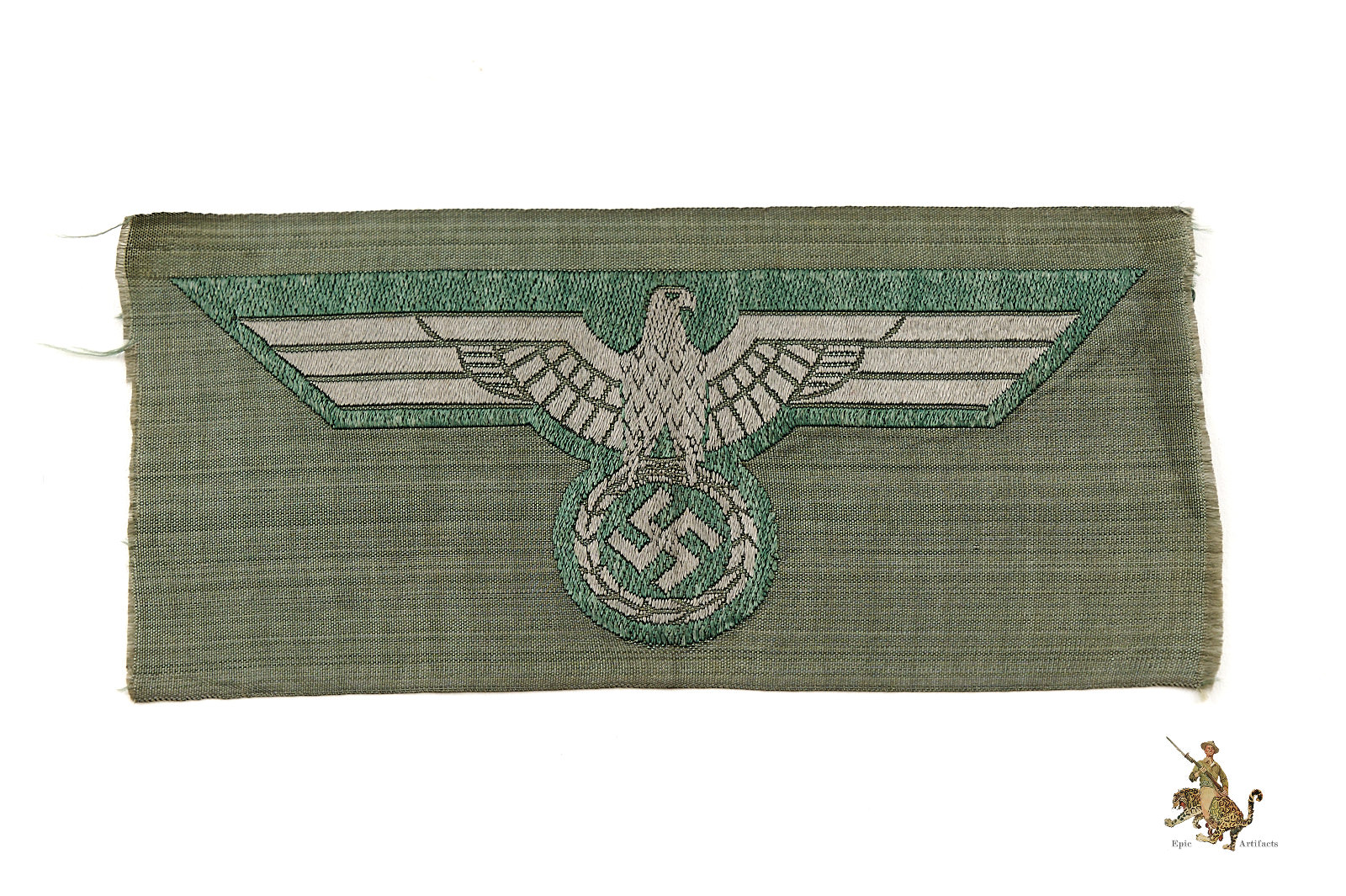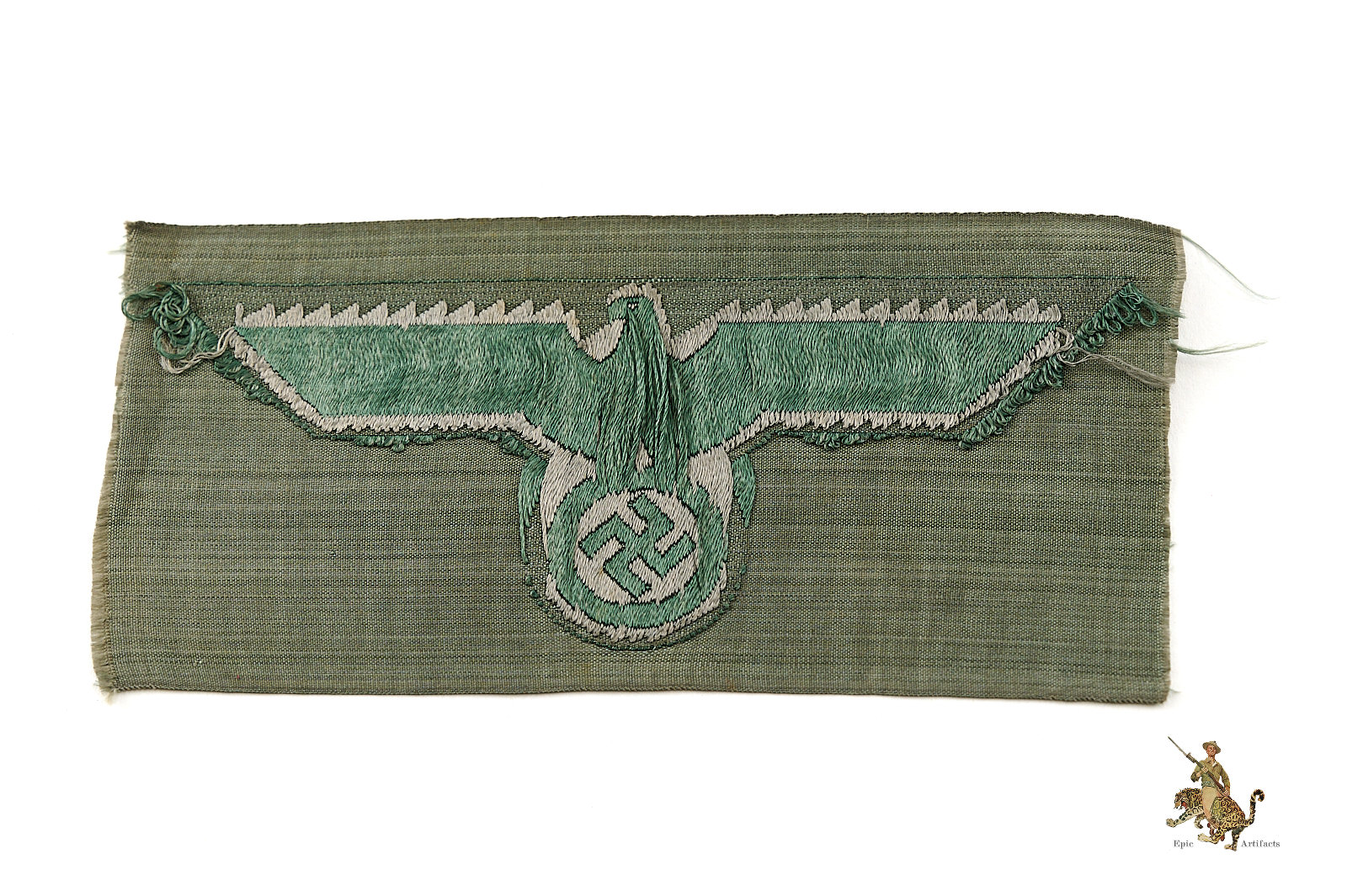 Historical Description: The German Armed Forces (Wehrmacht), as formed in 1935, and as they existed until the end of World War 2, consisted of the Army (Heer), the Air Force (Luftwaffe) and the Navy (Kriegsmarine). The Waffen-SS fell under the command of the Wehrmacht during the war. Each of these branches of service had a unique eagle design that was worn on both the formal dress and parade uniforms, and the field uniforms, of the members of that branch. These eagles were worn on soft headgear, including service and field caps, as well as on the uniform jacket. In the Heer, the Luftwaffe, and the Kriegsmarine, this eagle was worn on the chest of the tunic; collectors have termed these “breast eagles.” The Heer and the Luftwaffe generally used the same eagle style, though variations in color of the eagle or the backing distinguish between the two. The Luftwaffe used their own flying eagle emblem. The Waffen-SS sleeve eagle (and cap eagle) had wings that came to a distinctive tapered point. The cap, breast and sleeve eagles used by the various military branches were manufactured in many variations. There were machine-woven and machine embroidered versions, usually used by officers and NCOs. Hand-embroidered bullion wire eagles were typically for officers. There were metal eagles, for caps, or for uniforms that were intended to have detachable insignia. There were even eagles embroidered on camouflage fabric, intended for use on special field uniforms. There were also eagles in specific colors for use on tropical uniforms. Some of these eagles were mass-produced, and are still common today; others were and are very rare.</