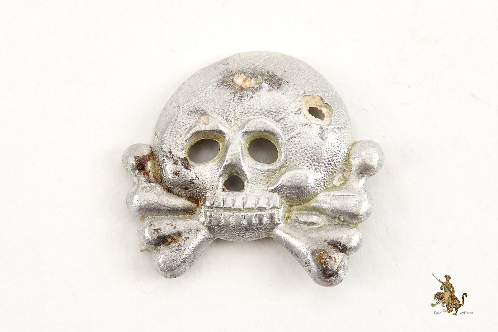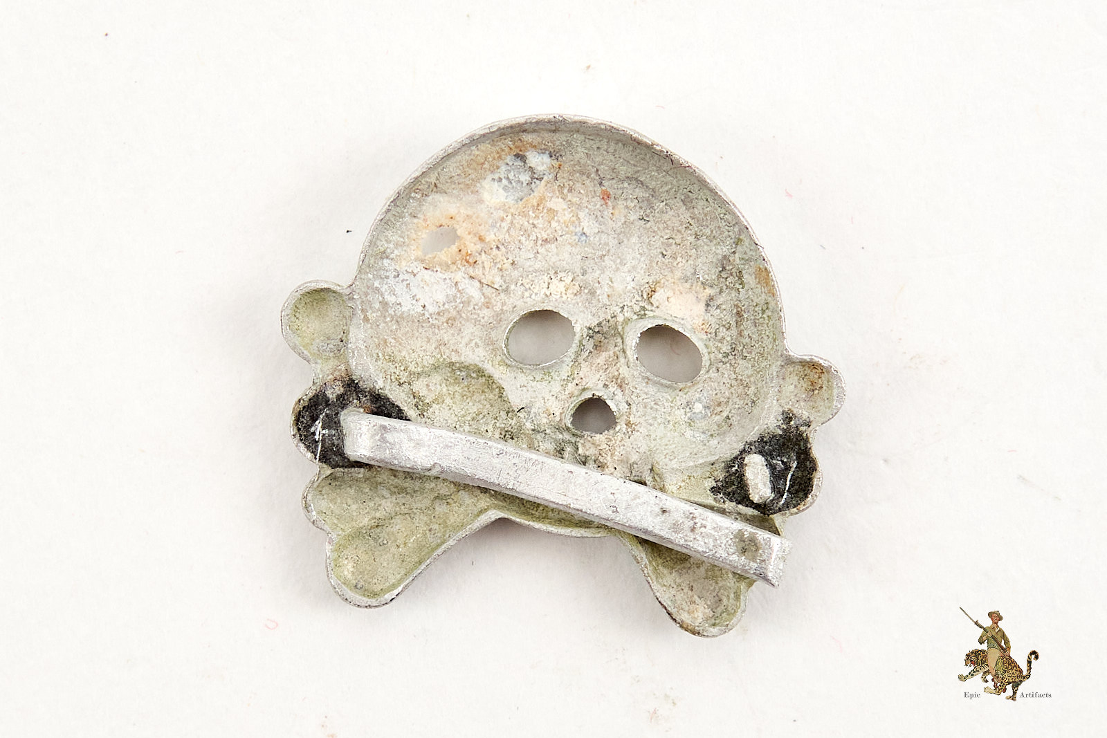 Product Description: An original Early Panzer Skull Collar Tab Insignia, die-struck in fine detail, featuring the classic Panzer skull motif with crossed bones. This example retains one original prongs firmly intact. This example has some corrosion causing creating holes and pitting wear to obverse, but most of the sharp definition to facial contours and bone structure remain. The reverse bears no maker’s mark, consistent with wartime field-issued variants. This insignia would have adorned the black wool collar tabs of a Panzer crewman’s tunic, symbolizing the elite armored divisions of the Wehrmacht. This Early Panzer Skull Collar Tab Insignia remains in excellent condition.