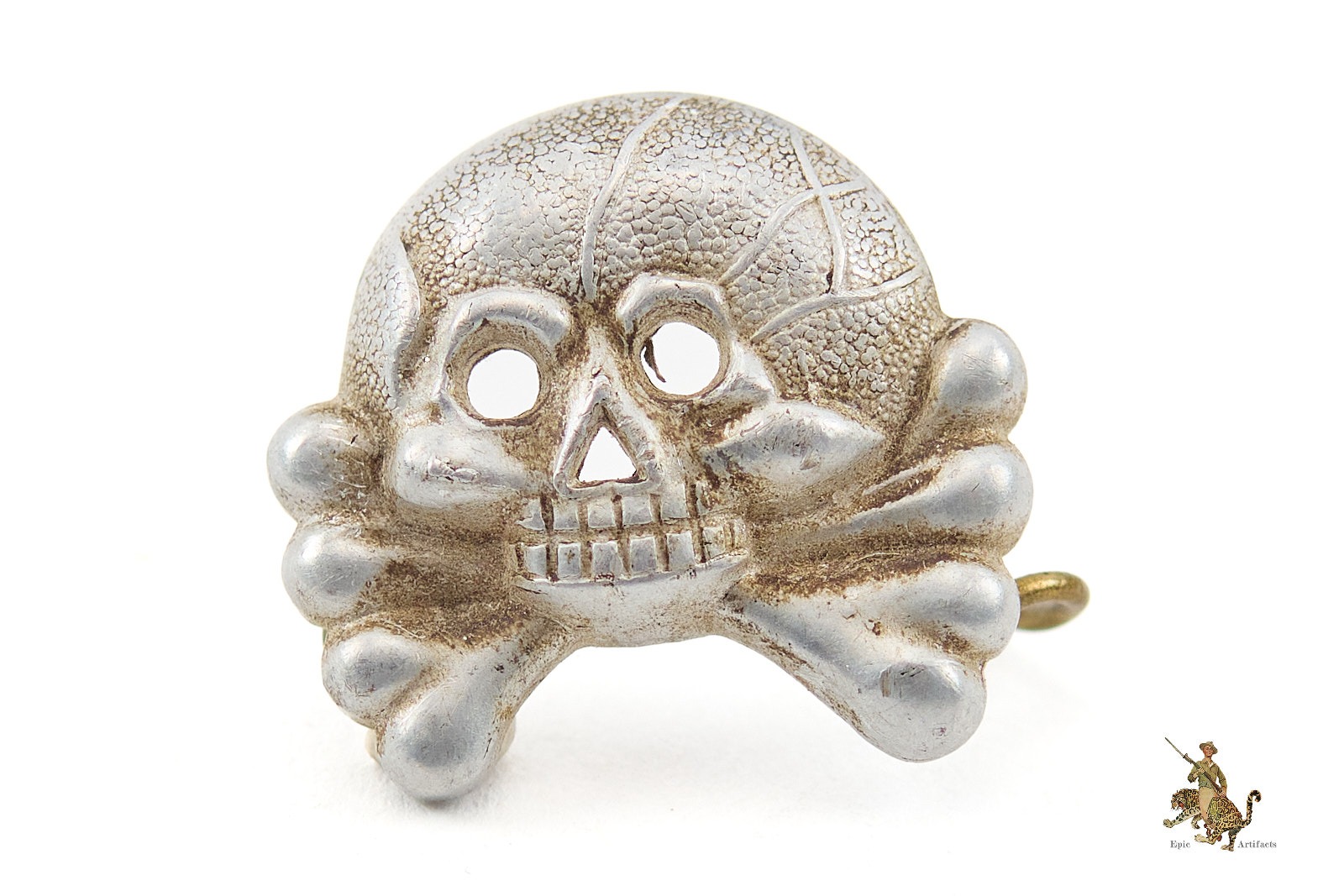 Product Description: An original Early Panzer Skull Collar Tab Insignia, die-struck in fine detail, featuring the classic Panzer skull motif with crossed bones. This example retains both original prongs firmly intact, with minimal wear to the raised surfaces and sharp definition to facial contours and bone structure. The reverse bears no maker’s mark, consistent with wartime field-issued variants. This insignia would have adorned the black wool collar tabs of a Panzer crewman’s tunic, symbolizing the elite armored divisions of the Wehrmacht. This Early Panzer Skull Collar Tab Insignia remains in excellent + condition.