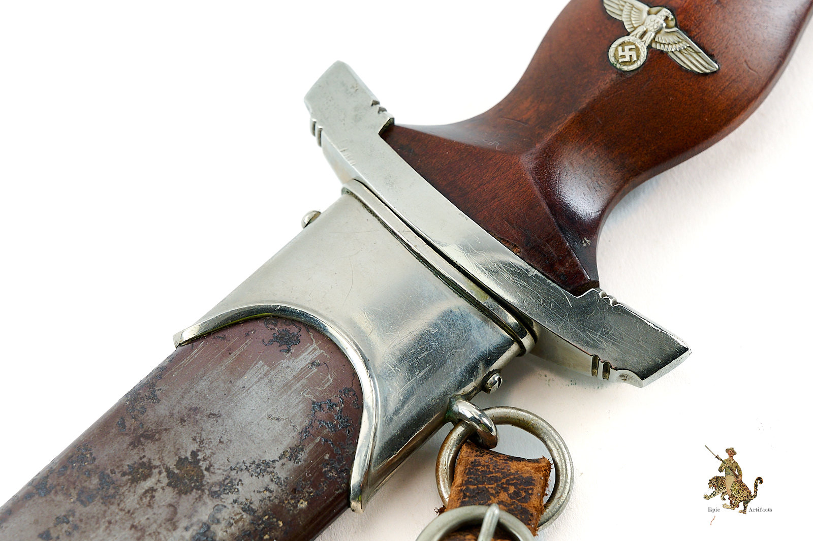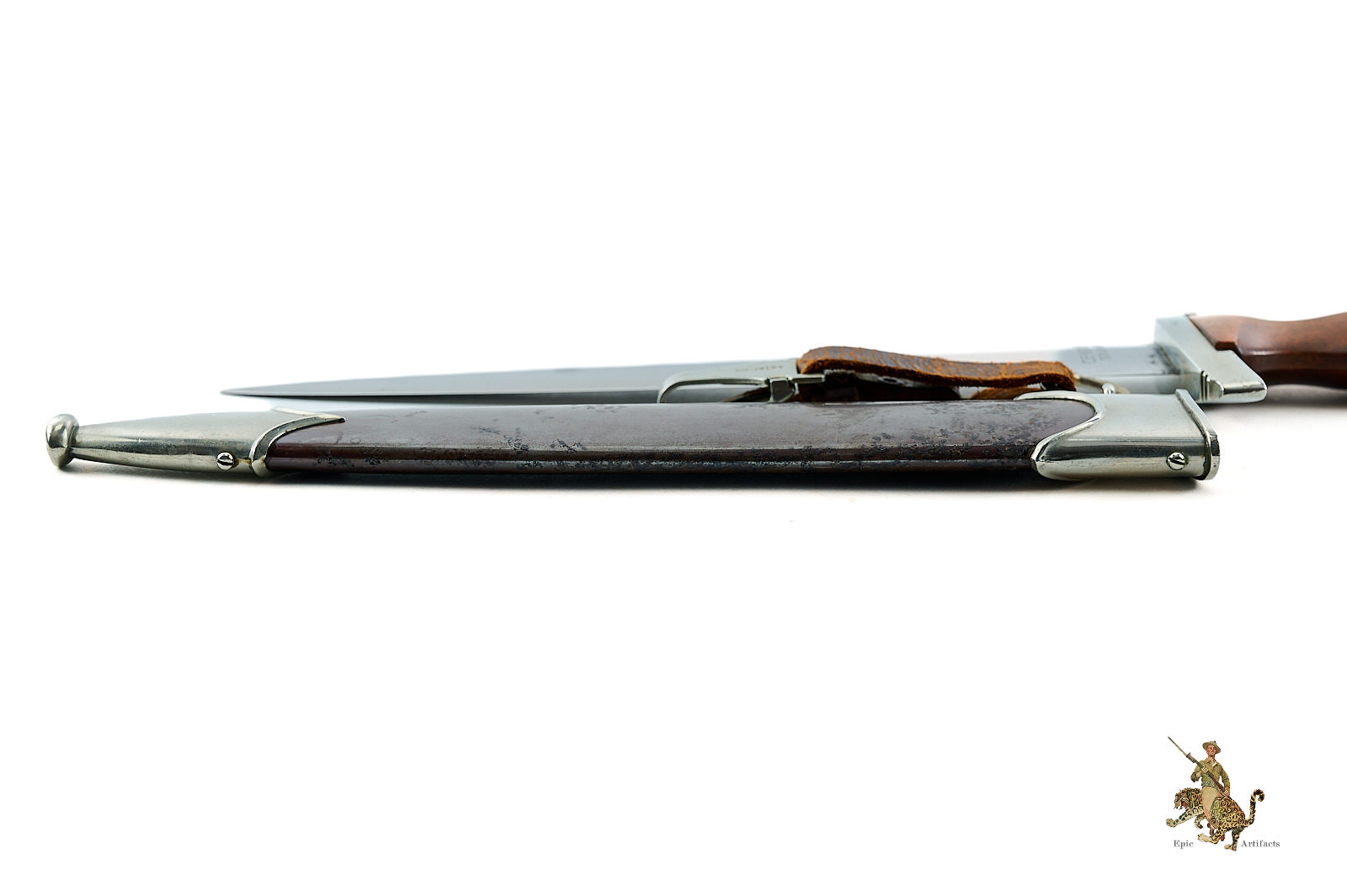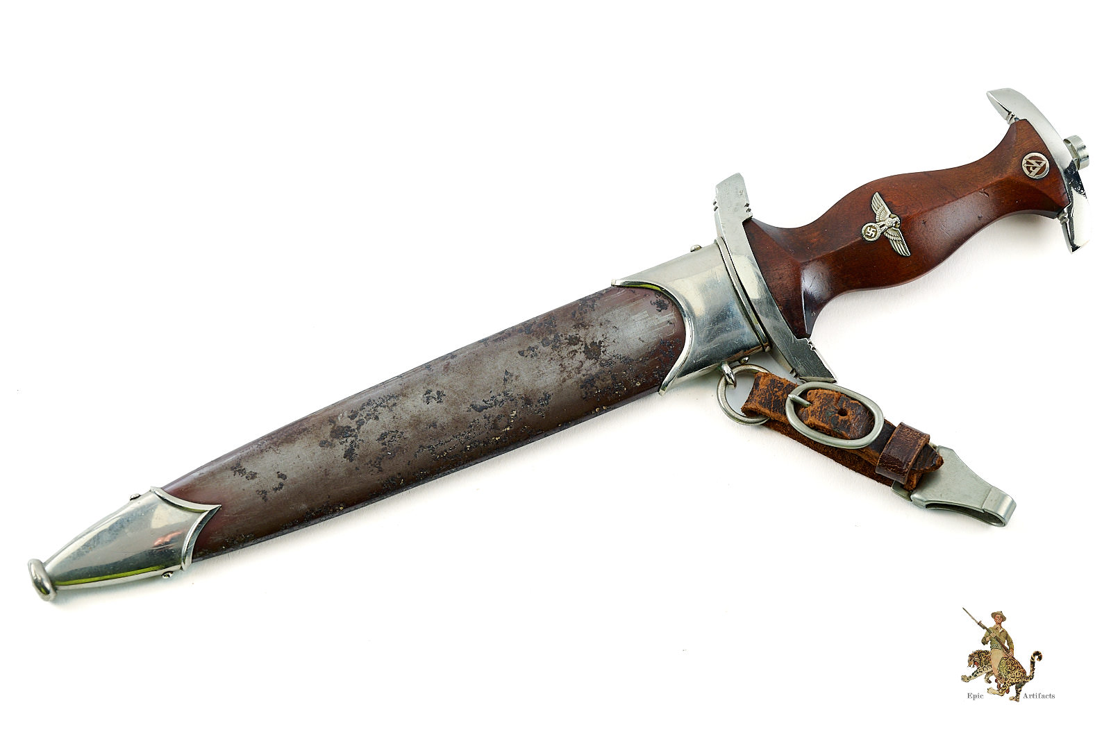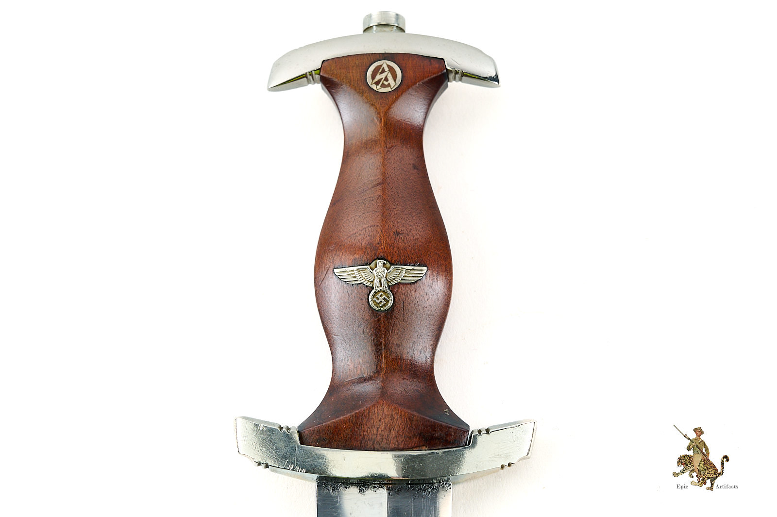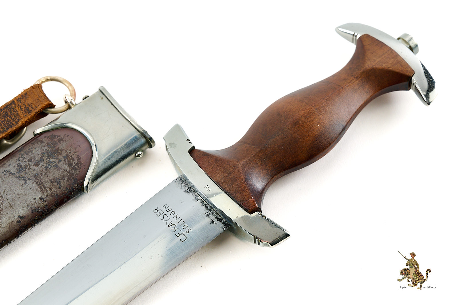 Product Description: An early M33 Sturmabteilung (SA) Dagger, produced by the Solingen maker C.F. Kayser. This Early SA Dagger – C.F. Kayser – Rare 9/10 reflects the early production quality of the pre-RZM era. This dagger is typical of early manufacture, featuring solid nickel fittings, a finely contoured hardwood grip, and a period blade, produced by an extremely rare maker that rates a 9/10 on the McSARR rarity list.