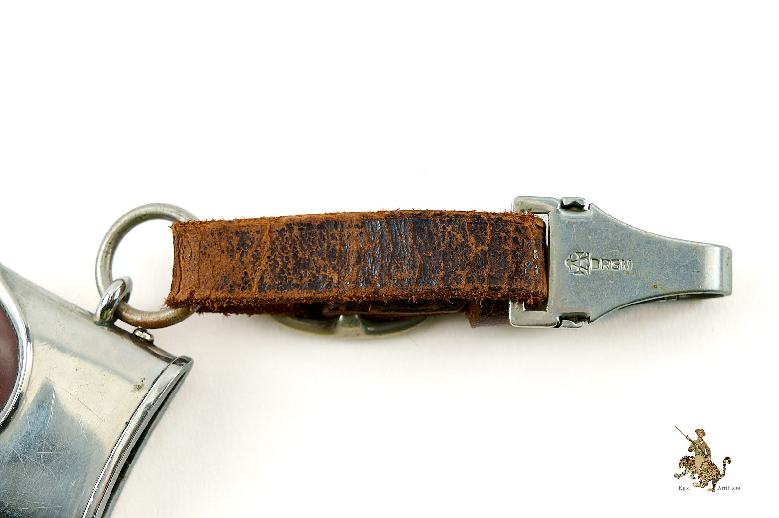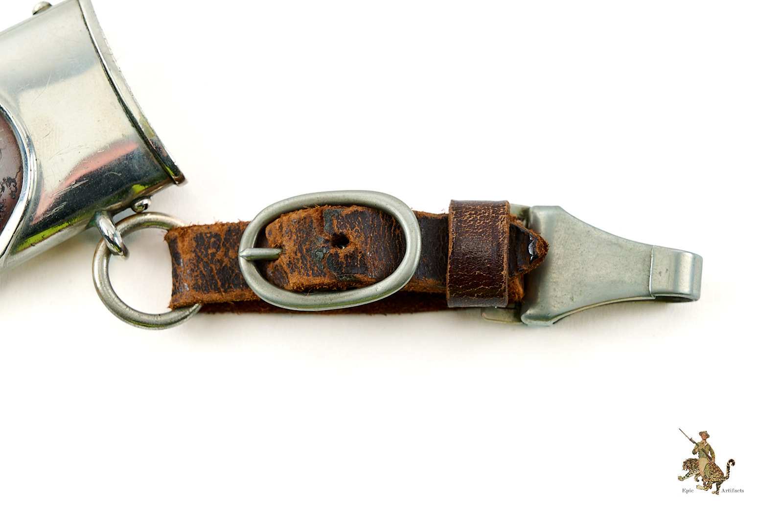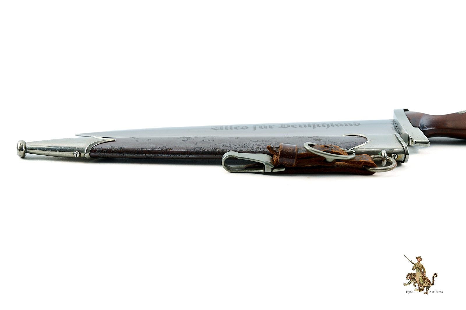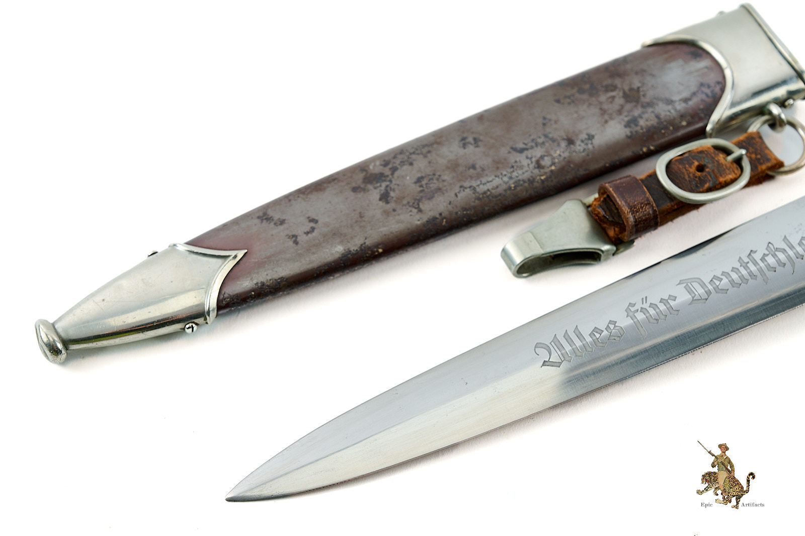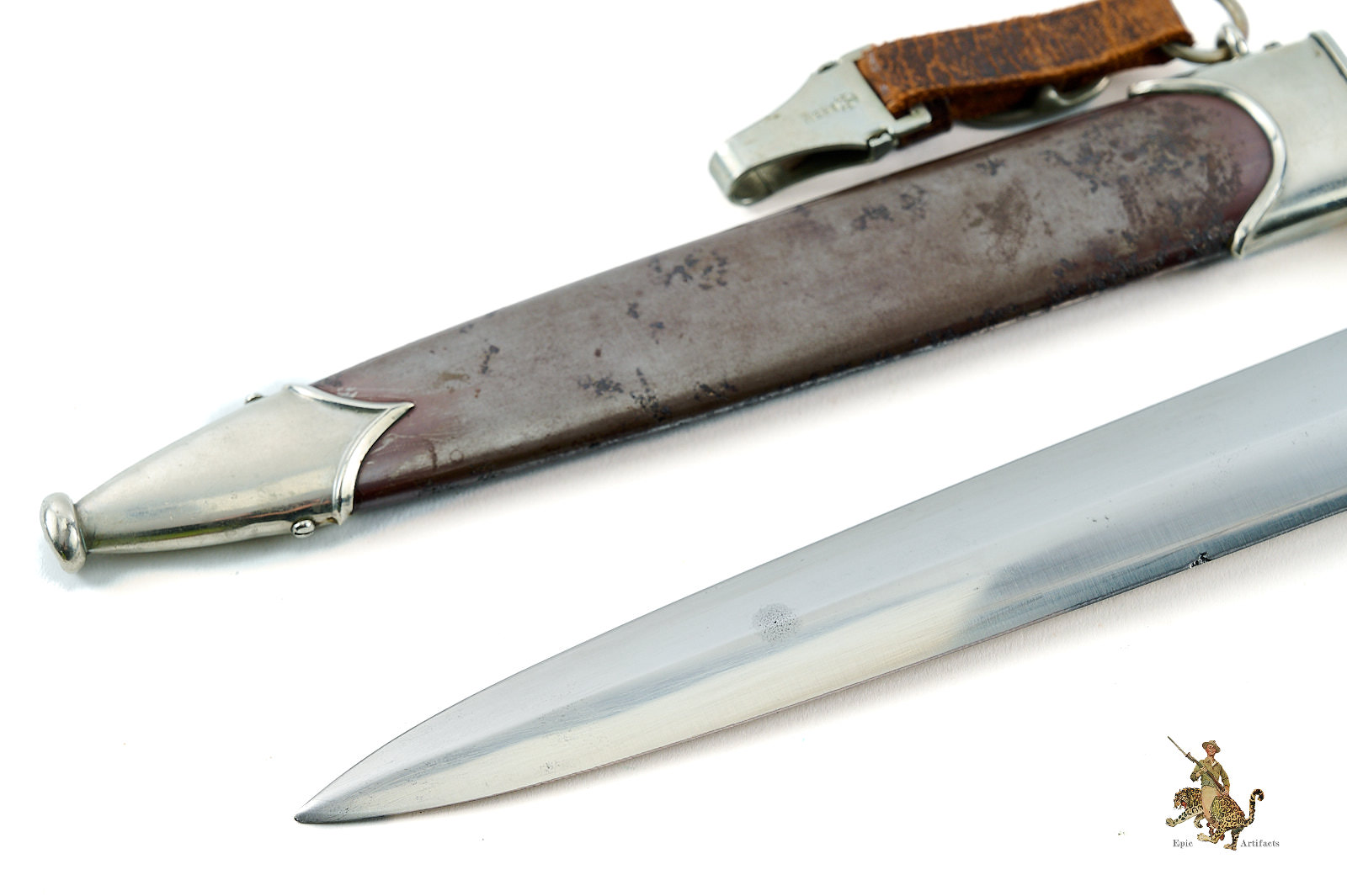 The original scabbard retains both screws to the upper and lower nickel fittings. The ball tip exhibits some denting, consistent with typical examples of this type. The scabbard body preserves areas of its original anodized finish, but shows some pitting and other corrosion both to the obverse and reverse. The original leather hanger is intact but shows some color loss and cracking.