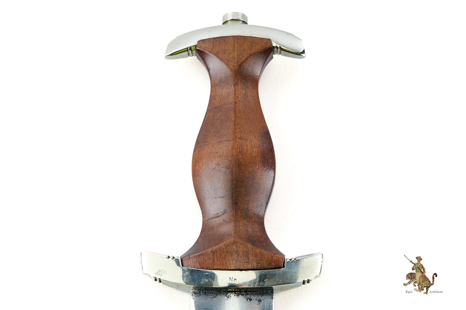The wooden grip is in very good condition, showing some minor chipping and wear, with a tight fit to the guards and undisturbed SA and national insignia. The T-nut and upper guard display honest wear and light tool marks, indicative of maintenance, but dagger retains an excellent fit.